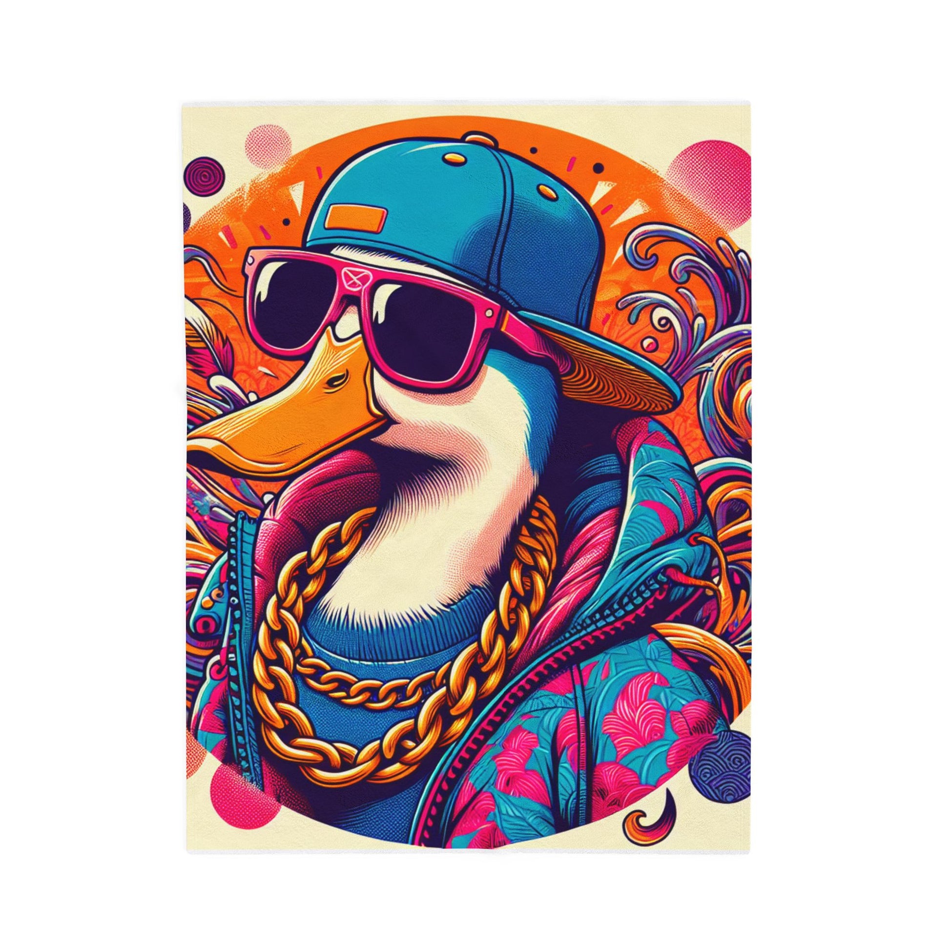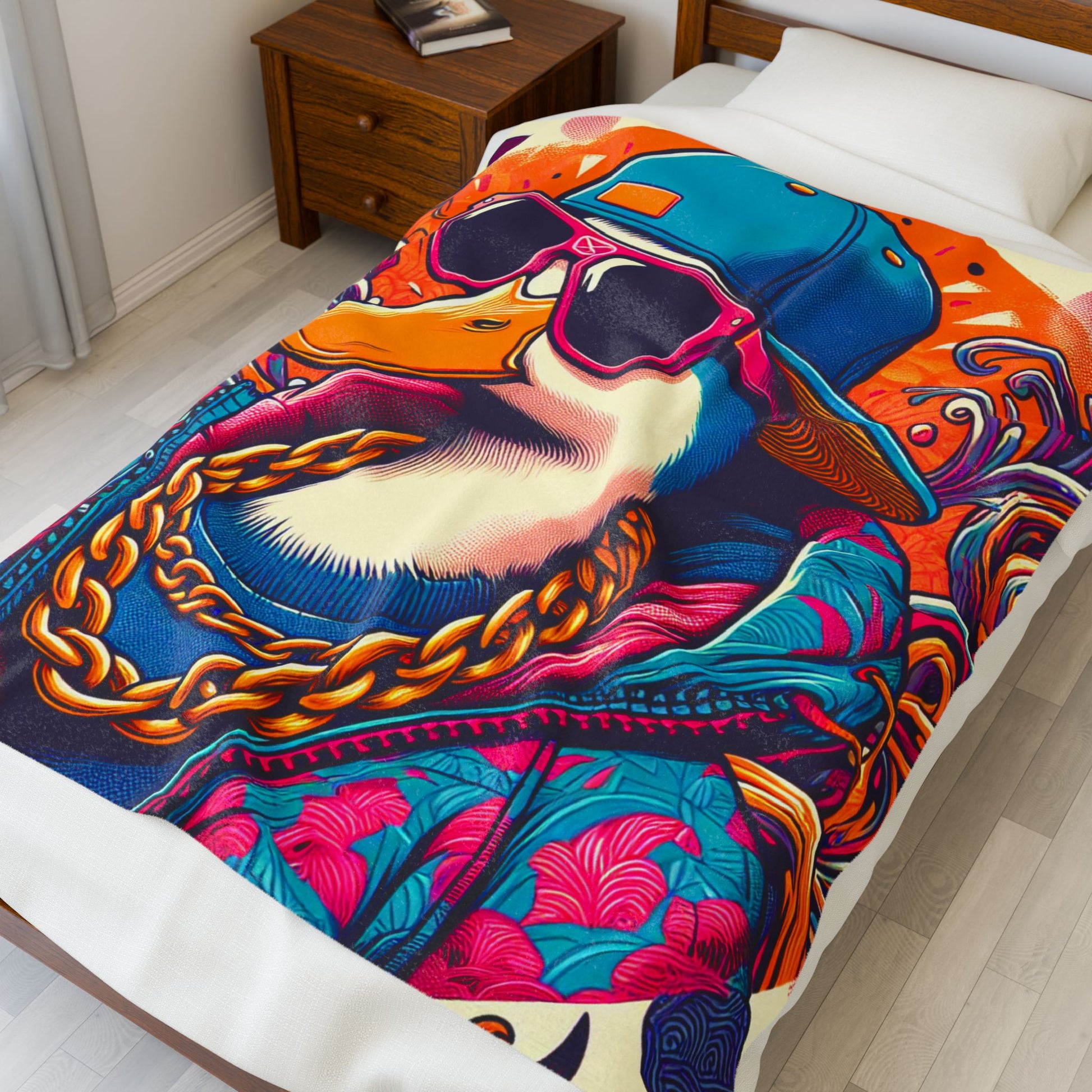 This vibrant artwork showcases a duck with urban flair, dressed in a colorful hoodie, chunky gold chain, shades, and a cap. Dynamic swirls and bold patterns create an energetic, street art-inspired backdrop, blending playfulness with a hip-hop edge. Create a cozy and warm atmosphere at home with this plush velveteen blanket. It is soft to touch and perfect for any home. Customize with a one-sided print to add your personal touch or create a gift for your friends and family. Available in three sizes: 30x40", 50x60", 60x80".