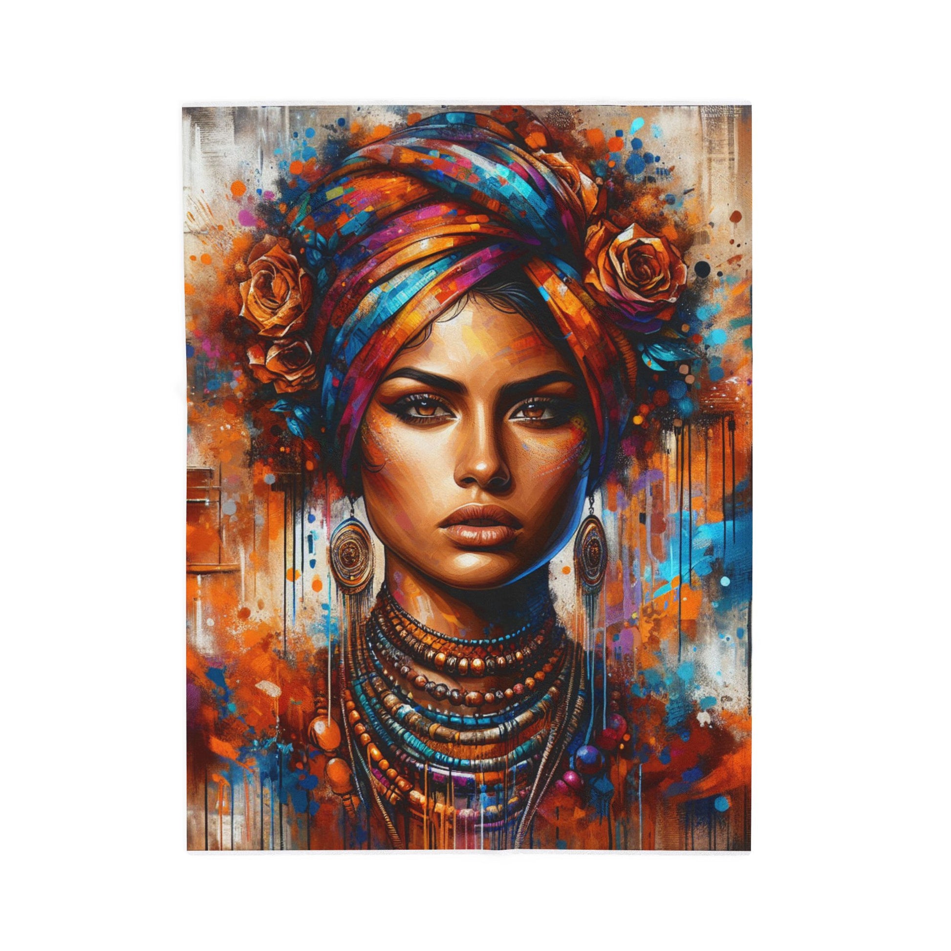 Vibrant and expressive, this artwork features a woman adorned in a multicolored turban and elaborate jewelry. A fusion of realism and abstract splashes, it blends vivid oranges, blues, and earth tones, creating a captivating and dynamic portrait that exudes cultural richness and artistic flair. Create a cozy and warm atmosphere at home with this plush velveteen blanket. It is soft to touch and perfect for any home. Customize with a one-sided print to add your personal touch or create a gift for your friends and family. Available in three sizes: 30x40", 50x60", 60x80".