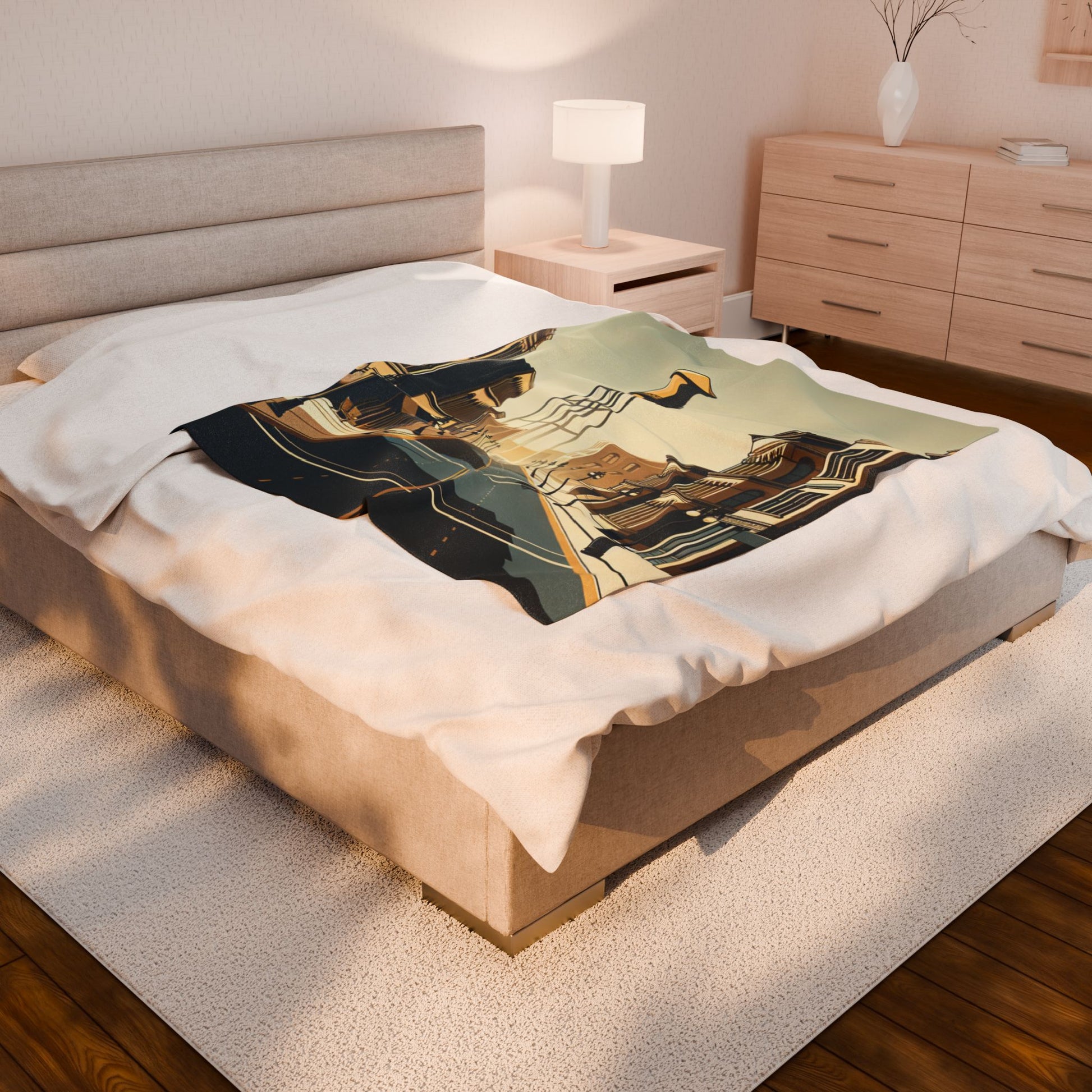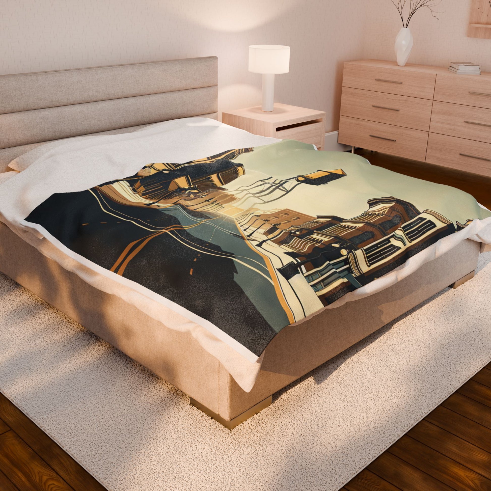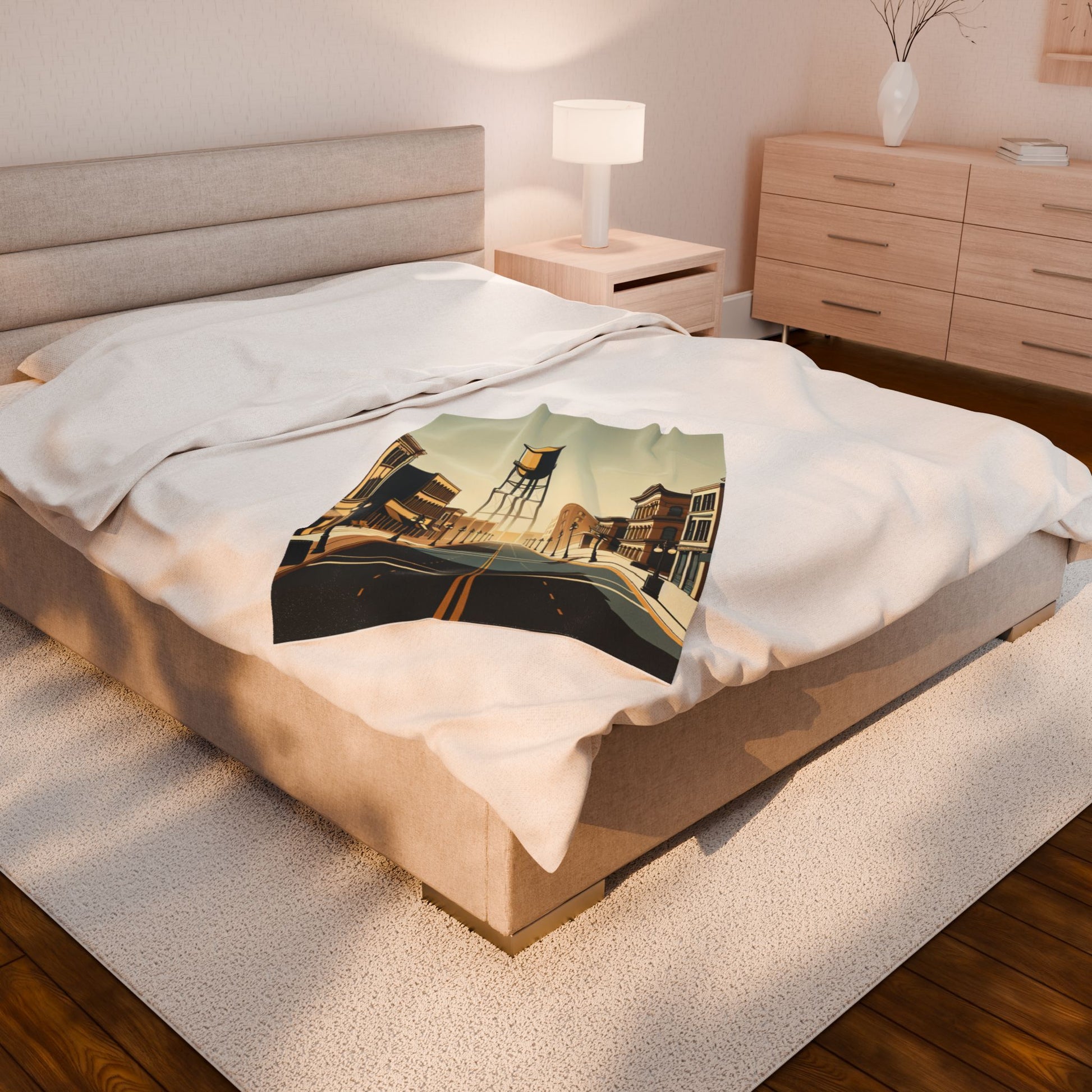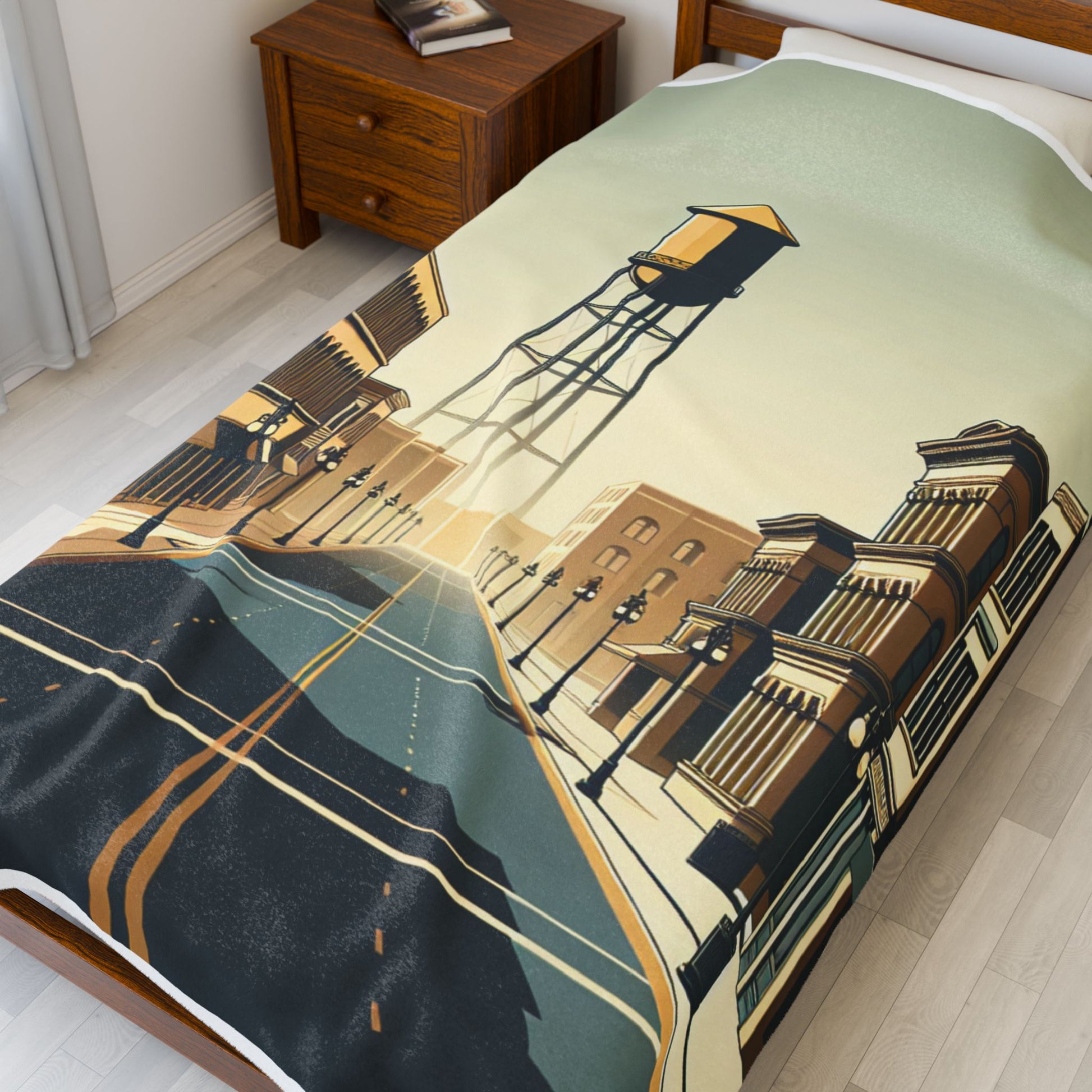 The image features a stylized, sepia-toned streetscape with symmetrical rows of vintage buildings and street lamps, leading to a towering, central water tower. The art deco influence and serene emptiness evoke a nostalgic, timeless atmosphere. Create a cozy and warm atmosphere at home with this plush velveteen blanket. It is soft to touch and perfect for any home. Customize with a one-sided print to add your personal touch or create a gift for your friends and family. Available in three sizes: 30x40", 50x60", 60x80".