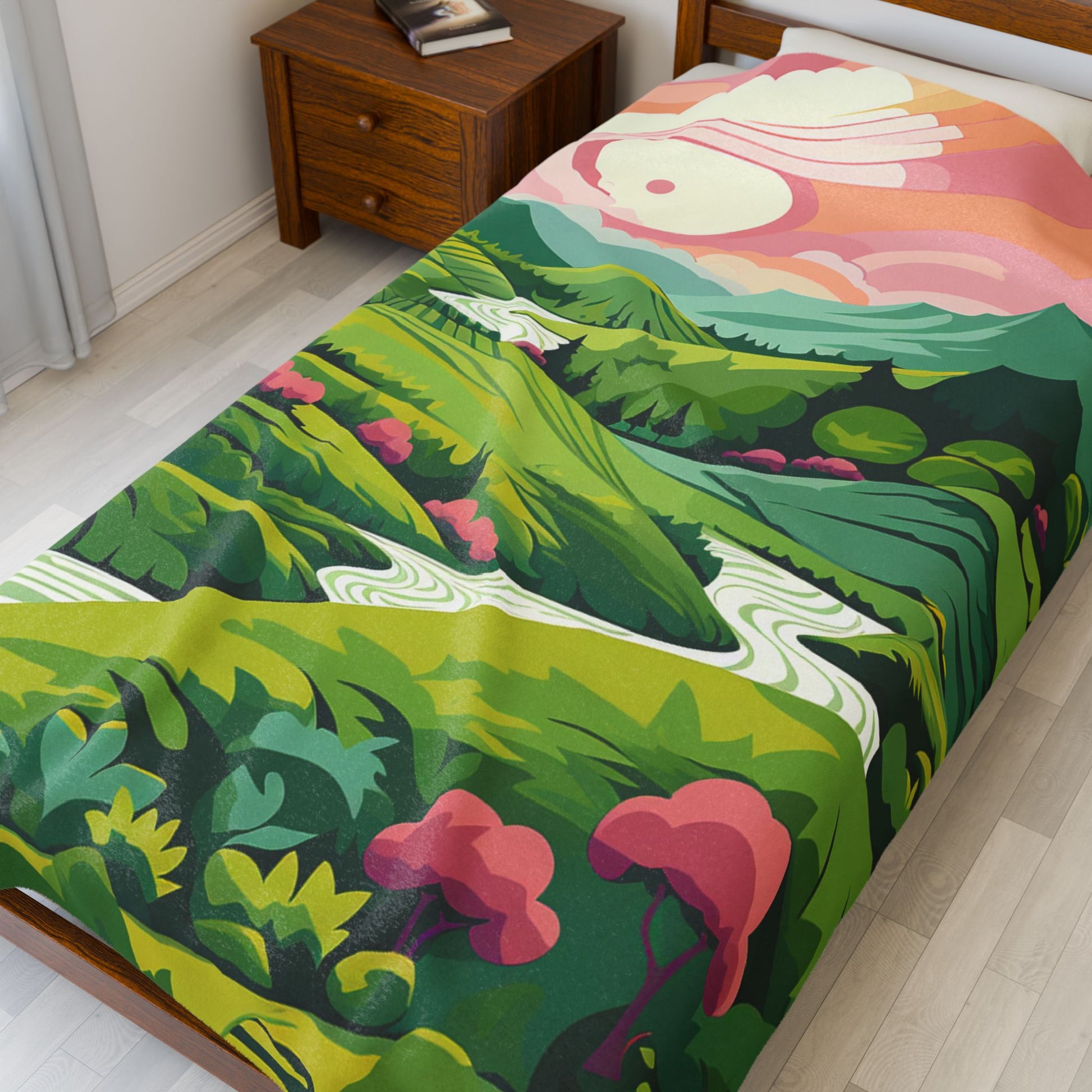 This image showcases a stylized, vibrant landscape with exaggerated curves and waves of color, creating a sense of dynamism. The interplay of whimsical pink clouds and lush greenery under a swirling sky evokes a serene yet spirited natural realm. Create a cozy and warm atmosphere at home with this plush velveteen blanket. It is soft to touch and perfect for any home. Customize with a one-sided print to add your personal touch or create a gift for your friends and family. Available in three sizes: 30x40", 50x60", 60x80".