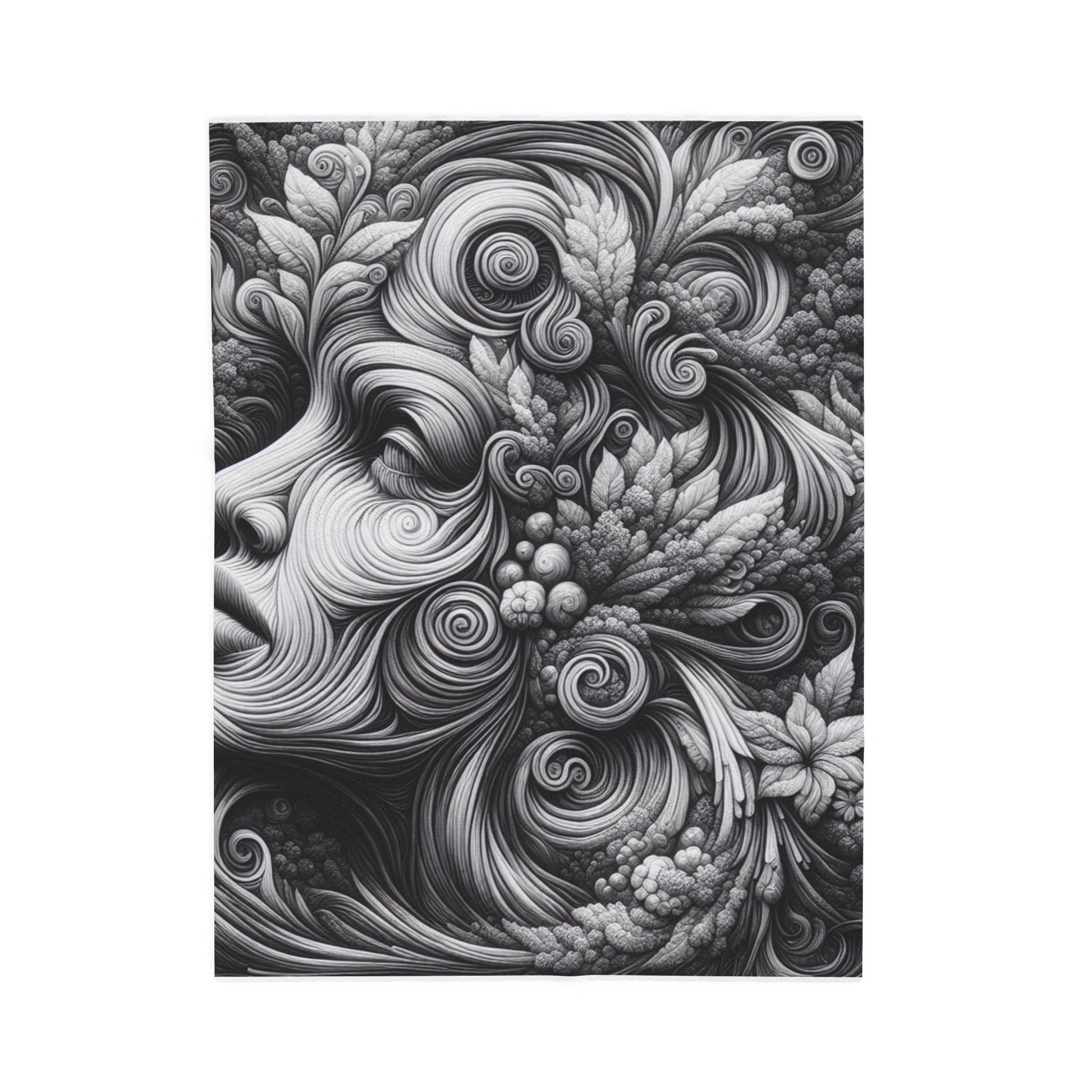 A mesmerizing black-and-white portrait of a woman's profile seamlessly blends swirling lines and intricate botanical designs, creating a harmonious fusion of nature and human form. The fluid transitions and detailed textures evoke a sense of endless flow and serene beauty. Create a cozy and warm atmosphere at home with this plush velveteen blanket. It is soft to touch and perfect for any home. Customize with a one-sided print to add your personal touch or create a gift for your friends and family. Available in three sizes: 30x40", 50x60", 60x80".