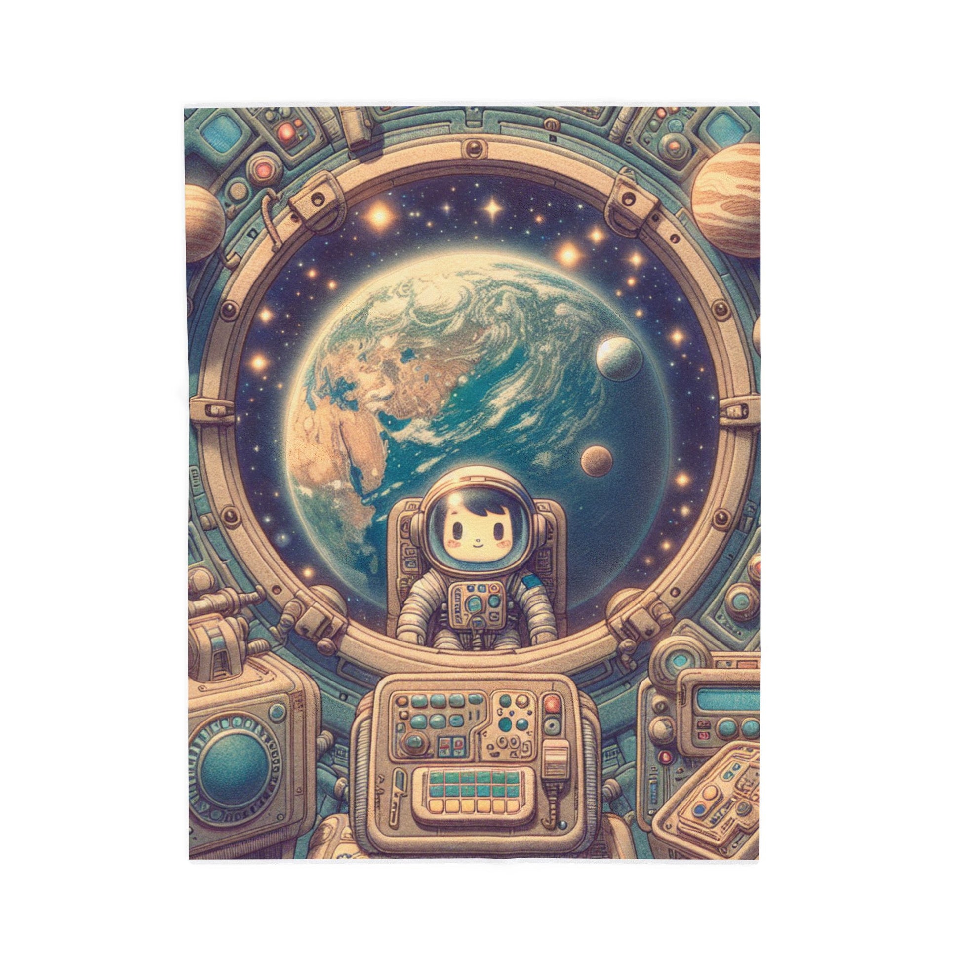 Whimsical space illustration featuring a cute astronaut gazing through a spaceship window at Earth and celestial wonders. Retro-futuristic control panels and soft pastel hues evoke a playful, dreamlike exploration of the cosmos. Create a cozy and warm atmosphere at home with this plush velveteen blanket. It is soft to touch and perfect for any home. Customize with a one-sided print to add your personal touch or create a gift for your friends and family. Available in three sizes: 30x40", 50x60", 60x80".