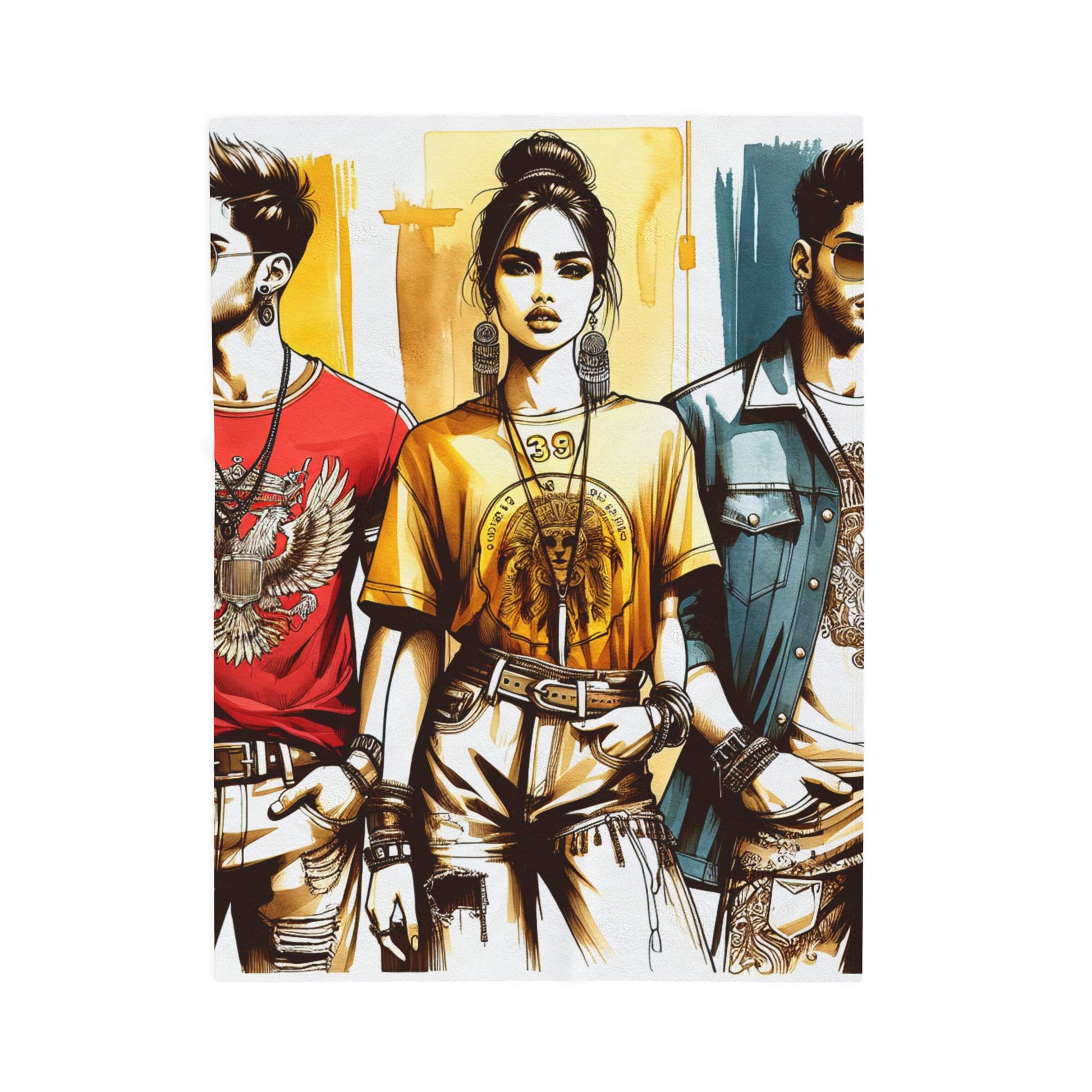 The image features three stylized figures with a distinctive urban flare, accentuated by rugged denim, bold print tees, and striking accessories, against a sunlit, textured backdrop. The artwork radiates confidence through their poses and fashion-forward attitude, emphasizing individuality and modern street style. Create a cozy and warm atmosphere at home with this plush velveteen blanket. It is soft to touch and perfect for any home. Customize with a one-sided print to add your personal touch or create a gift for your friends and family. Available in three sizes: 30x40", 50x60", 60x80".