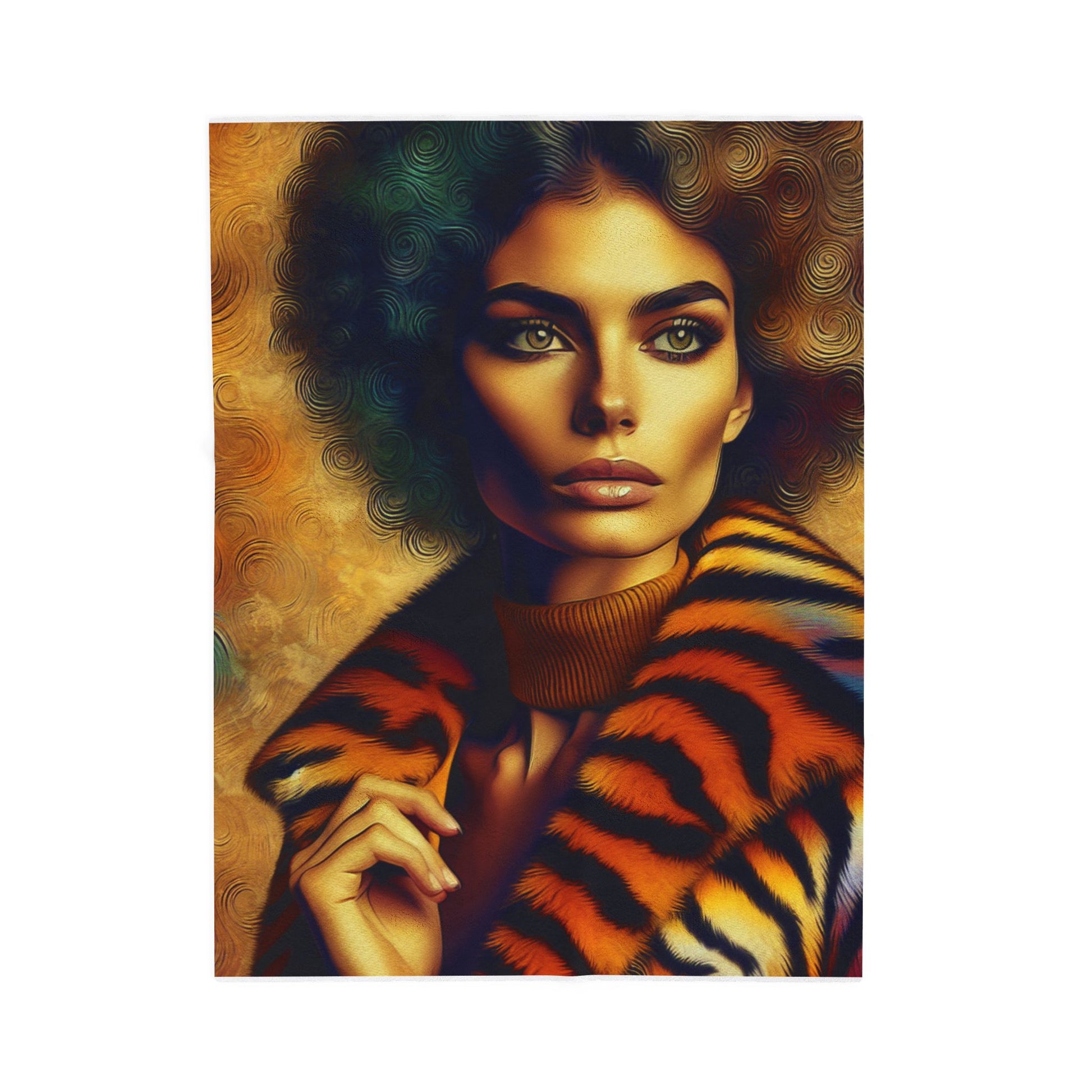 The image showcases a striking figure in a vibrant, tiger-striped coat against a swirling, textured background. The fusion of rich colors and bold patterns creates a mesmerizing, artistic effect, blending realism with abstraction, embodying confidence and allure. Create a cozy and warm atmosphere at home with this plush velveteen blanket. It is soft to touch and perfect for any home. Customize with a one-sided print to add your personal touch or create a gift for your friends and family. Available in three sizes: 30x40", 50x60", 60x80".