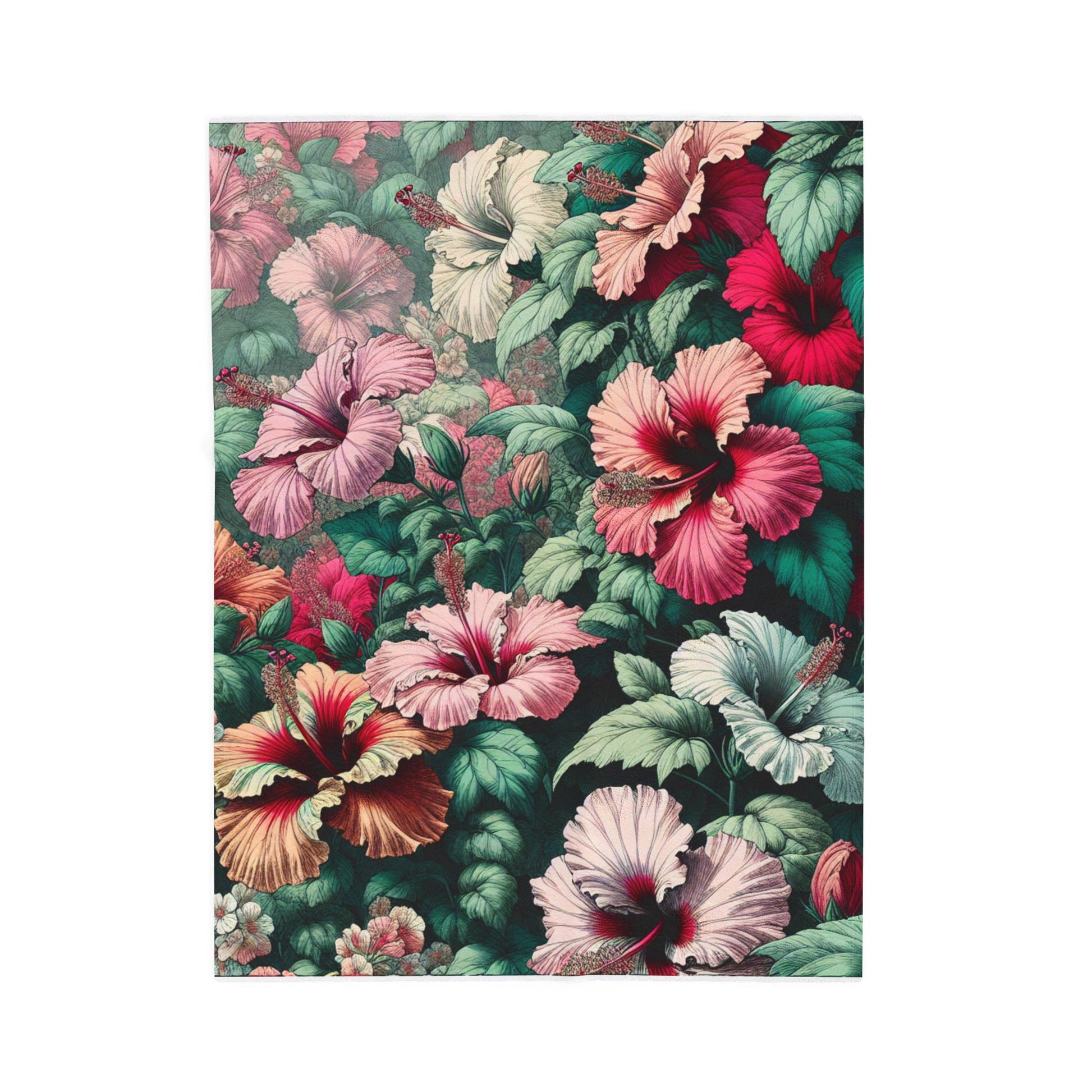 A vivid tapestry of hibiscus blooms and lush foliage, intricately illustrated with vibrant colors and delicate shading. The artwork captures a harmonious blend of organic forms and elaborate patterns, creating an enchanting floral symphony that evokes both elegance and a sense of flourishing, natural beauty. Create a cozy and warm atmosphere at home with this plush velveteen blanket. It is soft to touch and perfect for any home. Customize with a one-sided print to add your personal touch or create a gift for your friends and family. Available in three sizes: 30x40", 50x60", 60x80".