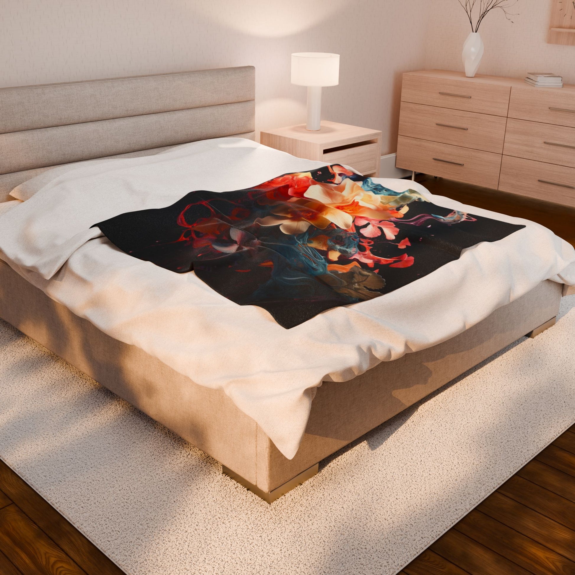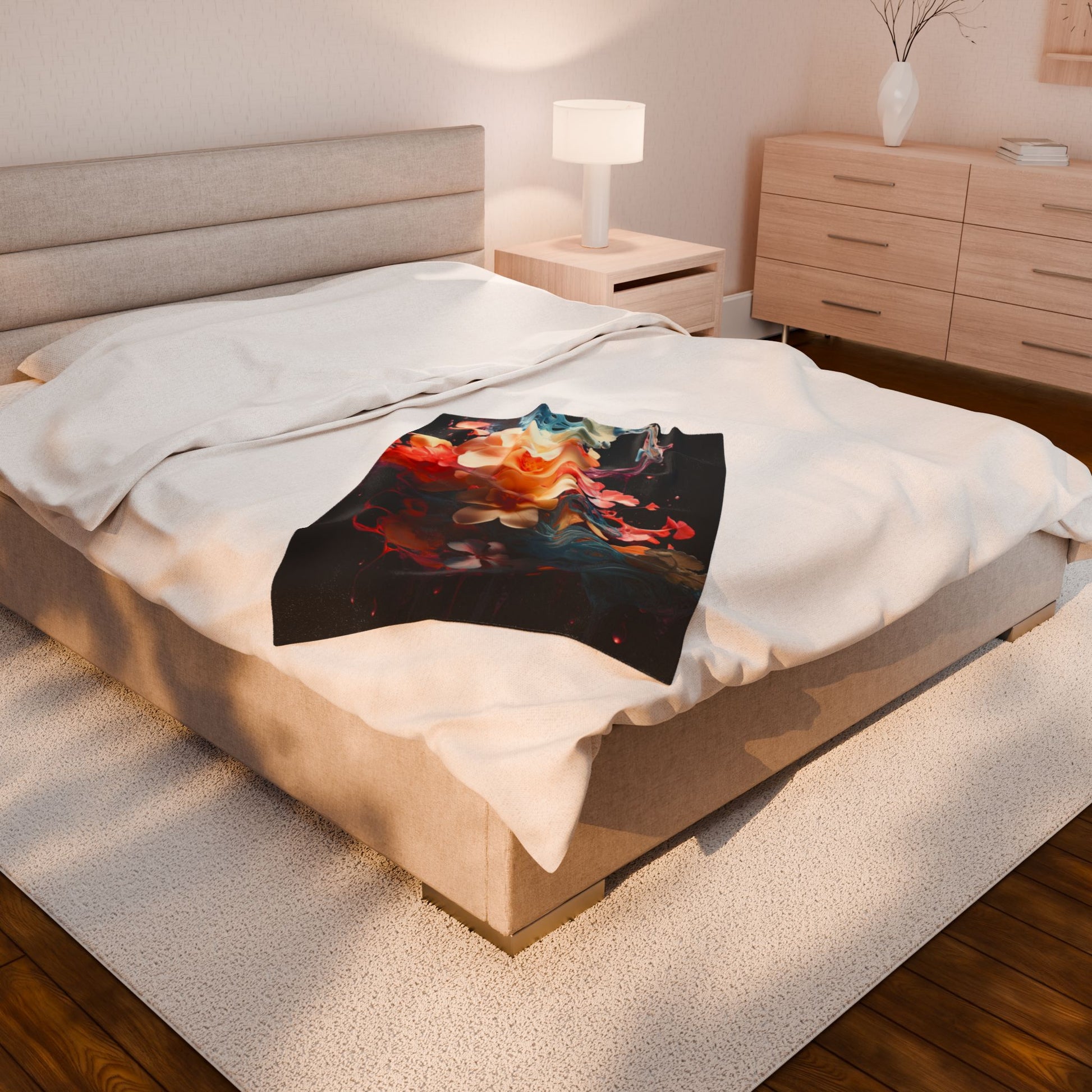 A vivid bouquet of flowers emerges, entwined with fluid swirls and dynamic splashes of color, creating an ethereal fusion of natural beauty and liquid motion against a dark backdrop. Create a cozy and warm atmosphere at home with this plush velveteen blanket. It is soft to touch and perfect for any home. Customize with a one-sided print to add your personal touch or create a gift for your friends and family. Available in three sizes: 30x40", 50x60", 60x80".