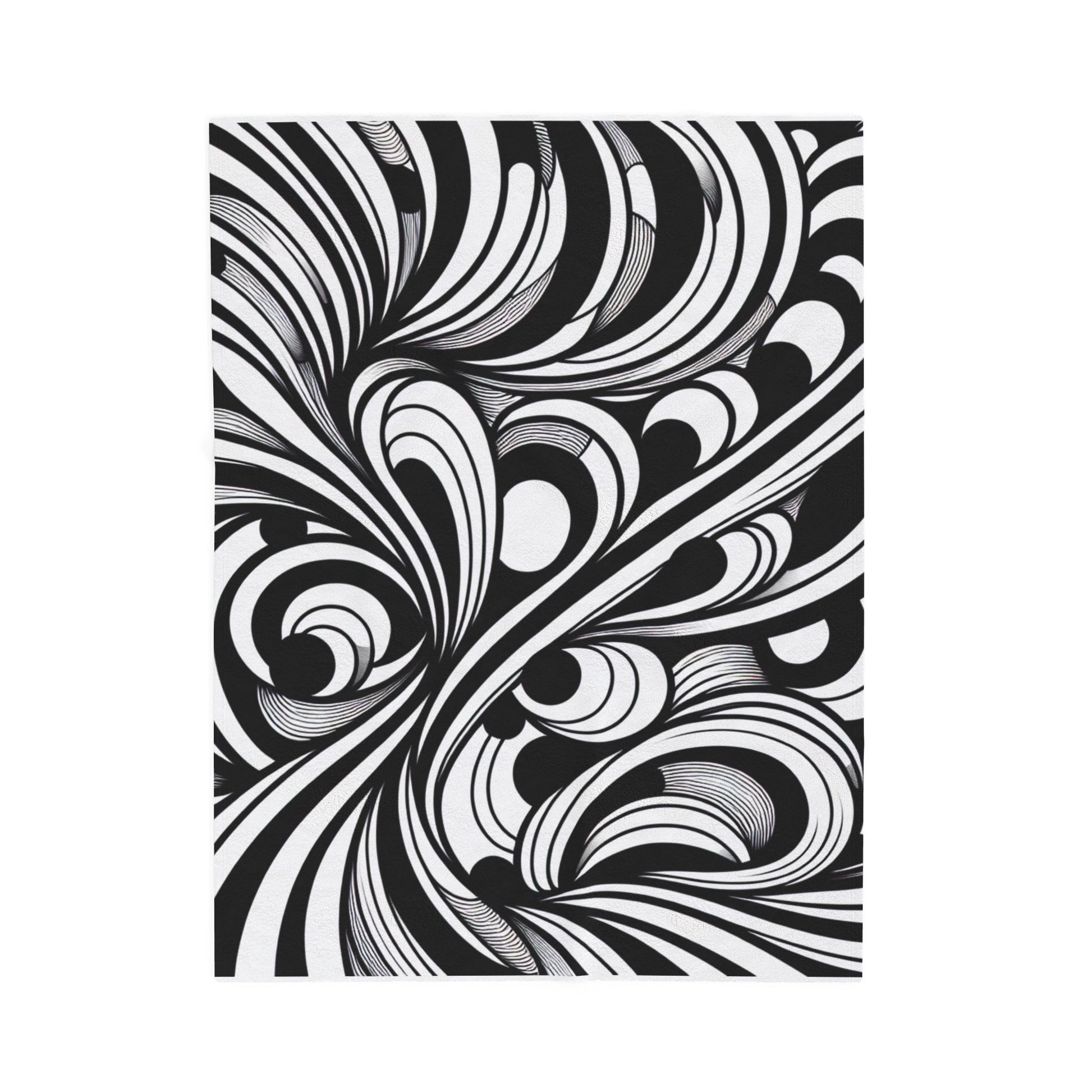 This image features a dynamic interplay of swirling black and white lines, creating an intricate, hypnotic pattern. The flowing curves and dense wave motifs evoke a sense of movement and energy, offering a captivating example of abstract visual art. Create a cozy and warm atmosphere at home with this plush velveteen blanket. It is soft to touch and perfect for any home. Customize with a one-sided print to add your personal touch or create a gift for your friends and family. Available in three sizes: 30x40", 50x60", 60x80".