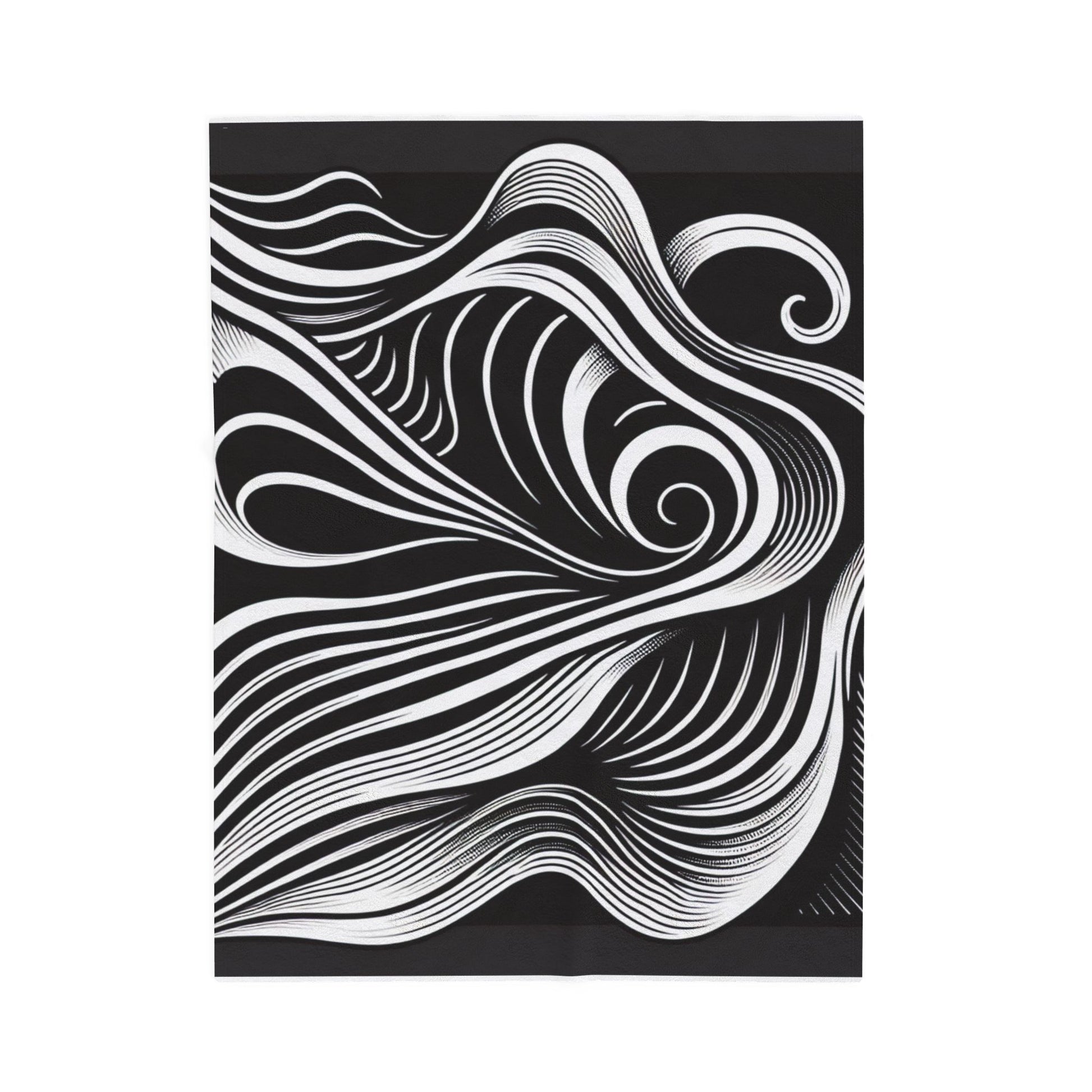 Flowing black and white lines intertwine in a mesmerizing dance, creating a hypnotic, abstract pattern. The dynamic curves and swirls suggest movement and energy, evoking a sense of fluidity and harmony. A striking interplay of contrast and texture. Create a cozy and warm atmosphere at home with this plush velveteen blanket. It is soft to touch and perfect for any home. Customize with a one-sided print to add your personal touch or create a gift for your friends and family. Available in three sizes: 30x40", 50x60", 60x80".