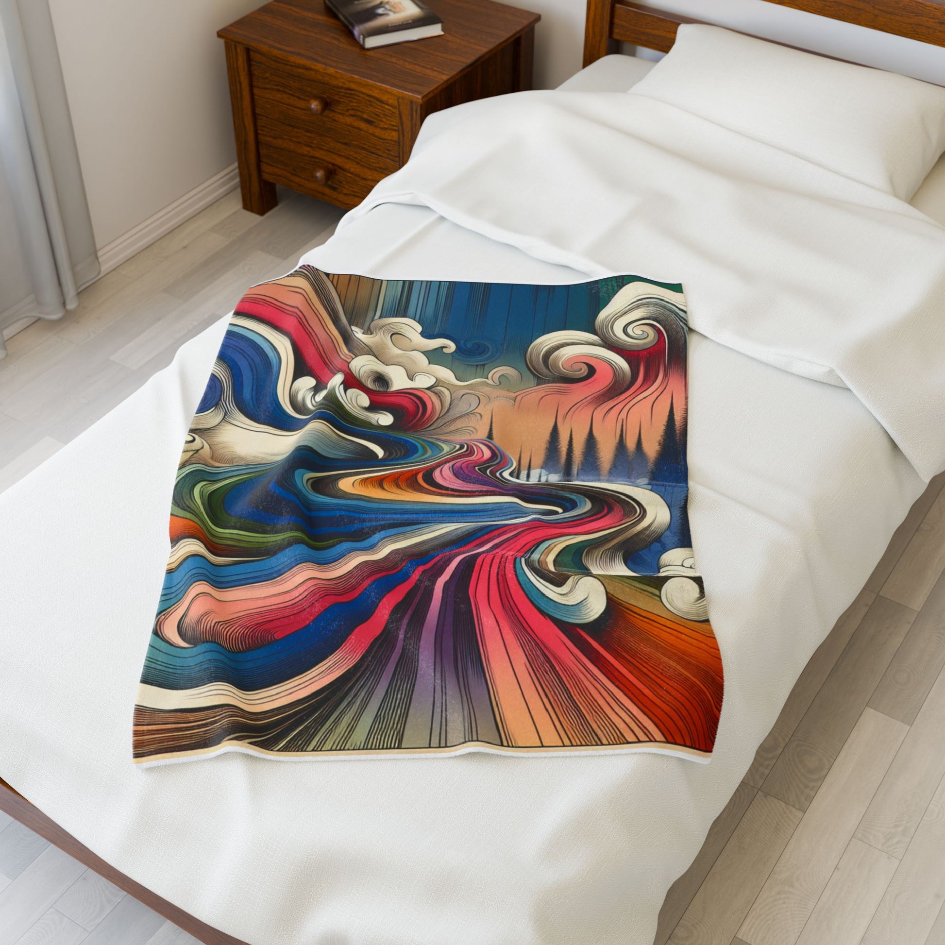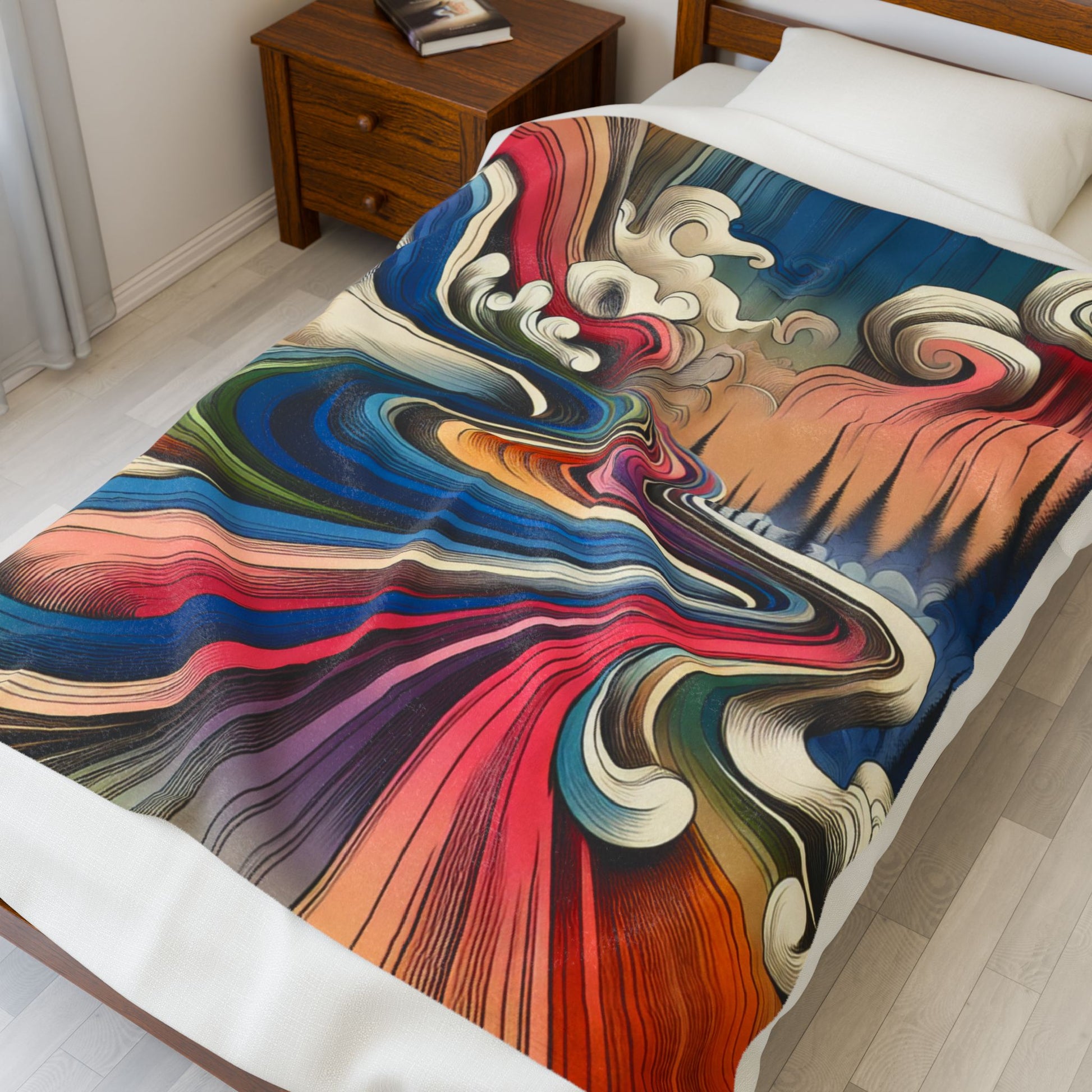 A vibrant, swirling tapestry of color and texture, this illustration merges fluid, wavy lines with abstract cloud-like forms and dynamic landscapes, creating a harmonious blend of nature and fantasy. Bold hues and intricate patterns evoke movement and energy, inviting viewers into a mesmerizing, dreamlike world. Create a cozy and warm atmosphere at home with this plush velveteen blanket. It is soft to touch and perfect for any home. Customize with a one-sided print to add your personal touch or create a gift for your friends and family. Available in three sizes: 30x40", 50x60", 60x80".