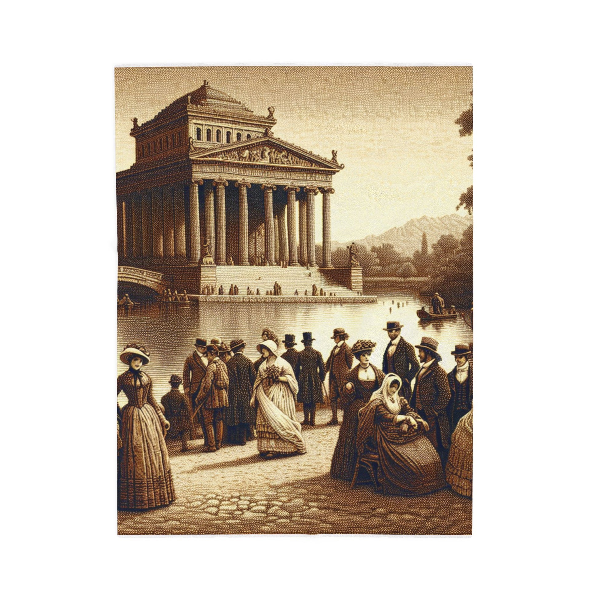 A vintage-style sepia illustration captures a serene riverside scene with elegantly dressed figures in 1800s attire, set against a backdrop of a grand, classical temple and lush landscapes. The intricate details and historical ambiance evoke a timeless, romantic atmosphere. Create a cozy and warm atmosphere at home with this plush velveteen blanket. It is soft to touch and perfect for any home. Customize with a one-sided print to add your personal touch or create a gift for your friends and family. Available in three sizes: 30x40", 50x60", 60x80".