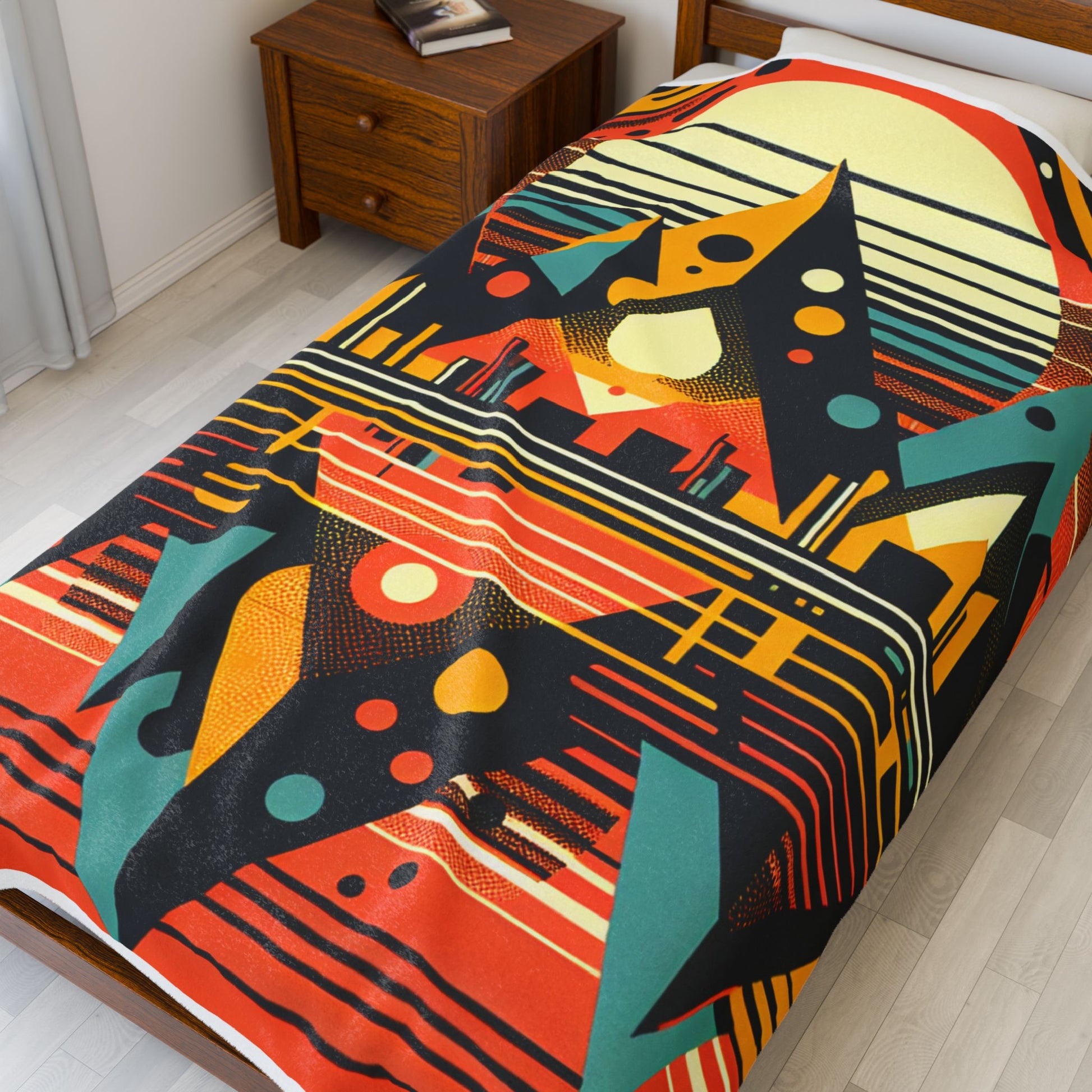 This vibrant artwork features geometric mountains mirrored on a reflective surface, with bold shapes and eye-catching colors of orange, teal, and yellow. The sun and urban skyline add a futuristic touch, creating a dynamic interplay between nature and cityscape. Create a cozy and warm atmosphere at home with this plush velveteen blanket. It is soft to touch and perfect for any home. Customize with a one-sided print to add your personal touch or create a gift for your friends and family. Available in three sizes: 30x40", 50x60", 60x80".
