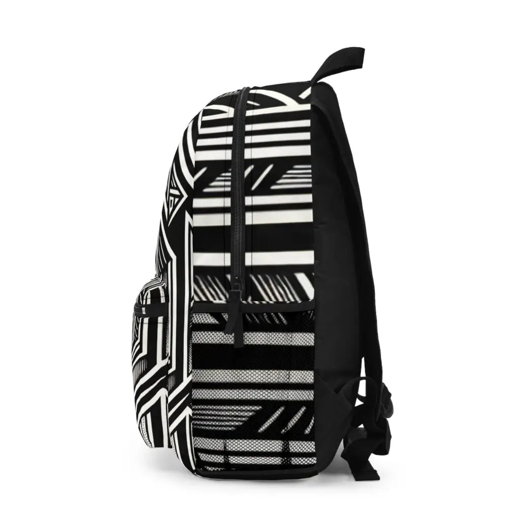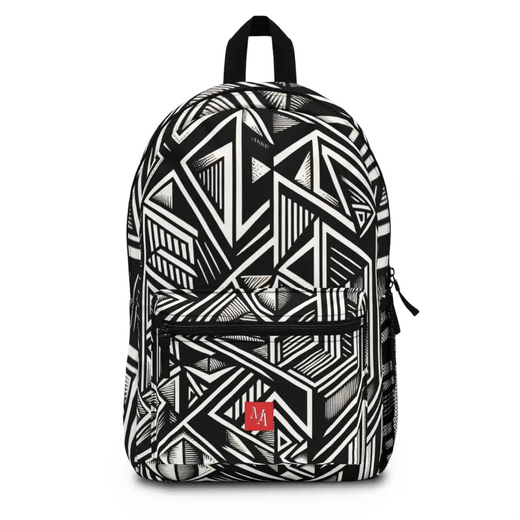 A mesmerizing tapestry of bold, white geometric patterns against a black background, featuring dynamic, overlapping triangles and arrows. The intricate, angular symmetry creates a captivating sense of movement and depth, evoking a modern, tribal aesthetic. Introducing the ultimate backpack for fashion-forward adventurers! Our backpack boasts a striking textile design that will make a statement wherever you go. With its durable construction and spacious compartments, it is perfect for carrying all your essentials. Get ready to turn heads and stay organized with our backpack. #textiledesign #backpack #fashionforward #adventure #durable #spacious #statementpiece #organized #essentials #travel #explore