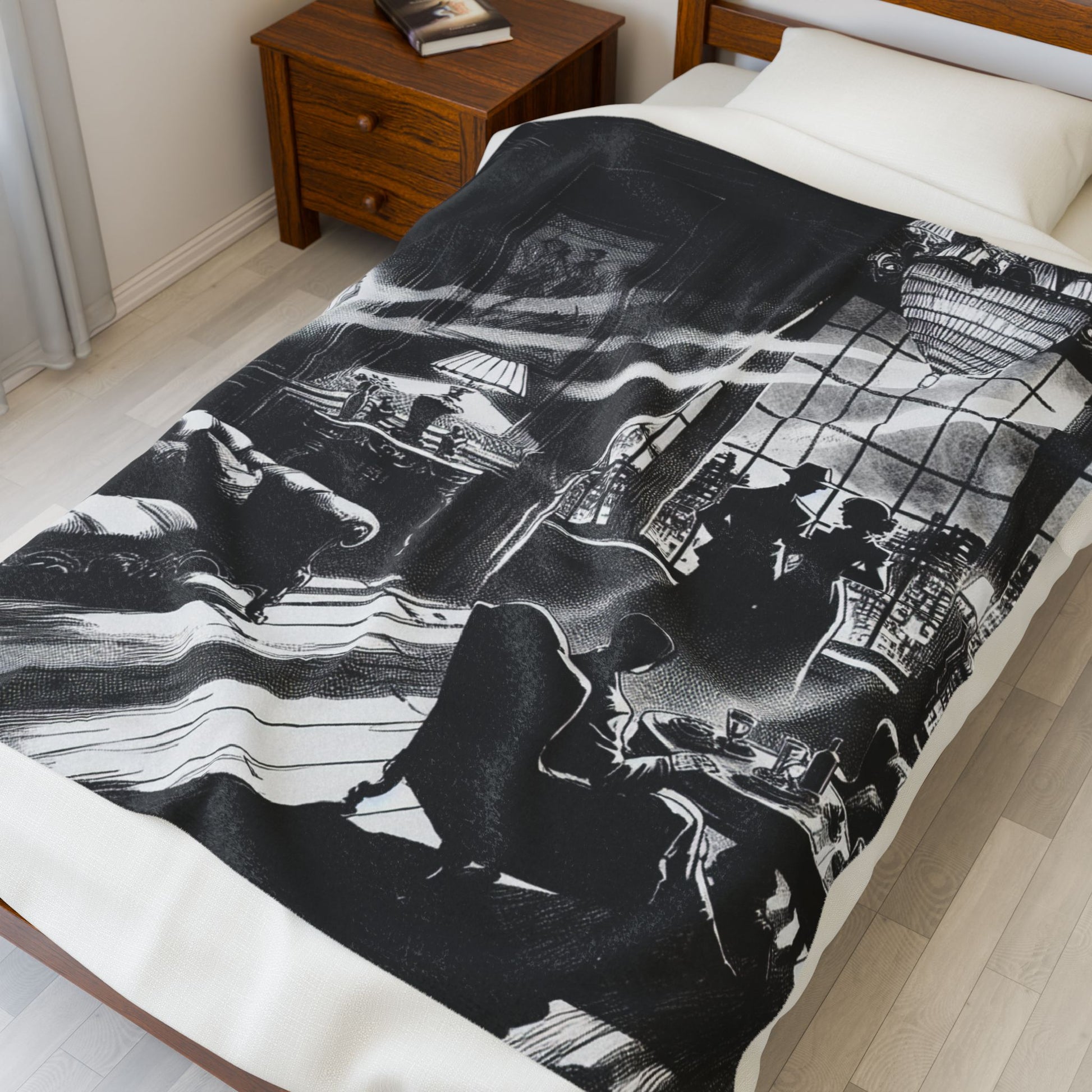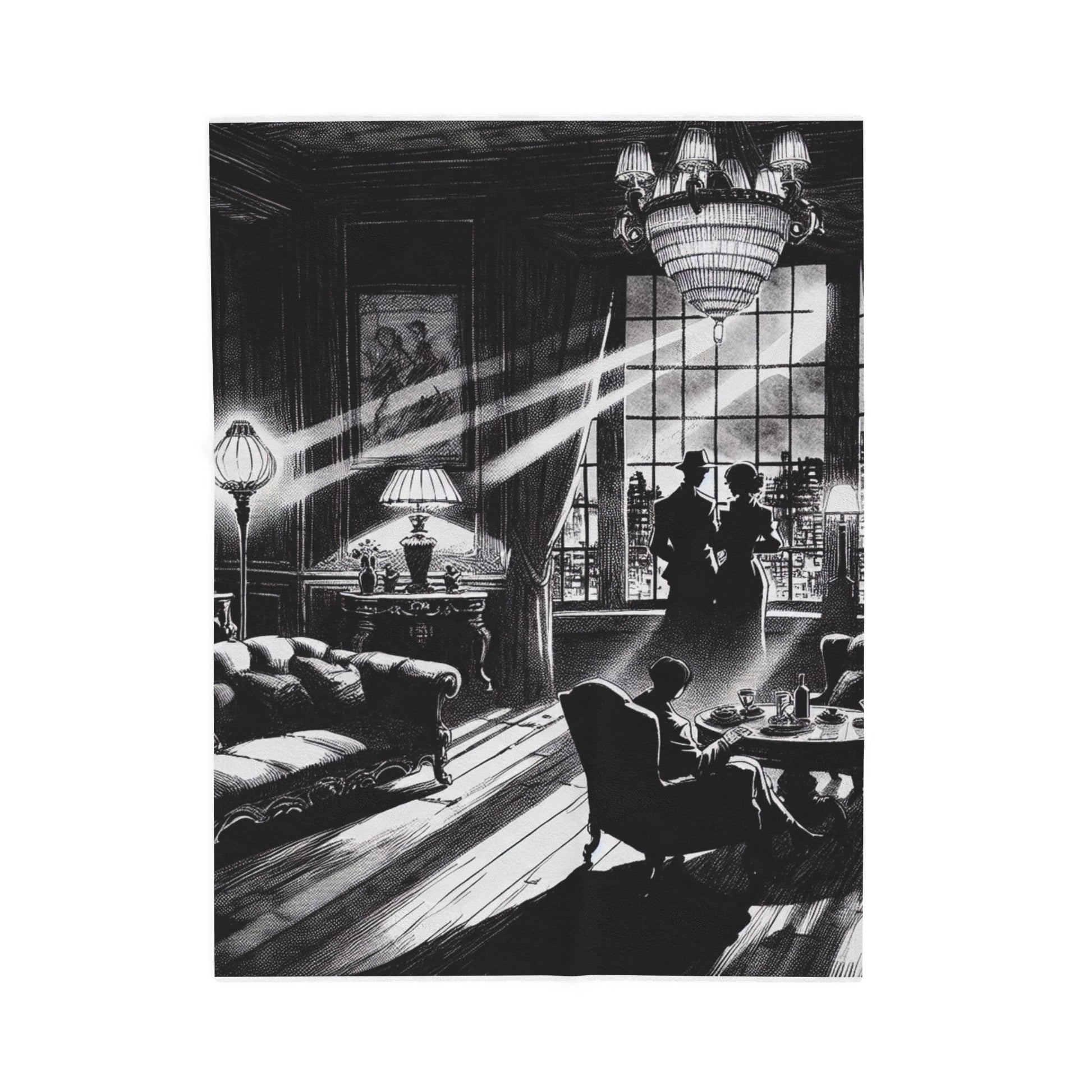 The image captures a vintage noir setting, with silhouetted figures gazing out a grand window. Intricate lighting emphasizes elegant furnishings and dramatic shadows, creating a mysterious, timeless atmosphere reminiscent of classic detective stories. Create a cozy and warm atmosphere at home with this plush velveteen blanket. It is soft to touch and perfect for any home. Customize with a one-sided print to add your personal touch or create a gift for your friends and family. Available in three sizes: 30x40", 50x60", 60x80".
