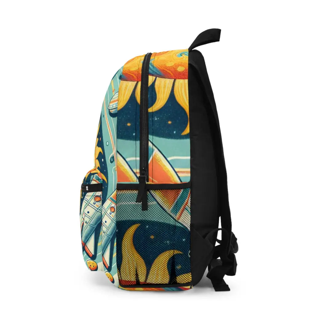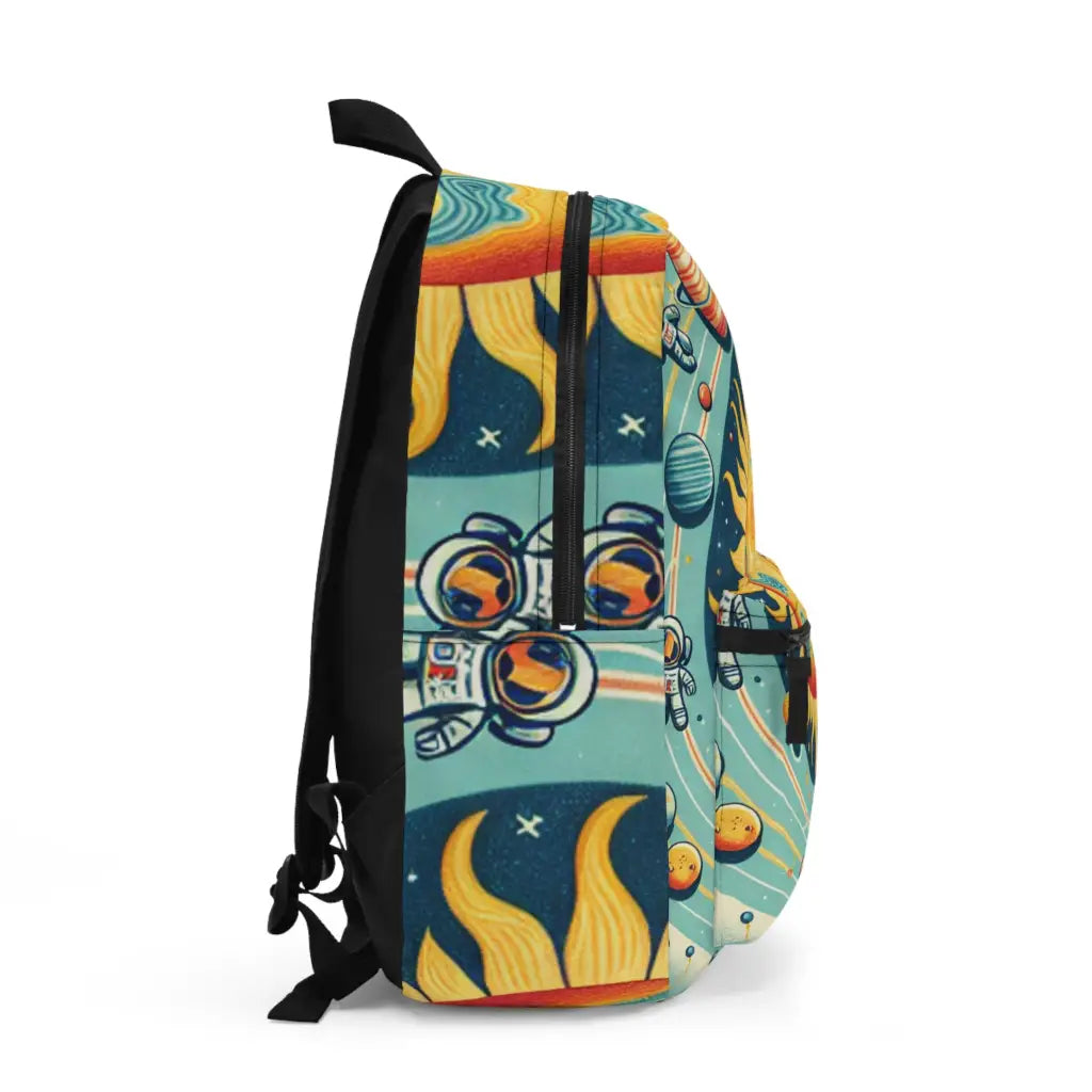 A whimsical cosmic scene features a playful rocket and an astronaut among stylized planets, orbiting in a dreamlike, pastel universe. The sun radiates warmth, adding charm and creativity to this imaginative space journey. Introducing the ultimate backpack for fashion-forward adventurers! Our backpack boasts a striking textile design that will make a statement wherever you go. With its durable construction and spacious compartments, it is perfect for carrying all your essentials. Get ready to turn heads and stay organized with our backpack. #textiledesign #backpack #fashionforward #adventure #durable #spacious #statementpiece #organized #essentials #travel #explore