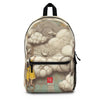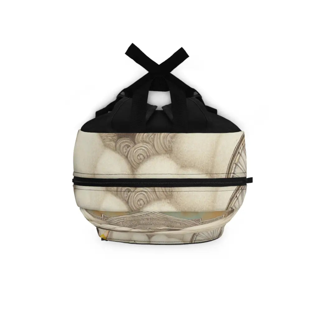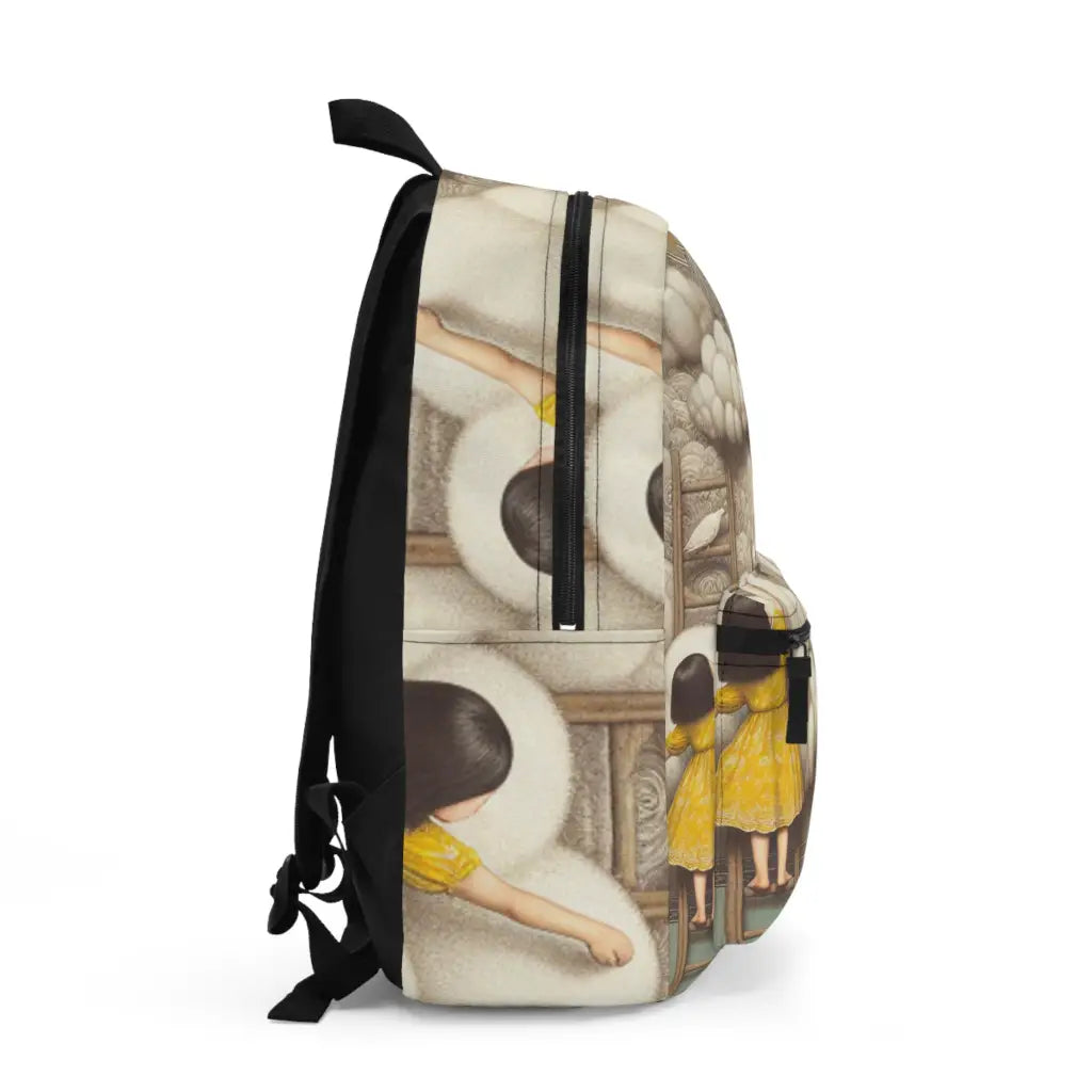 A whimsical scene features a girl on a ladder painting clouds, surrounded by imaginative sketches of birds riding bicycles and perching on buildings, blending fantasy with elements of urban life in gentle, muted tones. Introducing the ultimate backpack for fashion-forward adventurers! Our backpack boasts a striking textile design that will make a statement wherever you go. With its durable construction and spacious compartments, it is perfect for carrying all your essentials. Get ready to turn heads and stay organized with our backpack. #textiledesign #backpack #fashionforward #adventure #durable #spacious #statementpiece #organized #essentials #travel #explore