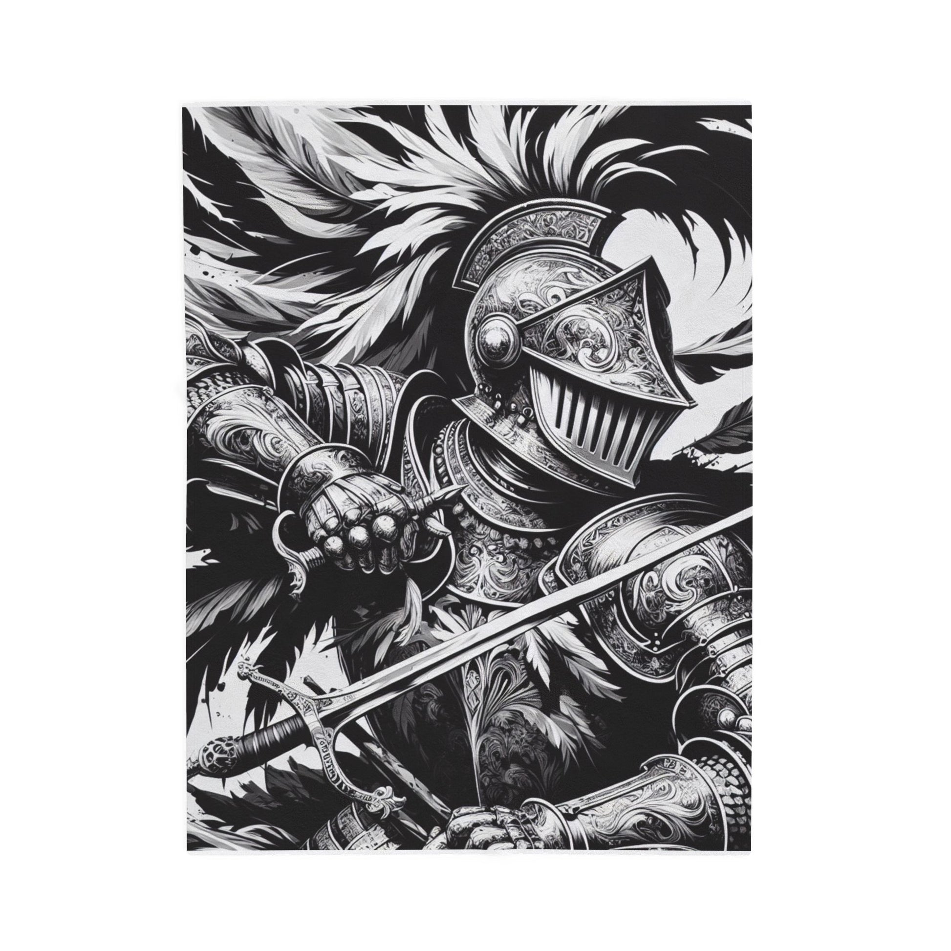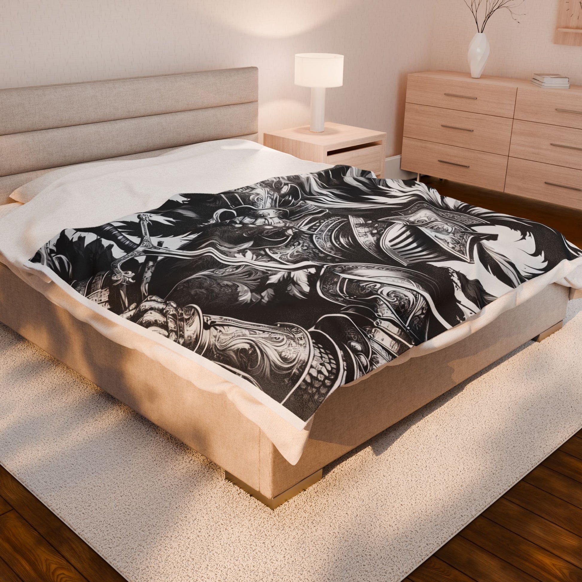 A knight clad in intricately detailed, ornamental armor wields a sword amidst dynamic, swirling feathers. The monochrome palette emphasizes the elaborate engravings and fluid motion, creating a striking and dramatic scene. Create a cozy and warm atmosphere at home with this plush velveteen blanket. It is soft to touch and perfect for any home. Customize with a one-sided print to add your personal touch or create a gift for your friends and family. Available in three sizes: 30x40", 50x60", 60x80".