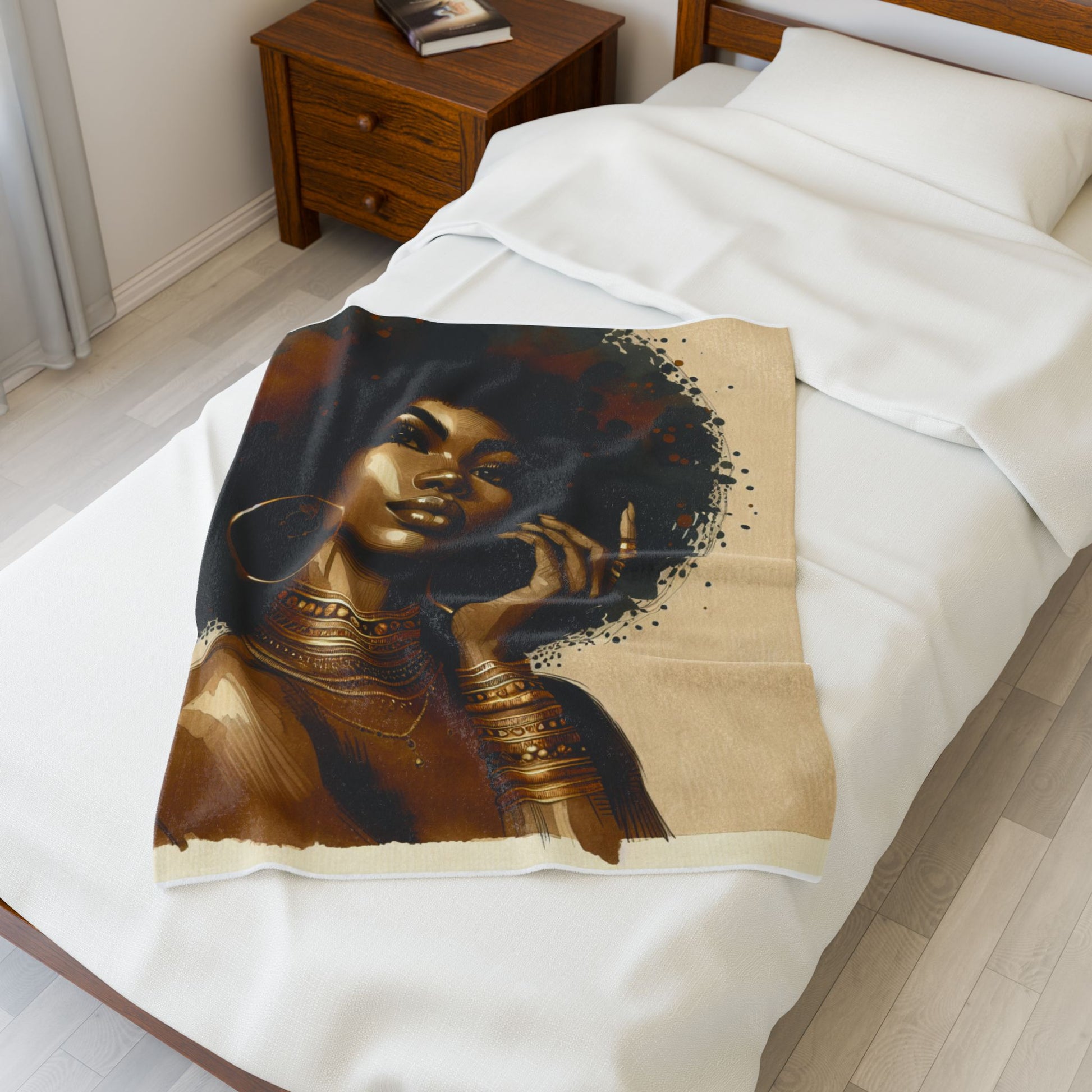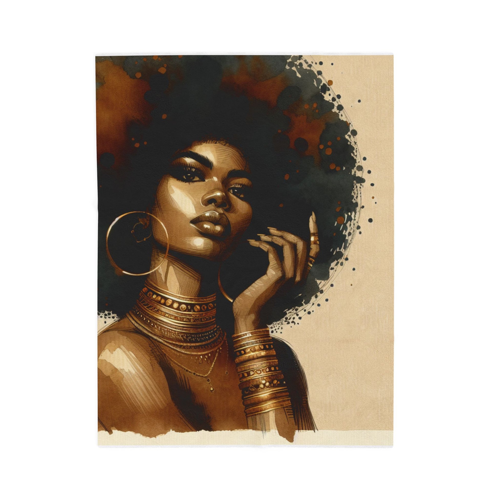 A striking illustration featuring a woman adorned with bold gold jewelry against a textured background. Her expressive pose and vivid afro create a captivating blend of elegance and strength, enveloped in rich, fluid watercolor tones. Create a cozy and warm atmosphere at home with this plush velveteen blanket. It is soft to touch and perfect for any home. Customize with a one-sided print to add your personal touch or create a gift for your friends and family. Available in three sizes: 30x40", 50x60", 60x80".