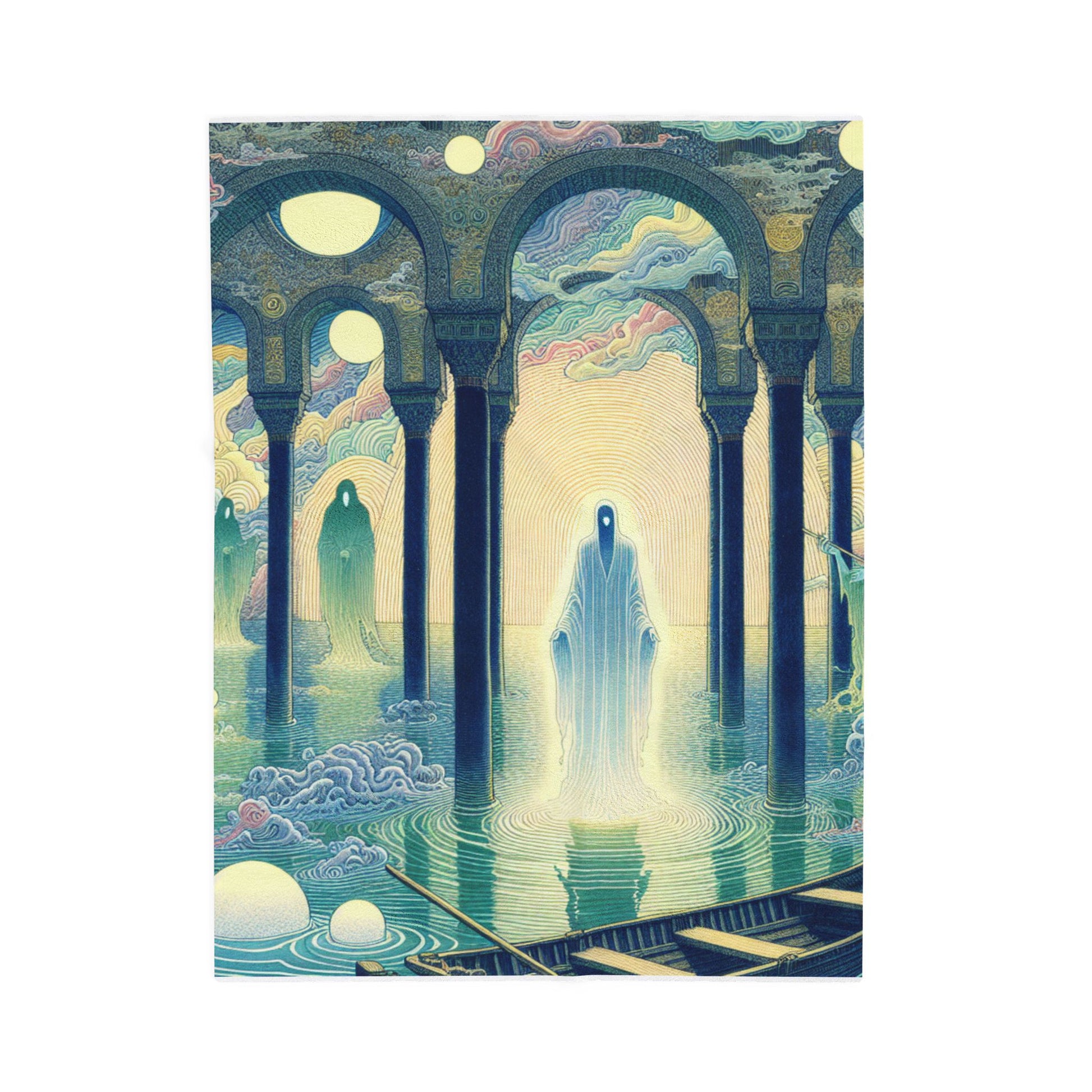 Spectral figures glide through an ethereal hall of arches and water, bathed in celestial light. Dreamlike colors swirl in the sky, reflecting a mystical world both serene and otherworldly. A boat lies moored in the foreground, inviting exploration of this surreal, enchanted realm. Create a cozy and warm atmosphere at home with this plush velveteen blanket. It is soft to touch and perfect for any home. Customize with a one-sided print to add your personal touch or create a gift for your friends and family. Available in three sizes: 30x40", 50x60", 60x80".