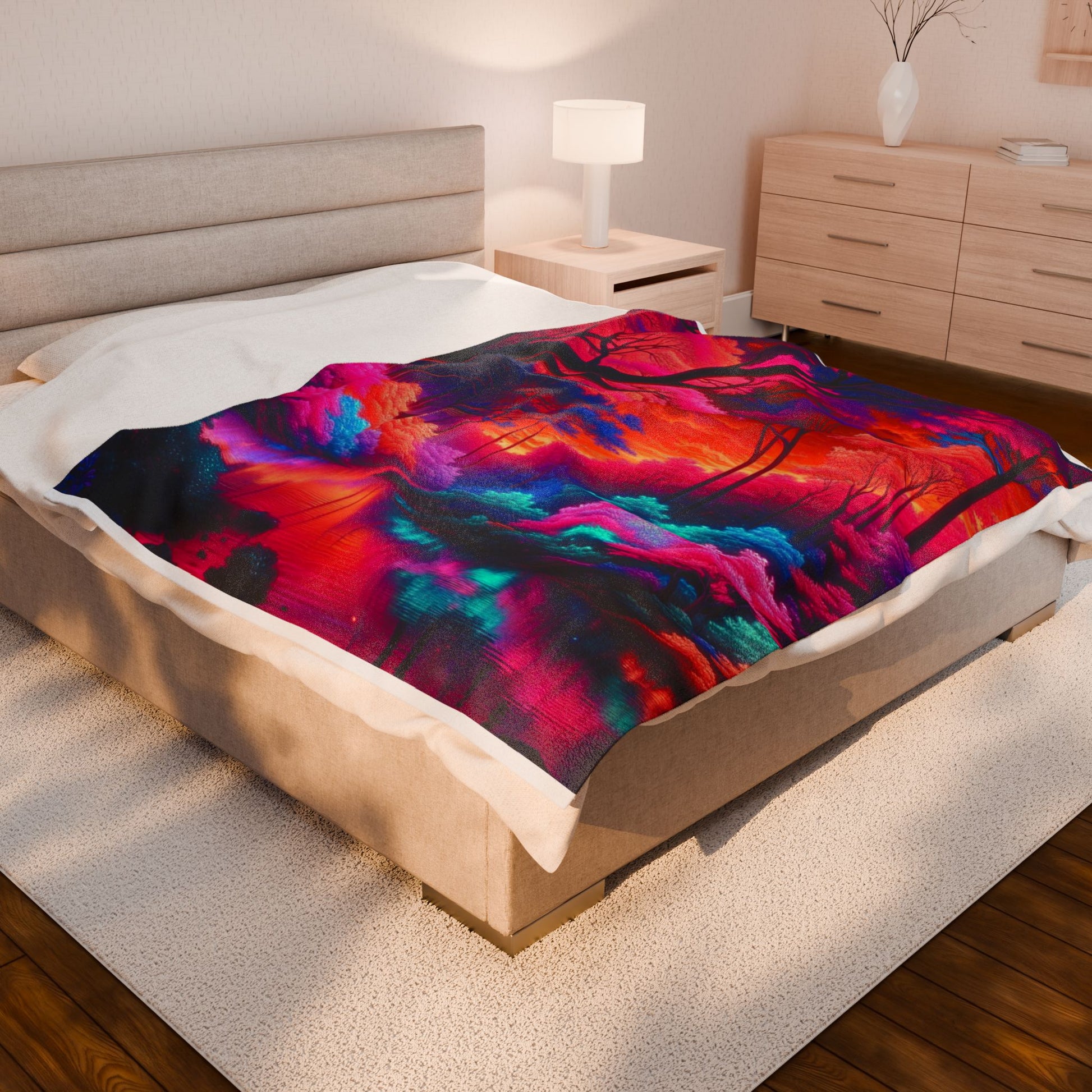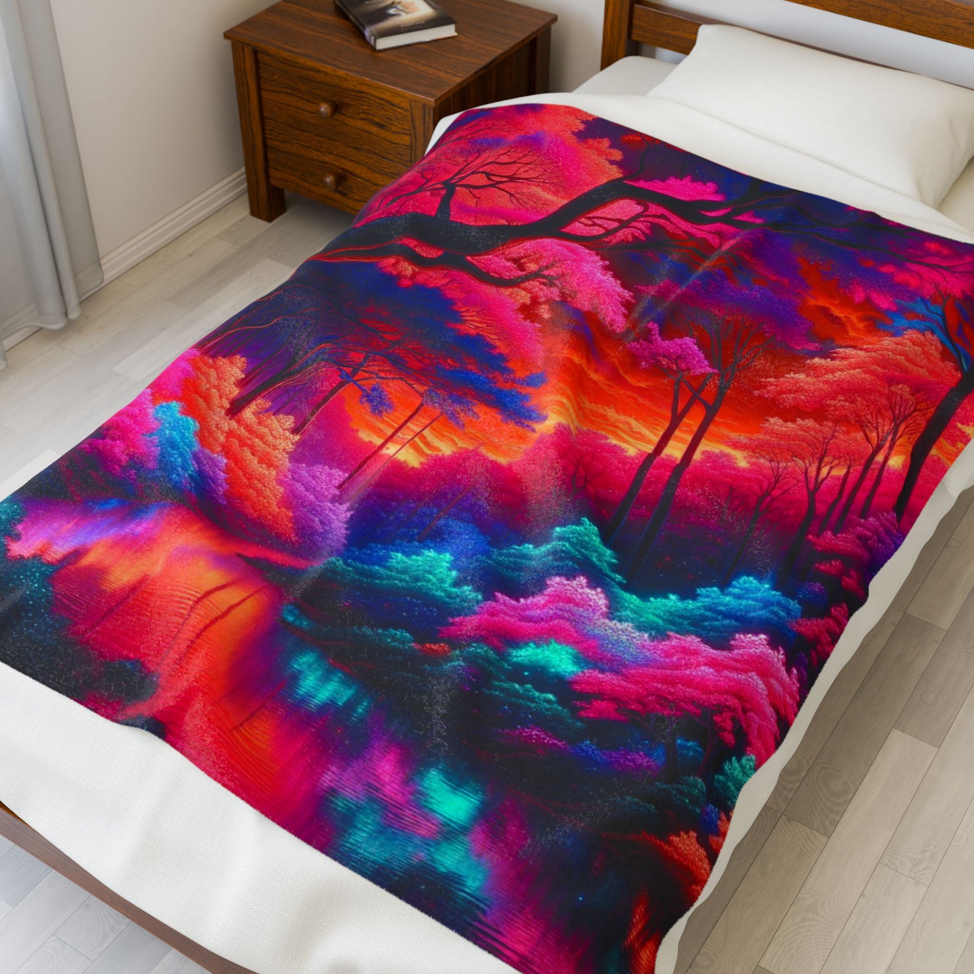 A mesmerizingly vibrant landscape, this image showcases a surreal forest alive with neon pink, blue, and orange hues. The ethereal glow radiates through intricately detailed trees, reflecting in a serene stream, creating an enchanting, otherworldly scene. Create a cozy and warm atmosphere at home with this plush velveteen blanket. It is soft to touch and perfect for any home. Customize with a one-sided print to add your personal touch or create a gift for your friends and family. Available in three sizes: 30x40", 50x60", 60x80".