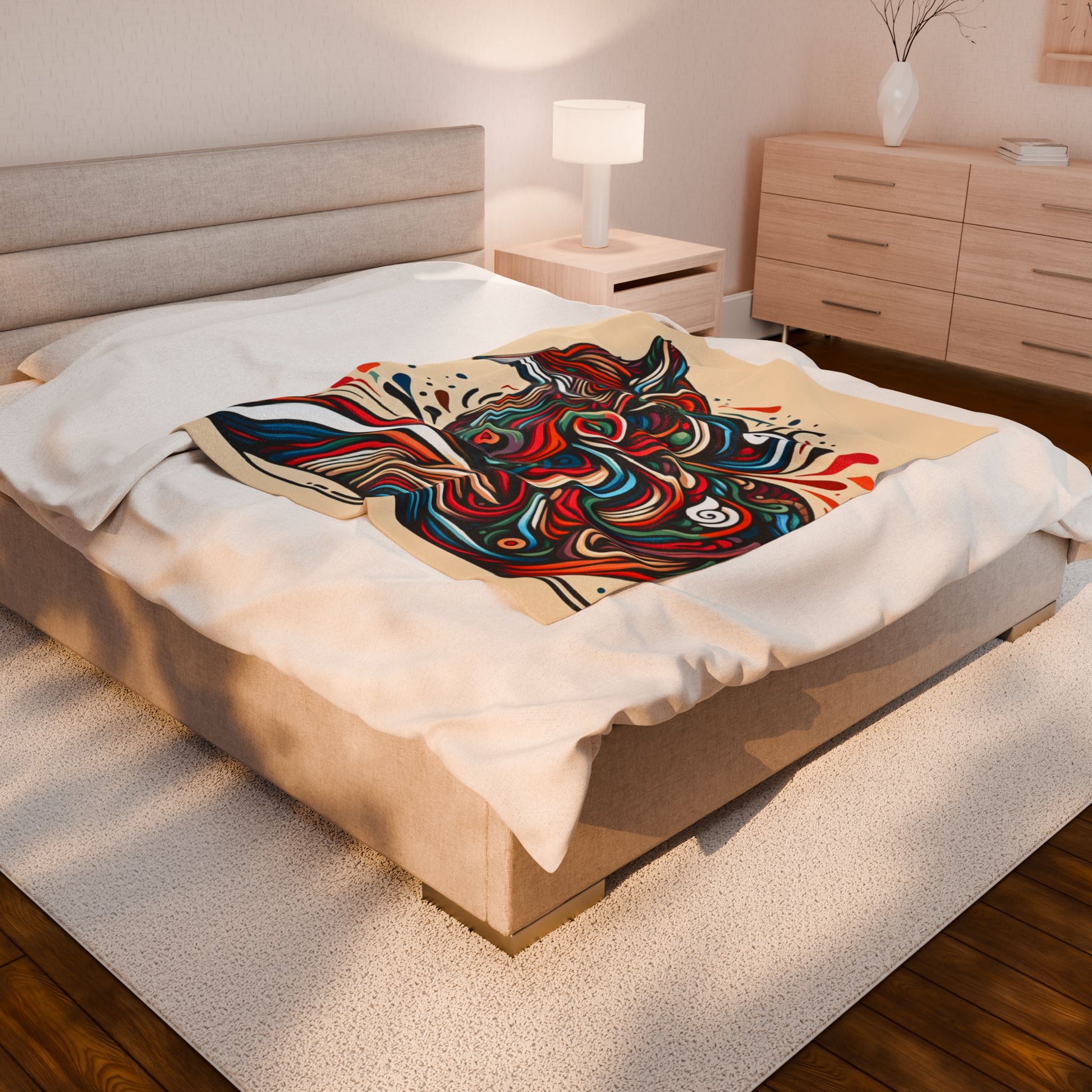 A vibrant fox illustration bursts with swirling, colorful patterns, creating a dynamic visual dance. The harmonious blend of bold hues and fluid lines evokes a sense of motion and energy, transforming the fox into an abstract masterpiece. Create a cozy and warm atmosphere at home with this plush velveteen blanket. It is soft to touch and perfect for any home. Customize with a one-sided print to add your personal touch or create a gift for your friends and family. Available in three sizes: 30x40", 50x60", 60x80".
