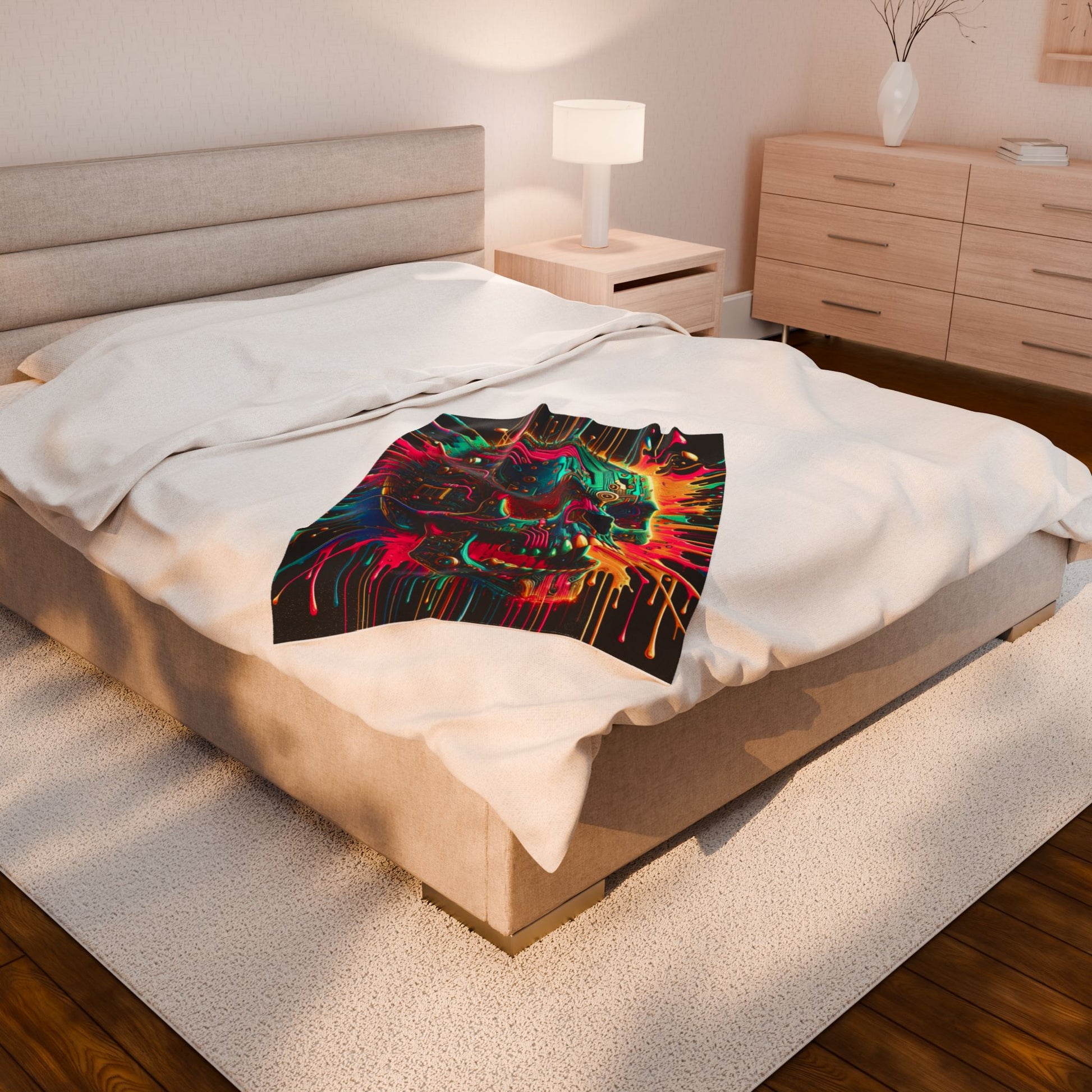 A vibrant fusion of technology and art, this image features a skull intricately adorned with circuit patterns. Bright splashes of neon colors radiate outward, creating a dynamic and futuristic explosion against a black backdrop. Create a cozy and warm atmosphere at home with this plush velveteen blanket. It is soft to touch and perfect for any home. Customize with a one-sided print to add your personal touch or create a gift for your friends and family. Available in three sizes: 30x40", 50x60", 60x80".