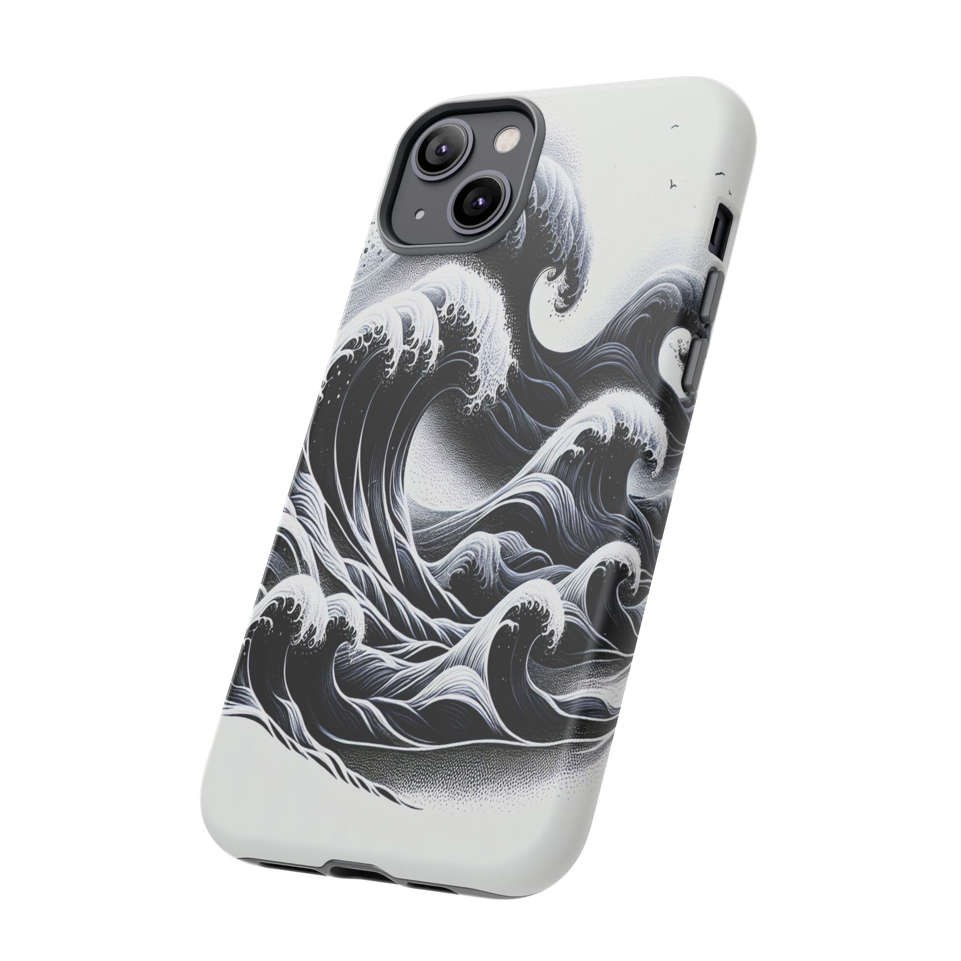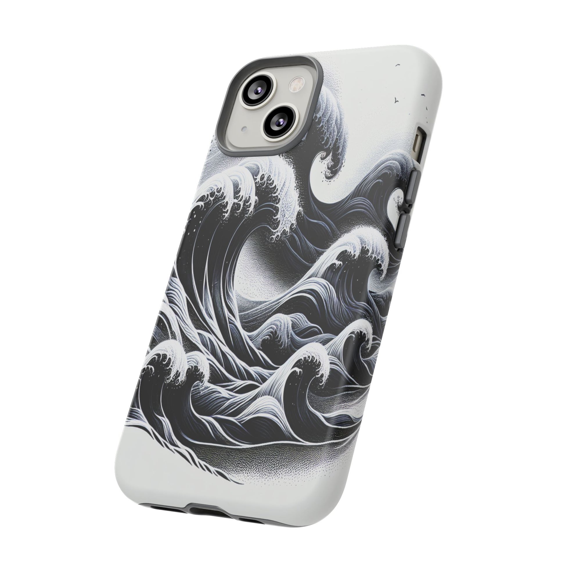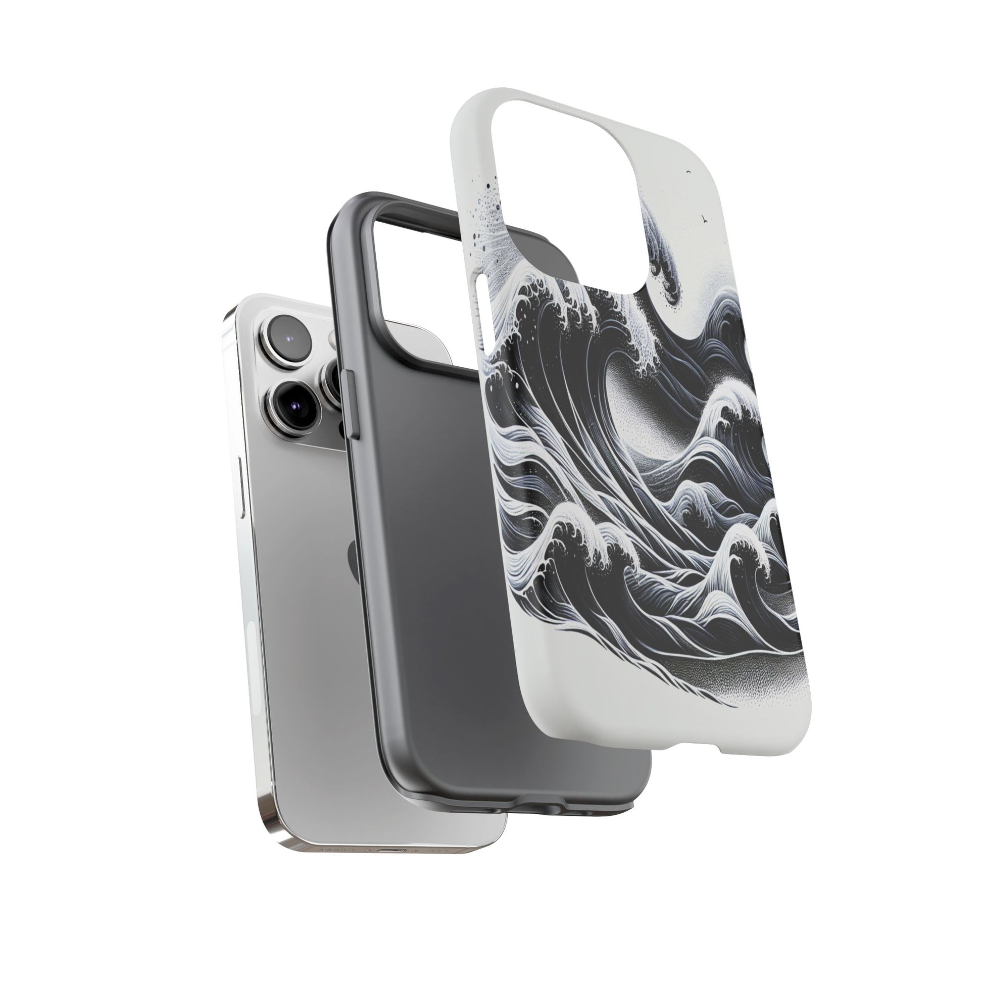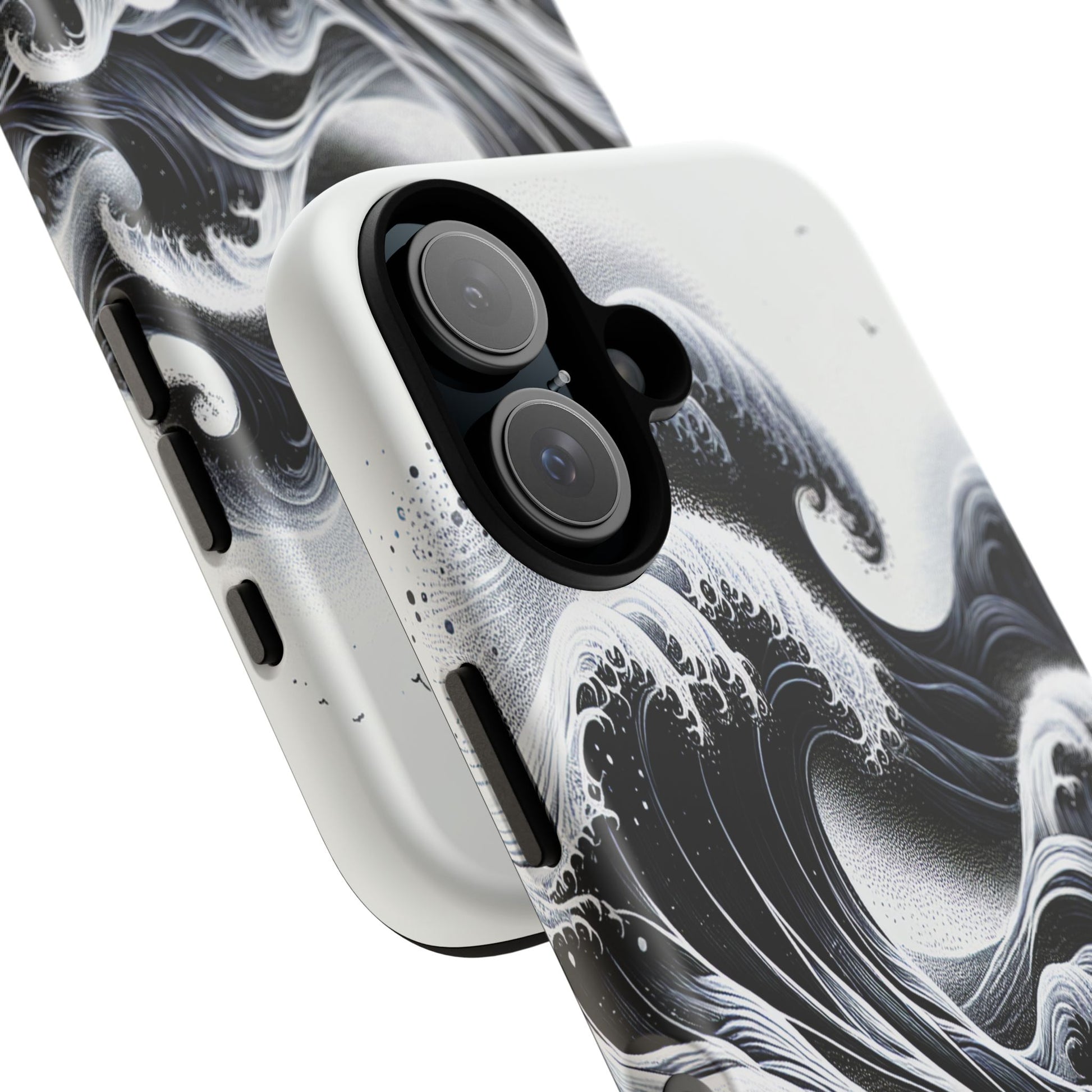Dynamic waves, intricately detailed with swirling lines and stippling, evoke a sense of motion and energy. The monochromatic palette highlights the contrast between light and shadow, creating a captivating, almost hypnotic seascape that blends traditional and modern artistic styles. iPhone, Samsung Galaxy, and Google Pixel devices with premium-quality custom protective phone cases. Every case has double layers for extra durability and protection while the clear, open ports stay out of your way when it comes to charging. The outer polycarbonate shell will resist daily impacts. Choose between matte or glossy finish and enjoy adding a unique touch to your phone with our custom protective phone cases sourced from Korea.