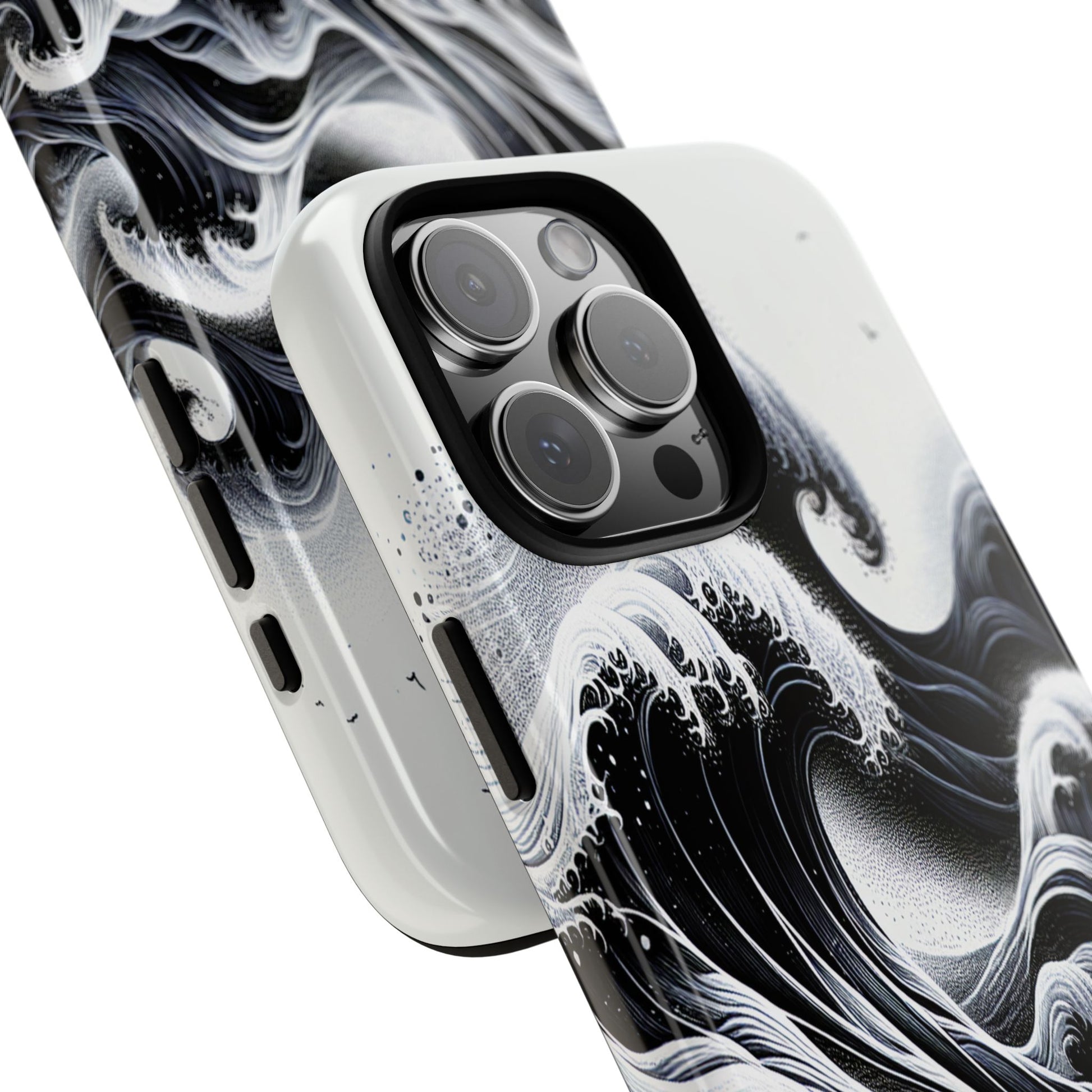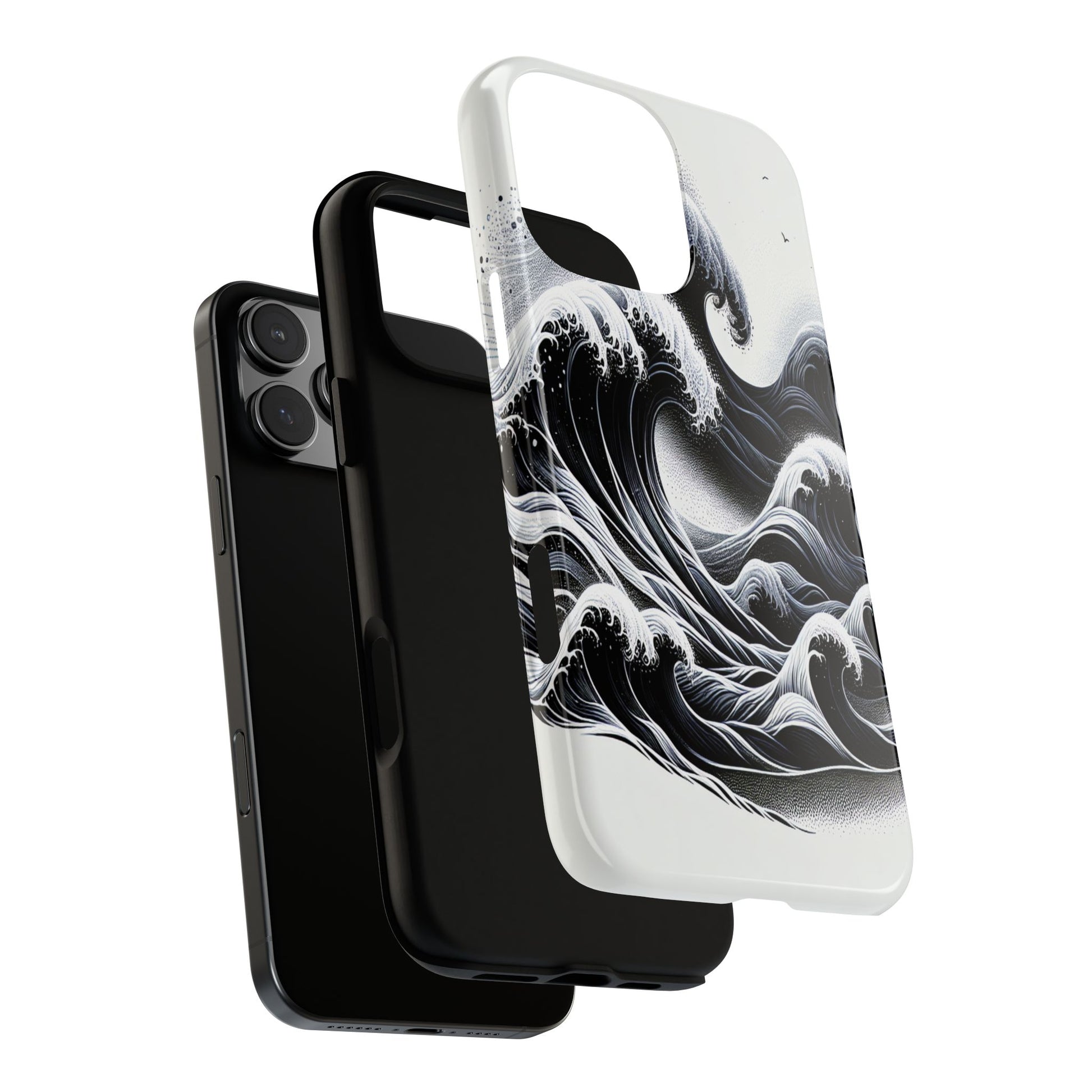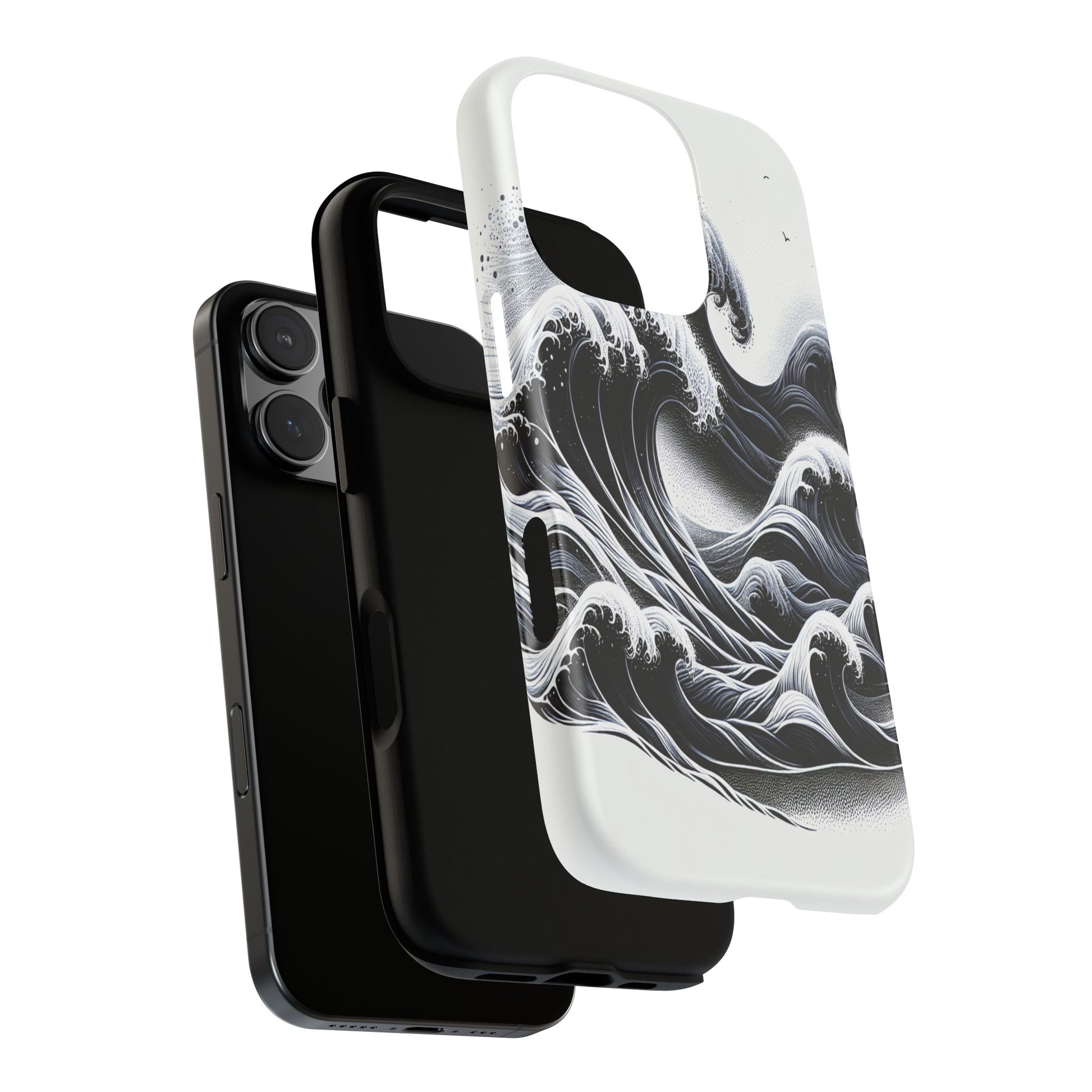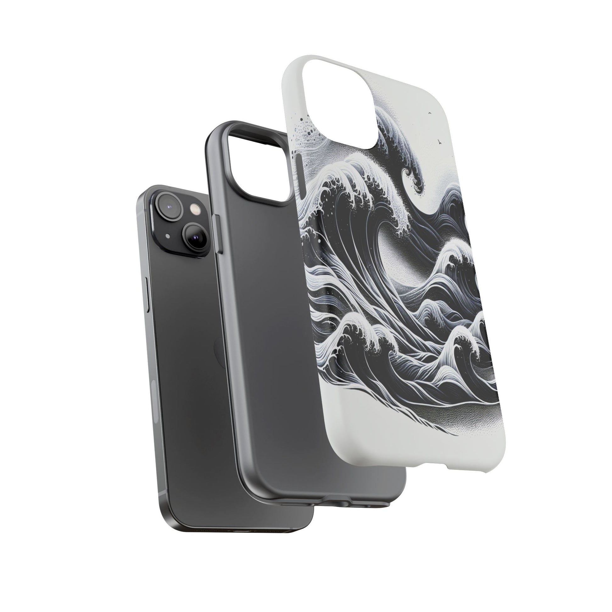 Dynamic waves, intricately detailed with swirling lines and stippling, evoke a sense of motion and energy. The monochromatic palette highlights the contrast between light and shadow, creating a captivating, almost hypnotic seascape that blends traditional and modern artistic styles. iPhone, Samsung Galaxy, and Google Pixel devices with premium-quality custom protective phone cases. Every case has double layers for extra durability and protection while the clear, open ports stay out of your way when it comes to charging. The outer polycarbonate shell will resist daily impacts. Choose between matte or glossy finish and enjoy adding a unique touch to your phone with our custom protective phone cases sourced from Korea.