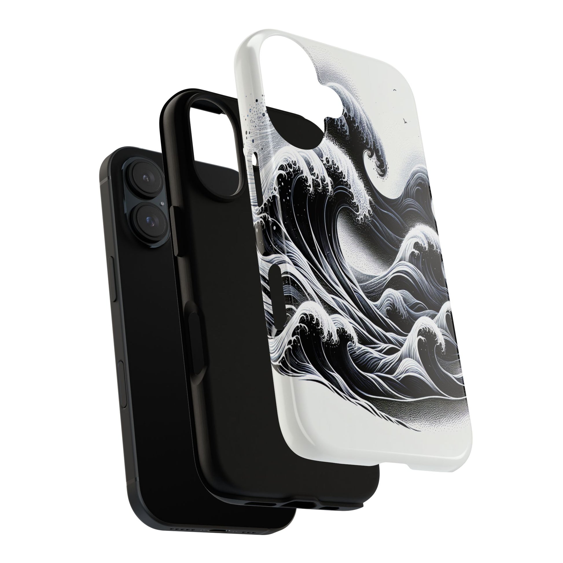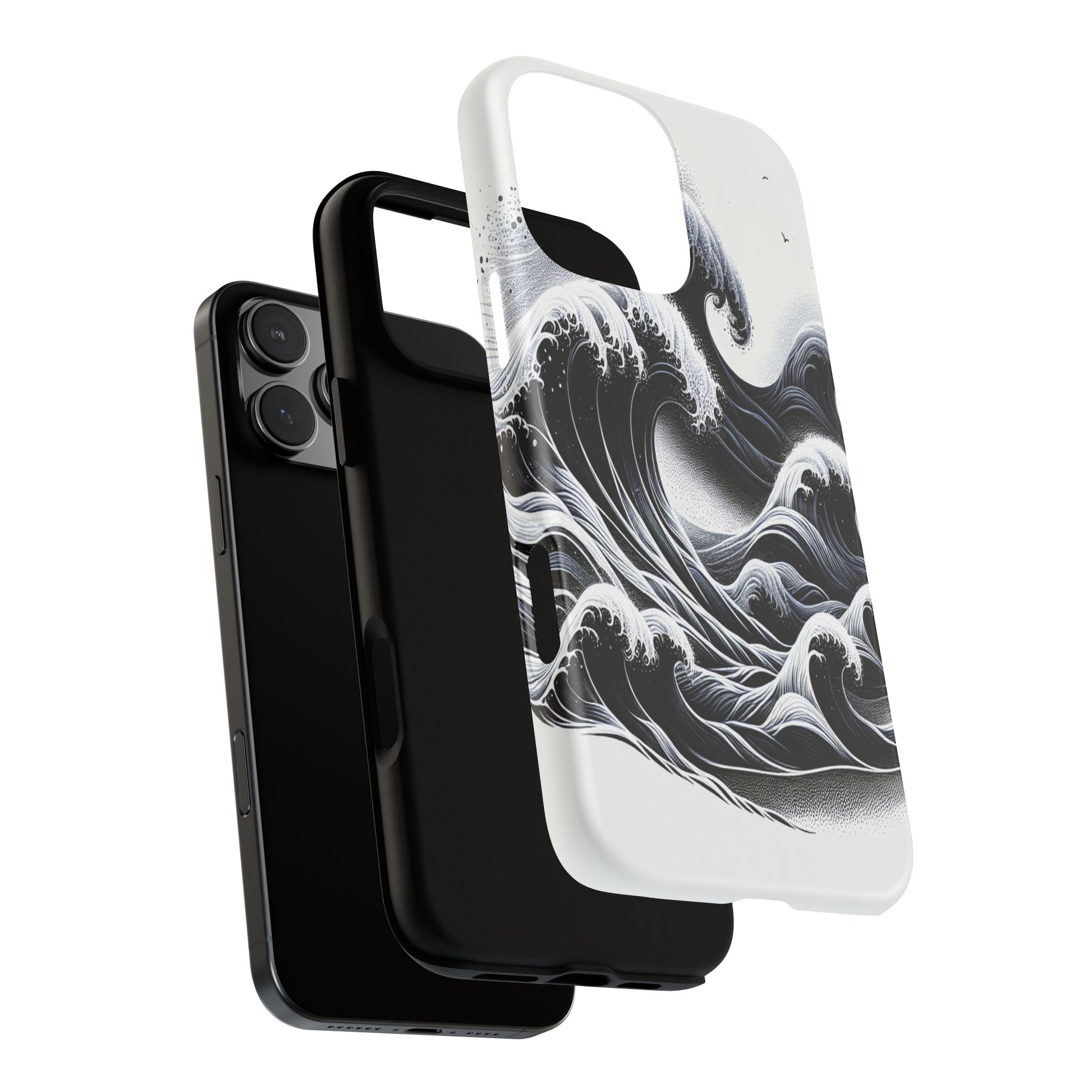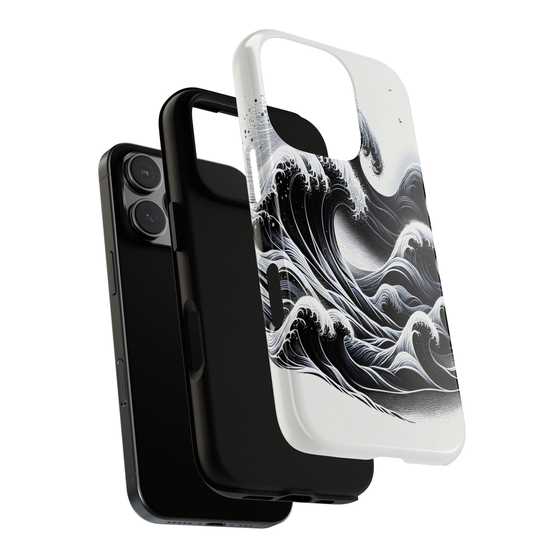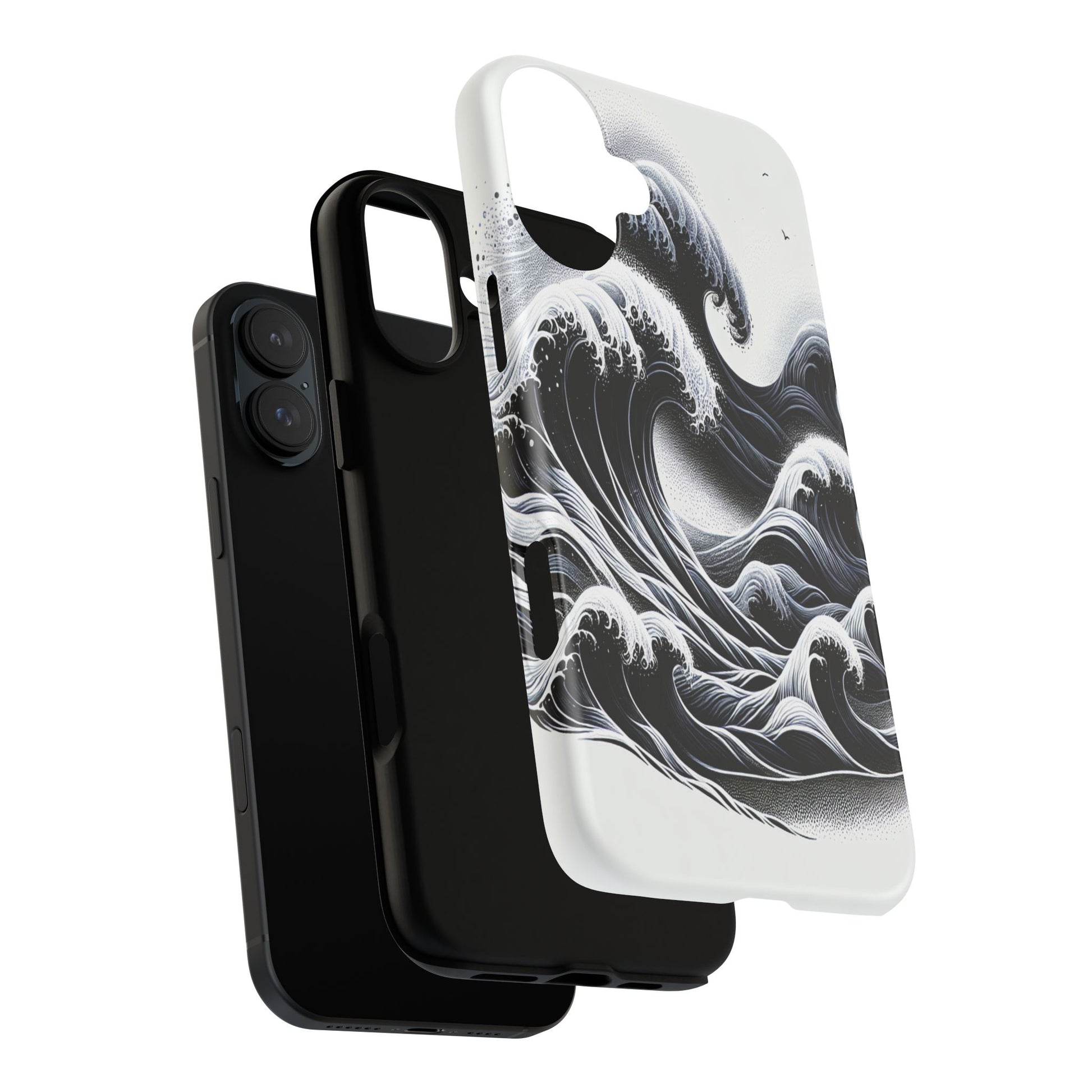 Dynamic waves, intricately detailed with swirling lines and stippling, evoke a sense of motion and energy. The monochromatic palette highlights the contrast between light and shadow, creating a captivating, almost hypnotic seascape that blends traditional and modern artistic styles. iPhone, Samsung Galaxy, and Google Pixel devices with premium-quality custom protective phone cases. Every case has double layers for extra durability and protection while the clear, open ports stay out of your way when it comes to charging. The outer polycarbonate shell will resist daily impacts. Choose between matte or glossy finish and enjoy adding a unique touch to your phone with our custom protective phone cases sourced from Korea.