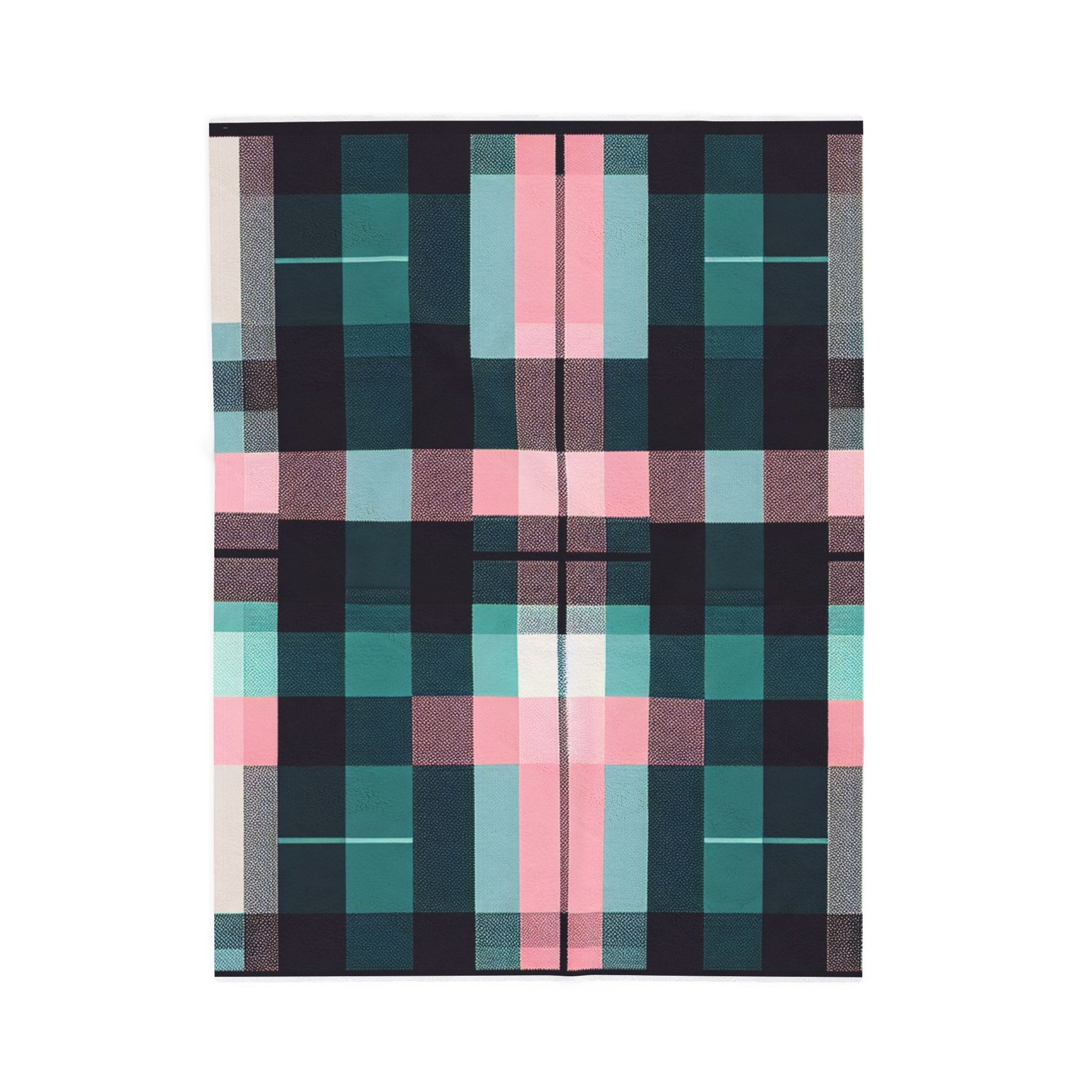 This image presents a pixelated rendition of a classic plaid pattern, intertwining soft pastel pinks with deep teals and blacks, creating a modern, digital twist on a traditional design. The effect gives it a textured, retro screen aesthetic. Create a cozy and warm atmosphere at home with this plush velveteen blanket. It is soft to touch and perfect for any home. Customize with a one-sided print to add your personal touch or create a gift for your friends and family. Available in three sizes: 30x40", 50x60", 60x80".