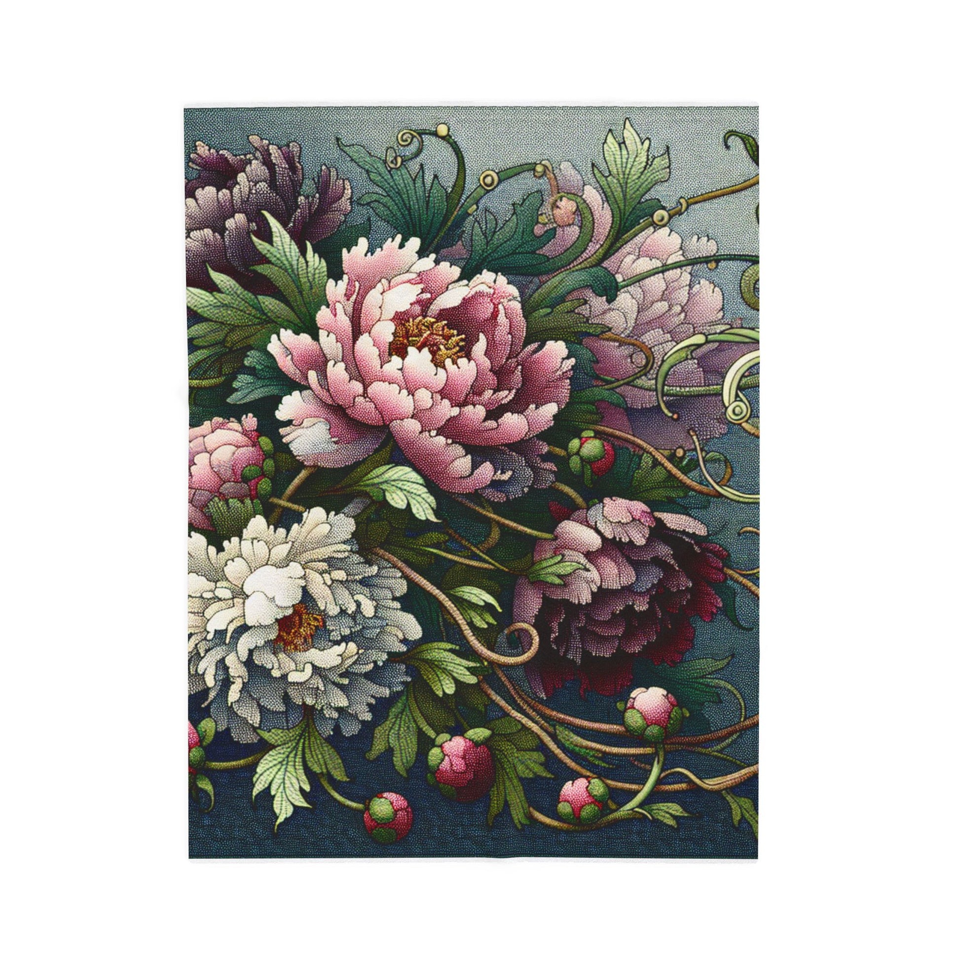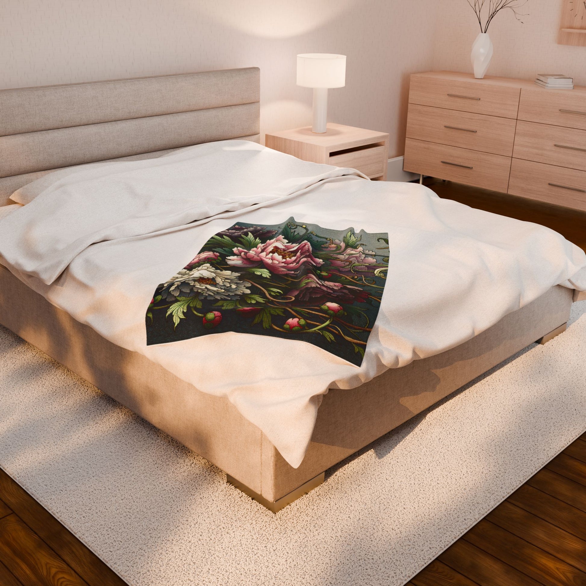 Intricate floral tapestry featuring lush peonies in pink and white hues, entwined with swirling vines and ornate metal elements. The detailed dot pattern adds depth and texture, creating an exquisite blend of natural beauty and artistic elegance. Create a cozy and warm atmosphere at home with this plush velveteen blanket. It is soft to touch and perfect for any home. Customize with a one-sided print to add your personal touch or create a gift for your friends and family. Available in three sizes: 30x40", 50x60", 60x80".