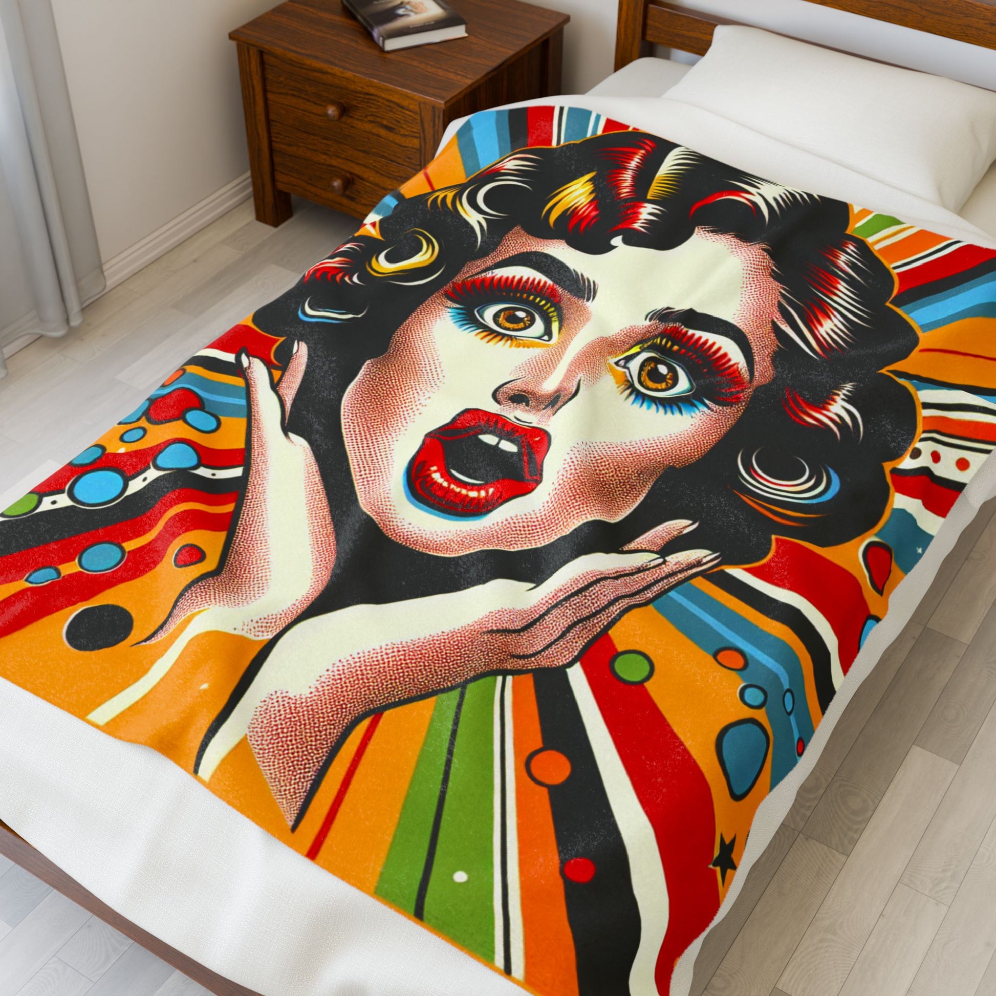 This vibrant pop art showcases a woman with retro curls, wide eyes, and bold makeup. Exploding with colorful rays and dynamic circles, it captures a sense of surprise and excitement, blending classic comic style with modern flair for captivating visual impact. Create a cozy and warm atmosphere at home with this plush velveteen blanket. It is soft to touch and perfect for any home. Customize with a one-sided print to add your personal touch or create a gift for your friends and family. Available in three sizes: 30x40", 50x60", 60x80".