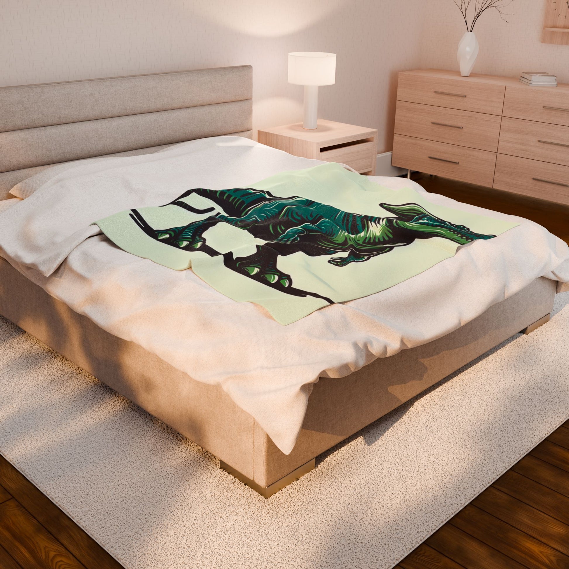 This illustration depicts a stylized dinosaur with vivid teal and mint green hues, characterized by bold striping and contour lines, standing against a soft, neutral background. The creature's pose and expression exude a blend of playfulness and raw prehistoric power. Create a cozy and warm atmosphere at home with this plush velveteen blanket. It is soft to touch and perfect for any home. Customize with a one-sided print to add your personal touch or create a gift for your friends and family. Available in three sizes: 30x40", 50x60", 60x80".