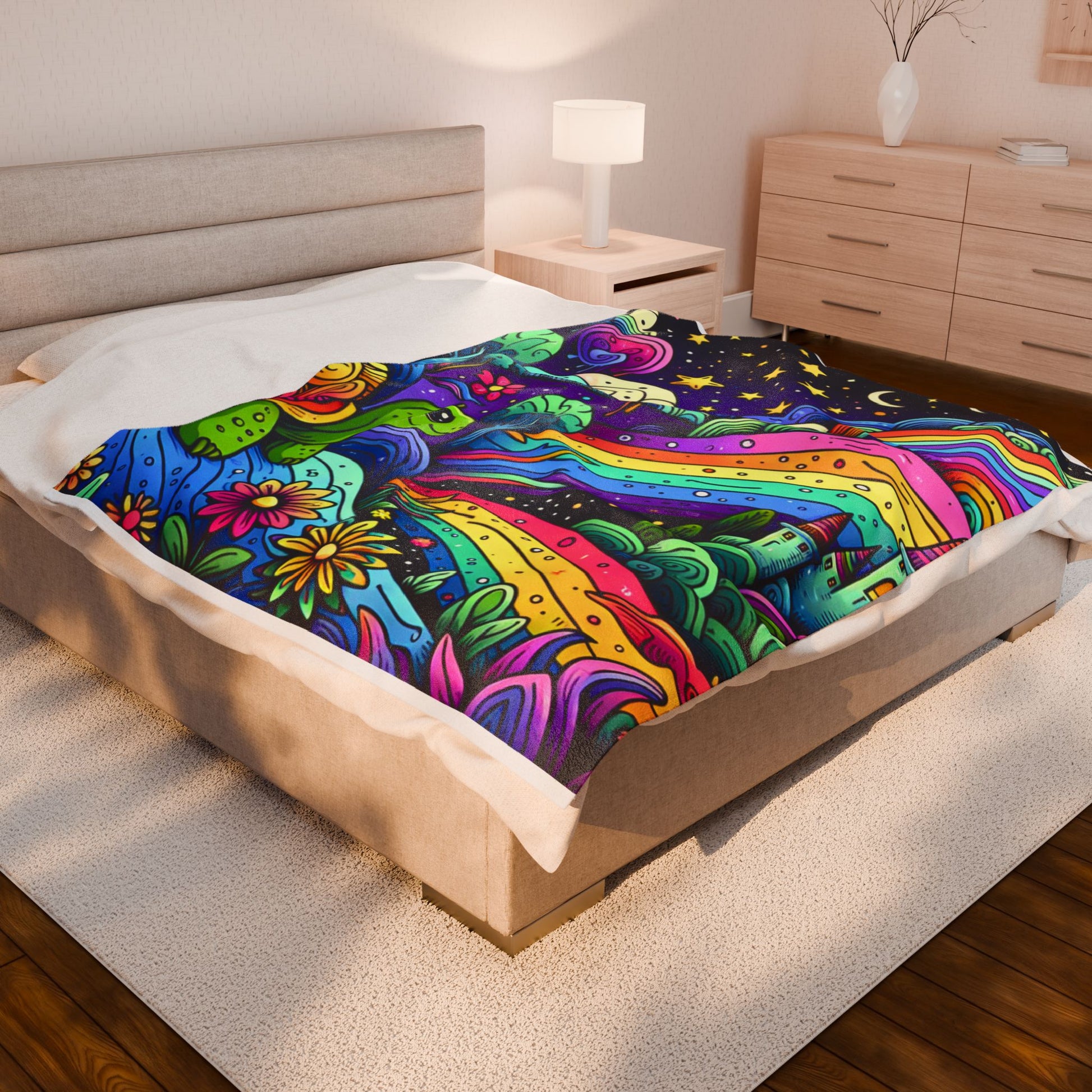 Whimsical illustration bursts with vibrant colors, featuring a smiling turtle amidst swirling trees, blooming flowers, and a rainbow path leading to a fairytale castle beneath a starlit, crescent moon sky. Enchanting, dreamlike landscape evokes a playful, imaginative world. Create a cozy and warm atmosphere at home with this plush velveteen blanket. It is soft to touch and perfect for any home. Customize with a one-sided print to add your personal touch or create a gift for your friends and family. Available in three sizes: 30x40", 50x60", 60x80".