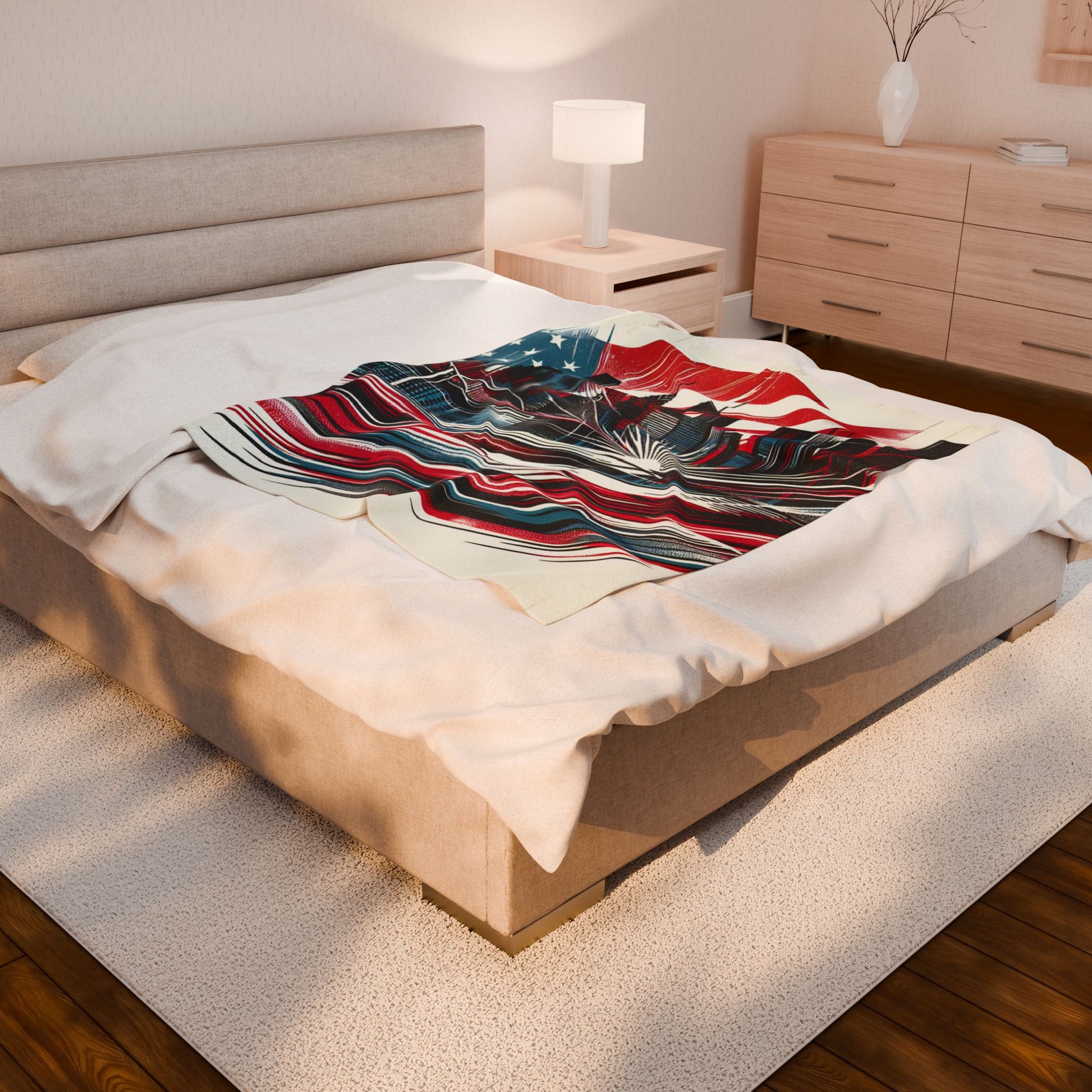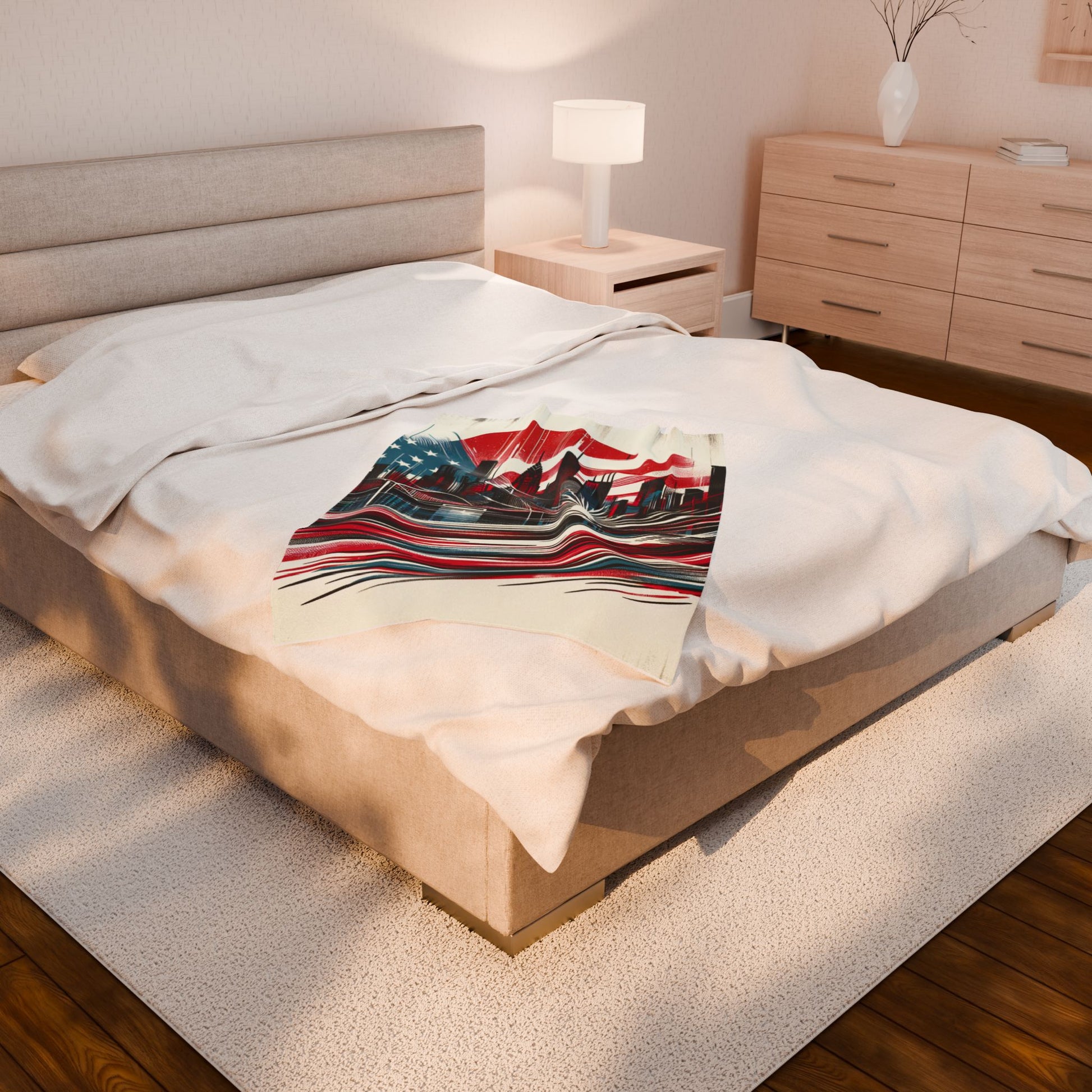 Dynamic cityscape blends architecture with swirling American flag elements, creating a vibrant blend of movement and patriotism. Abstract lines and bold strokes highlight urban energy, while integrating iconic stars and stripes with a sunrise that bridges tradition and modernity. Create a cozy and warm atmosphere at home with this plush velveteen blanket. It is soft to touch and perfect for any home. Customize with a one-sided print to add your personal touch or create a gift for your friends and family. Available in three sizes: 30x40", 50x60", 60x80".