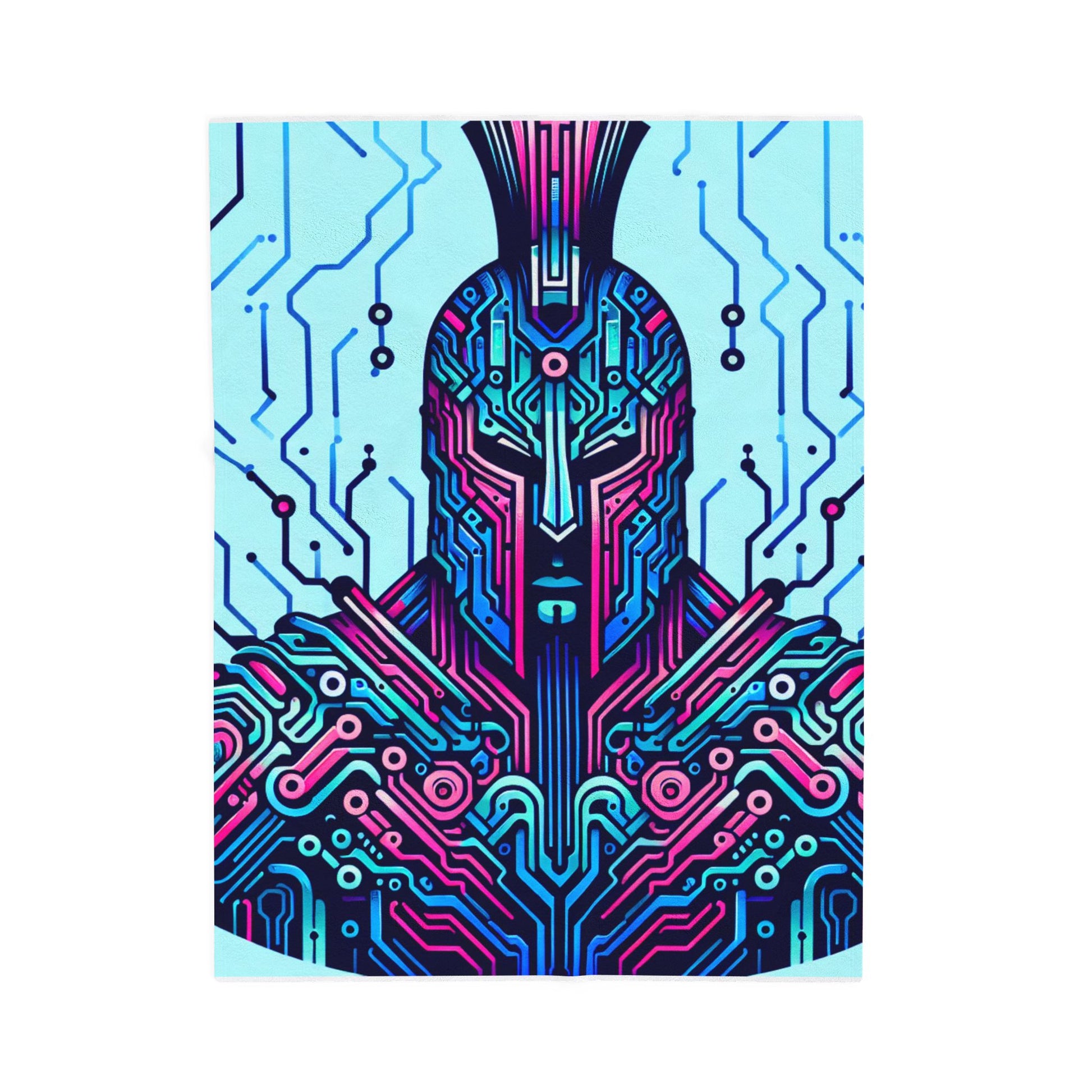 This image showcases a futuristic warrior, merging ancient armor with neon circuitry. The vibrant pink and blue palette highlights intricate, mosaic-like patterns, creating a captivating blend of technology and mythology. Create a cozy and warm atmosphere at home with this plush velveteen blanket. It is soft to touch and perfect for any home. Customize with a one-sided print to add your personal touch or create a gift for your friends and family. Available in three sizes: 30x40", 50x60", 60x80".
