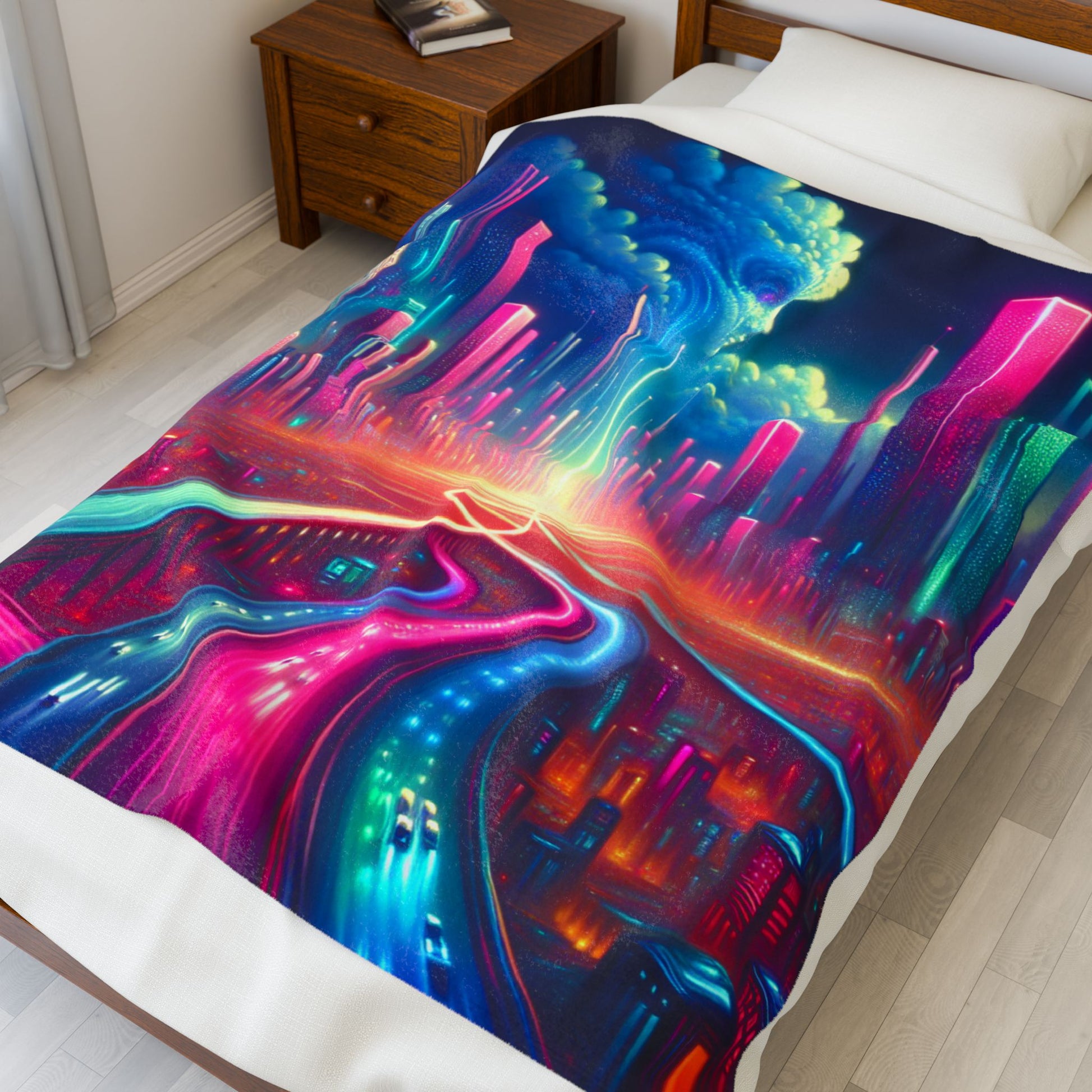 A vibrant neon cityscape with fluid highways and luminous skyscrapers, merging into a cosmic cloud formation shaped like a face. The kaleidoscopic colors and futuristic design evoke a dreamy, otherworldly ambiance, blending elements of fantasy and sci-fi. Create a cozy and warm atmosphere at home with this plush velveteen blanket. It is soft to touch and perfect for any home. Customize with a one-sided print to add your personal touch or create a gift for your friends and family. Available in three sizes: 30x40", 50x60", 60x80".