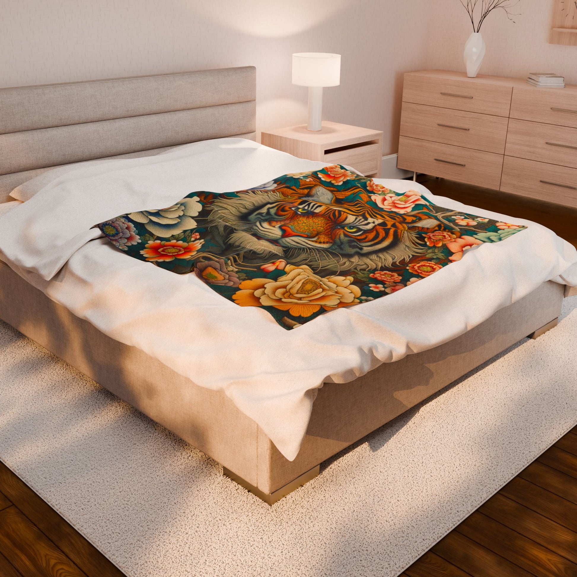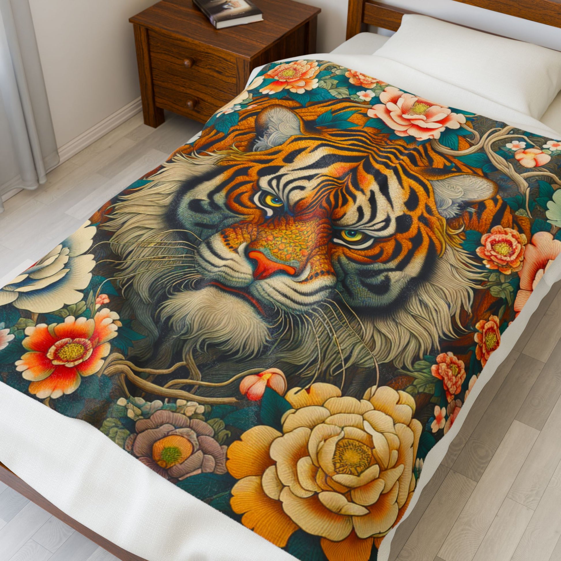 Vividly enchanting, this artwork showcases a majestic tiger amidst a tapestry of intricate floral designs. The harmonious blend of bold colors and delicate patterns exudes a captivating fusion of strength and elegance, creating an imaginative scene rich in detail and creativity. Create a cozy and warm atmosphere at home with this plush velveteen blanket. It is soft to touch and perfect for any home. Customize with a one-sided print to add your personal touch or create a gift for your friends and family. Available in three sizes: 30x40", 50x60", 60x80".