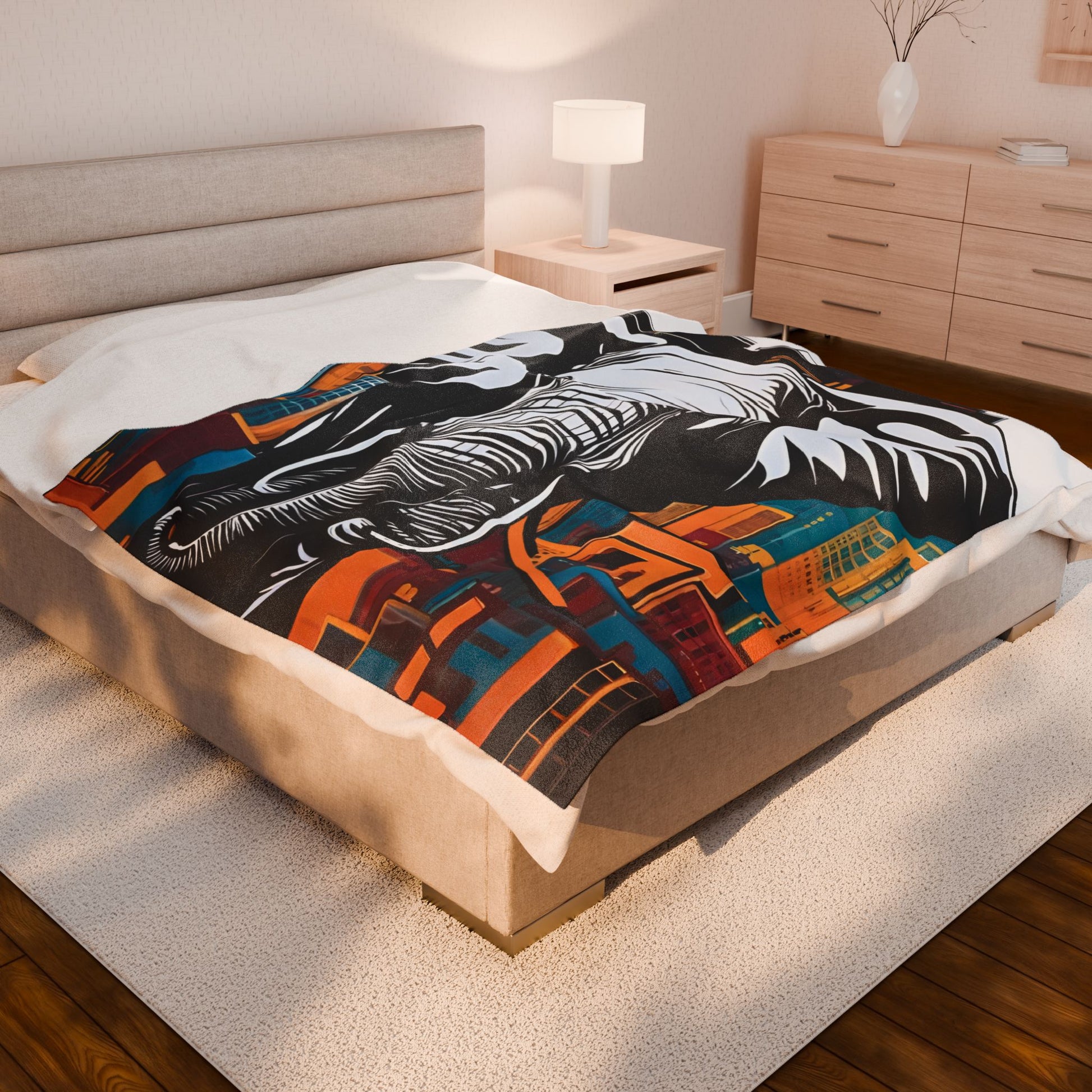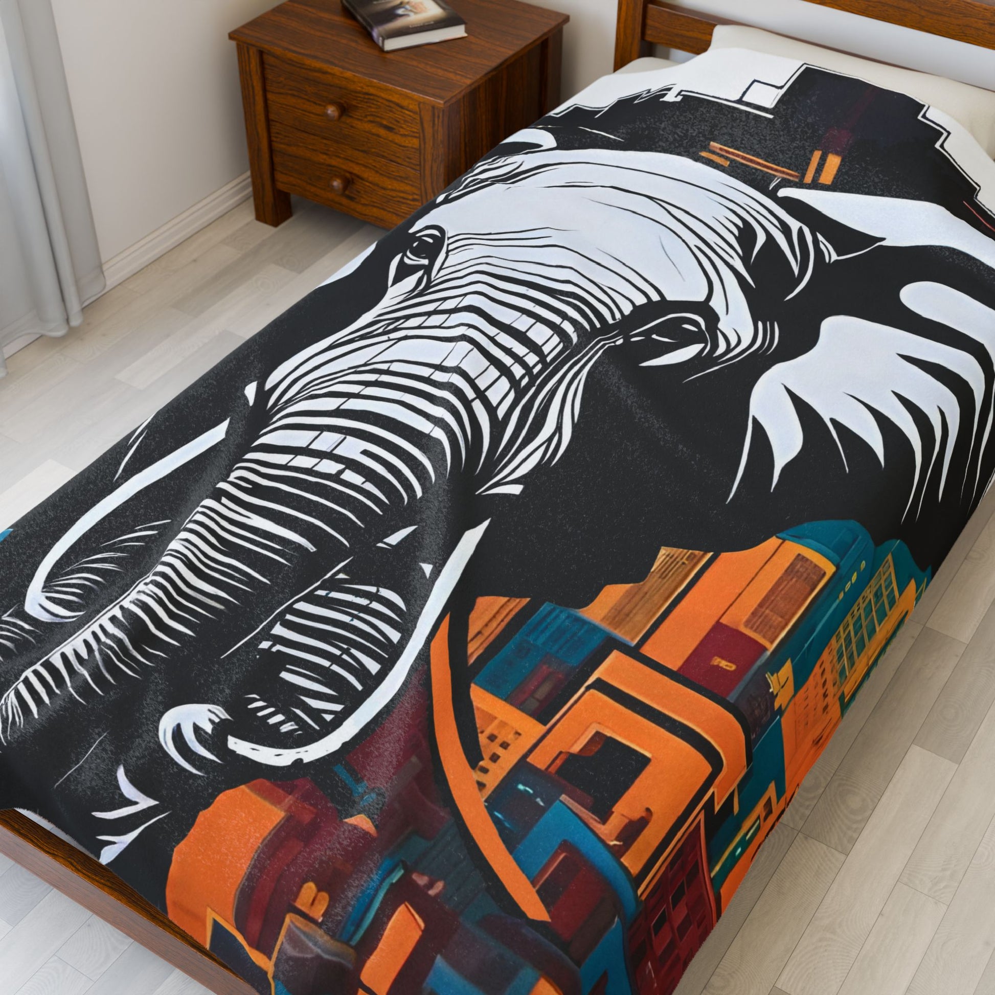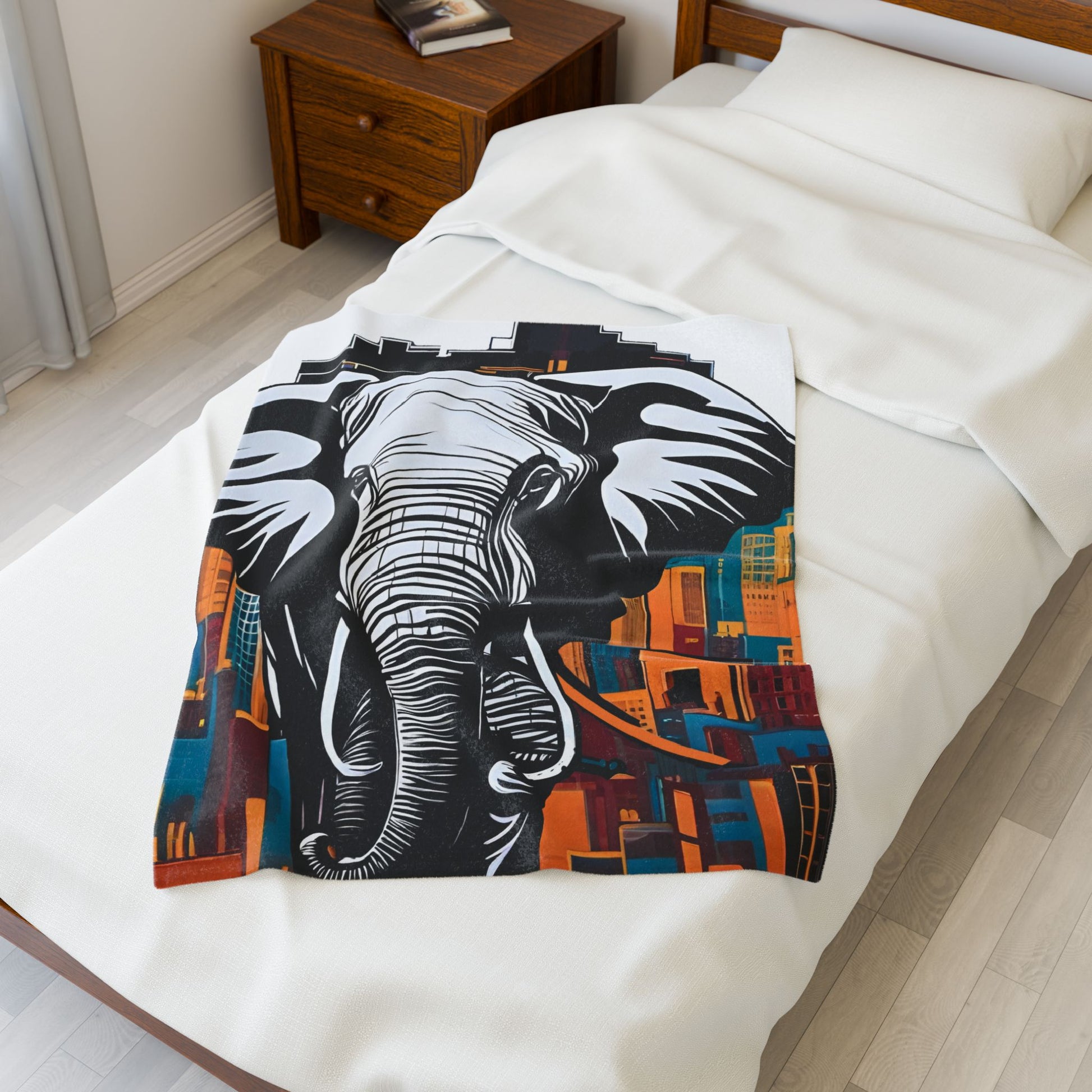 An elephant looms large over a stylized cityscape, its monochromatic form casting a bold contrast against the colorful buildings, creating a dramatic fusion of nature and urban life. Create a cozy and warm atmosphere at home with this plush velveteen blanket. It is soft to touch and perfect for any home. Customize with a one-sided print to add your personal touch or create a gift for your friends and family. Available in three sizes: 30x40", 50x60", 60x80".