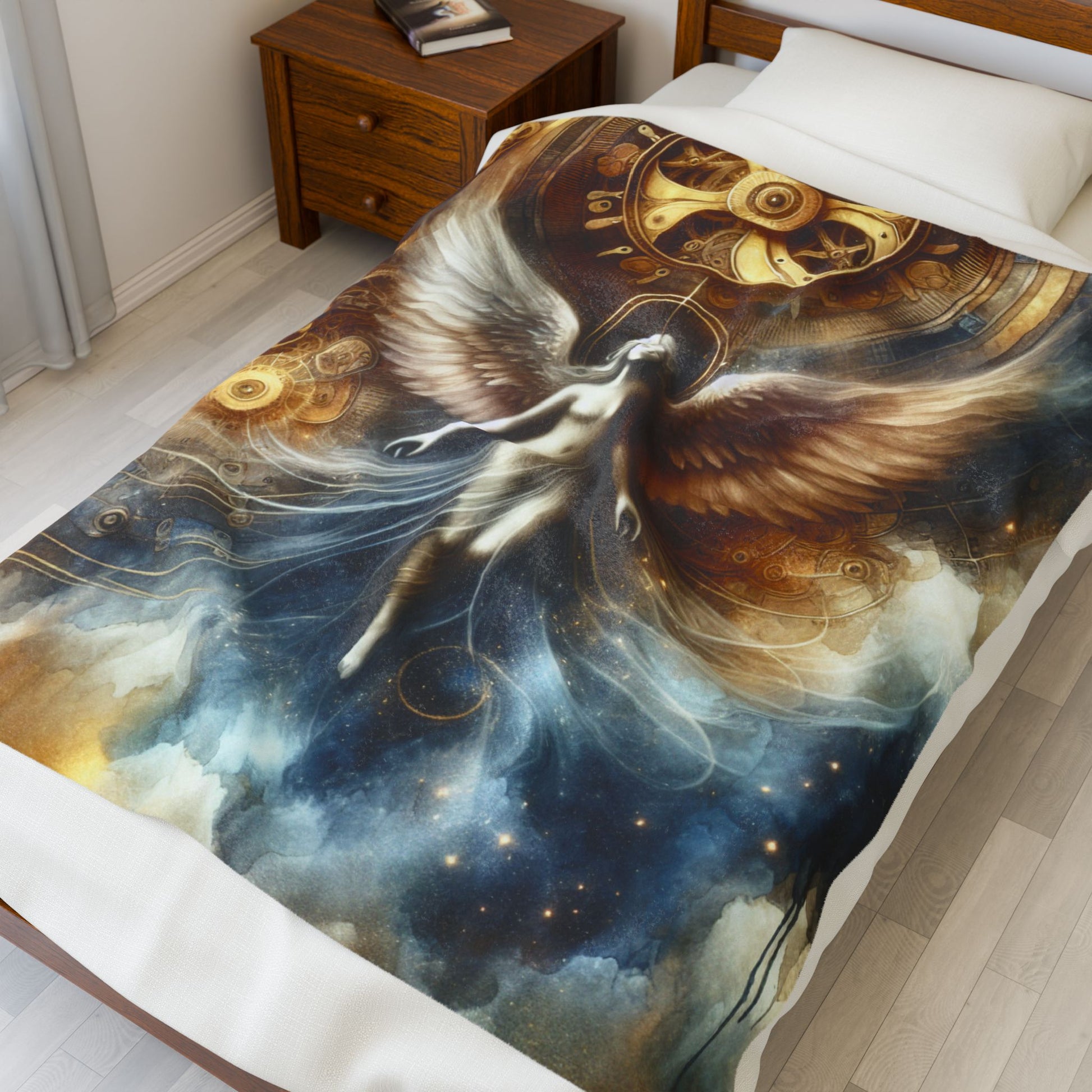 A celestial figure with ethereal wings gracefully ascends amidst swirling clouds and intricate golden gears, merging steampunk aesthetics with ethereal beauty in an awe-inspiring dreamscape. Create a cozy and warm atmosphere at home with this plush velveteen blanket. It is soft to touch and perfect for any home. Customize with a one-sided print to add your personal touch or create a gift for your friends and family. Available in three sizes: 30x40", 50x60", 60x80".