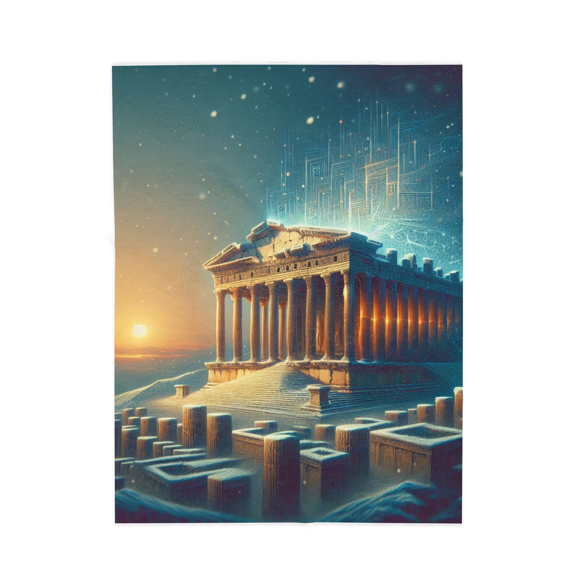 An ethereal ancient temple bathed in a warm sunrise glow stands amidst snowflakes, juxtaposed with glowing futuristic circuitry motifs floating in the cold air, creating a blend of past and future. Create a cozy and warm atmosphere at home with this plush velveteen blanket. It is soft to touch and perfect for any home. Customize with a one-sided print to add your personal touch or create a gift for your friends and family. Available in three sizes: 30x40", 50x60", 60x80".