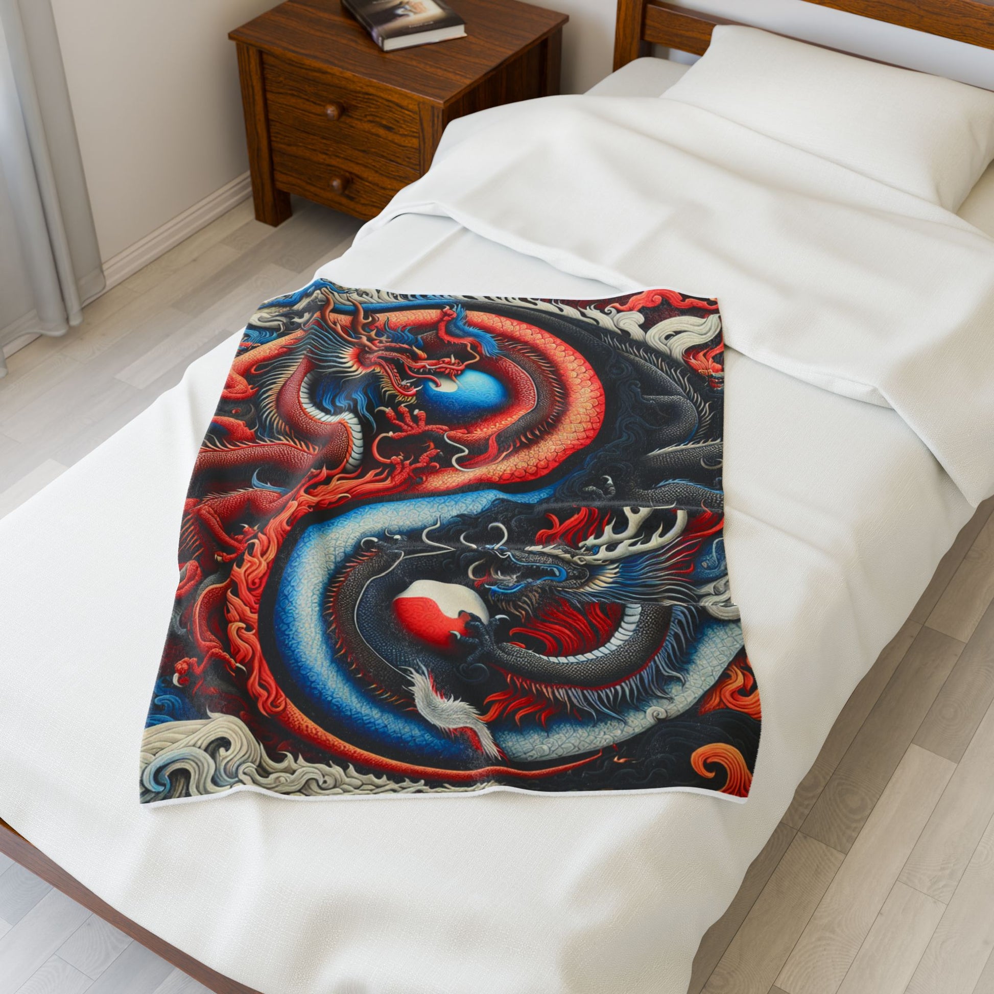 This image captures a dynamic yin-yang symbol, creatively embodied by two dragons in vibrant red and blue hues, intricately woven into the iconic shape, suggesting balance and duality. Create a cozy and warm atmosphere at home with this plush velveteen blanket. It is soft to touch and perfect for any home. Customize with a one-sided print to add your personal touch or create a gift for your friends and family. Available in three sizes: 30x40", 50x60", 60x80".