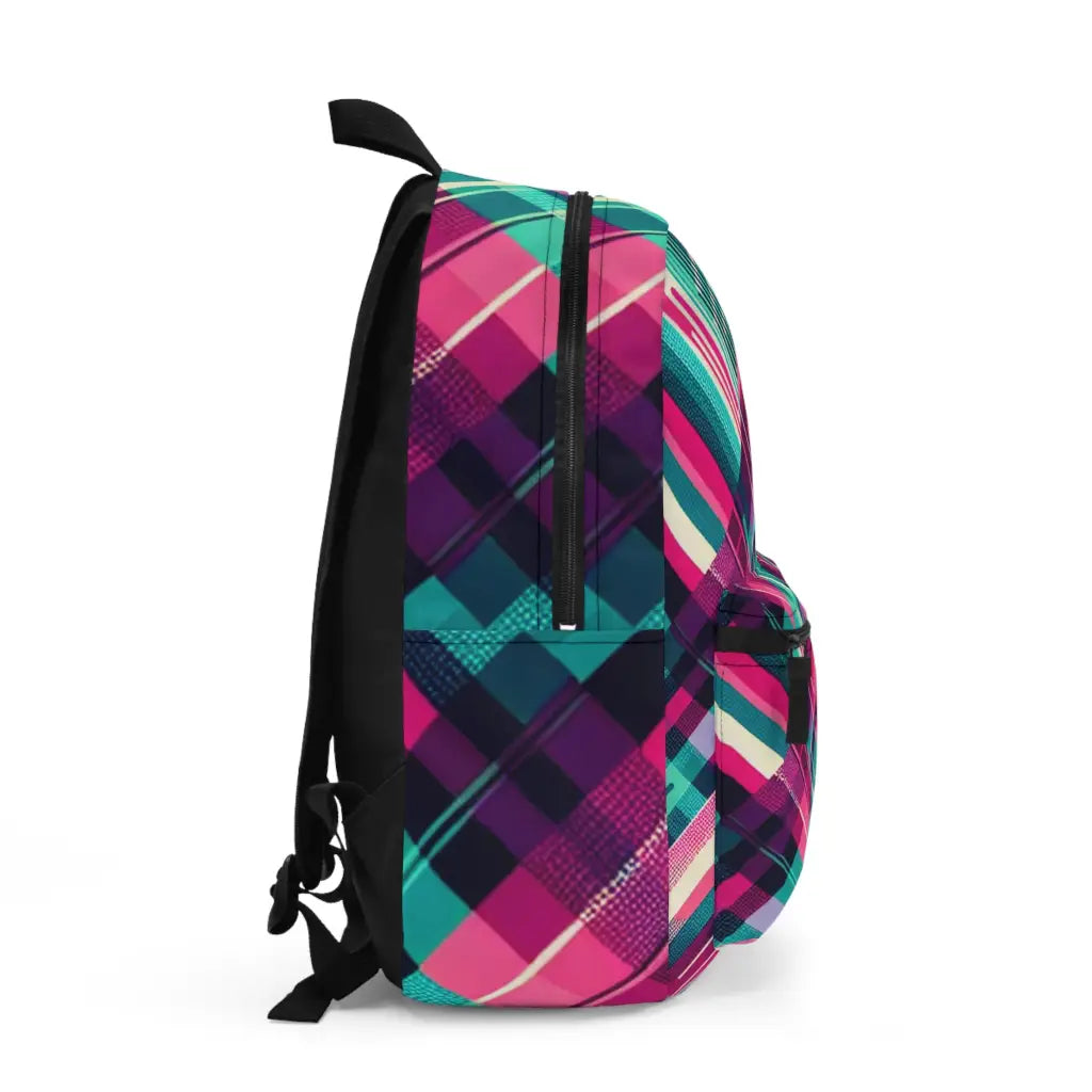 The image depicts a vibrant, digital abstract pattern with a central geometric convergence. Contrasting cyan, magenta, and black hues are intersected by bold stripes and intricate pixelated details, creating a dynamic, optical illusion-like effect. Introducing the ultimate backpack for fashion-forward adventurers! Our backpack boasts a striking textile design that will make a statement wherever you go. With its durable construction and spacious compartments, it is perfect for carrying all your essentials. Get ready to turn heads and stay organized with our backpack. #textiledesign #backpack #fashionforward #adventure #durable #spacious #statementpiece #organized #essentials #travel #explore