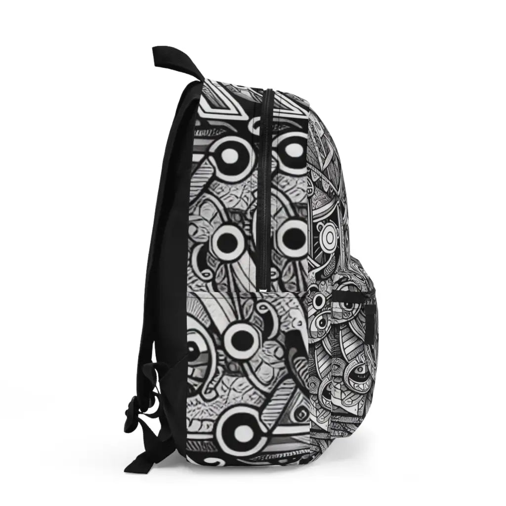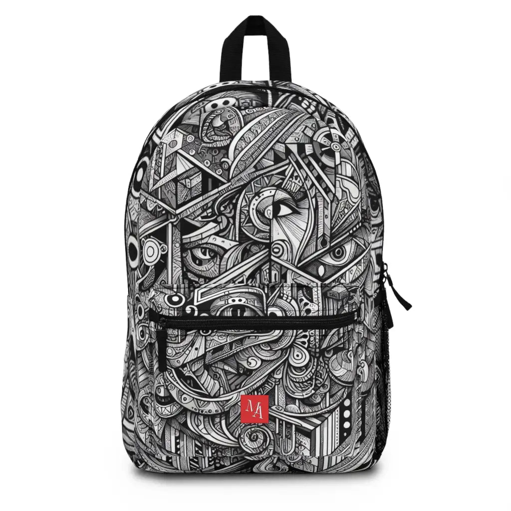 This image showcases a dynamic, monochrome doodle composition filled with abstract faces, geometric shapes, and whimsical patterns, creating a lively, interconnected labyrinth of creativity and imagination. Introducing the ultimate backpack for fashion-forward adventurers! Our backpack boasts a striking textile design that will make a statement wherever you go. With its durable construction and spacious compartments, it is perfect for carrying all your essentials. Get ready to turn heads and stay organized with our backpack. #textiledesign #backpack #fashionforward #adventure #durable #spacious #statementpiece #organized #essentials #travel #explore