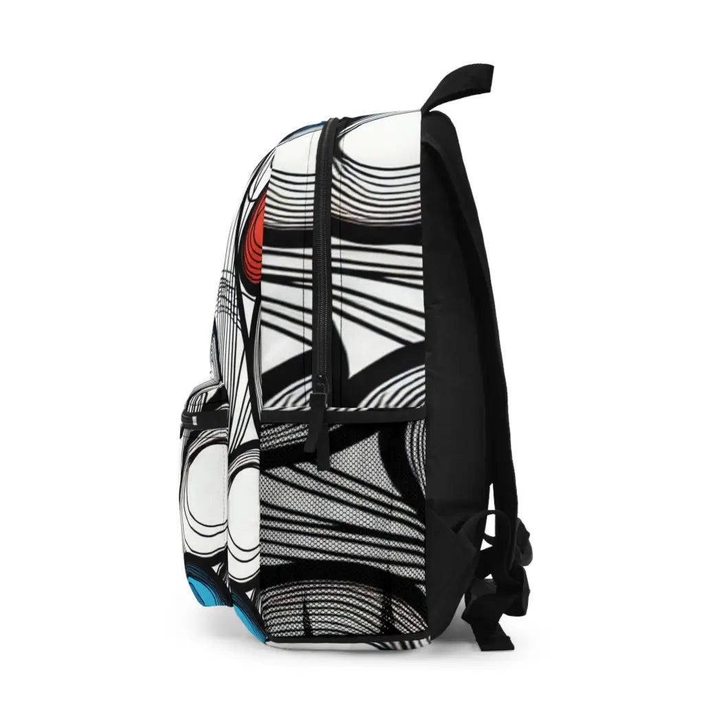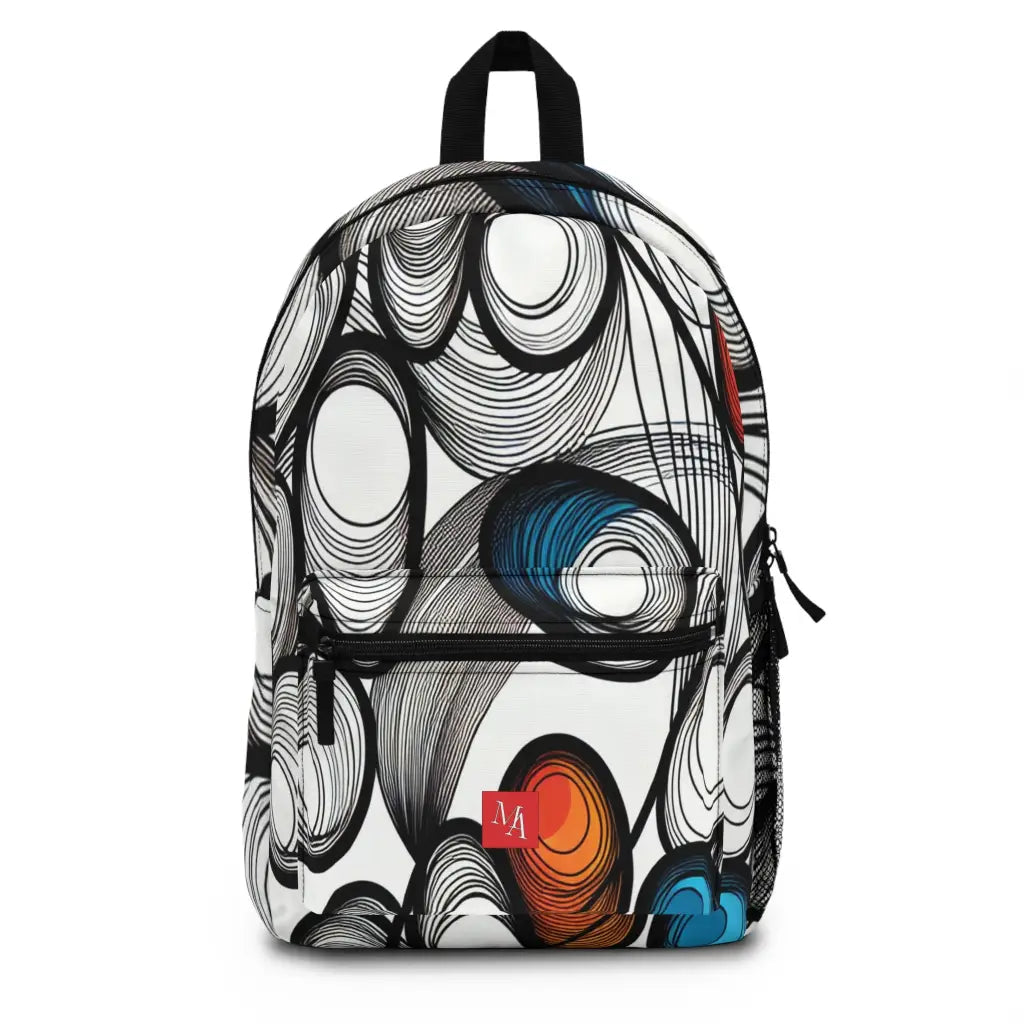 Dynamic swirling ovals intertwine energetically, creating a vibrant tapestry of black lines accented by splashes of blue, orange, and red. The hypnotic, rhythmic patterns evoke motion and depth, transforming simple shapes into an intricate dance of color and form. Introducing the ultimate backpack for fashion-forward adventurers! Our backpack boasts a striking textile design that will make a statement wherever you go. With its durable construction and spacious compartments, it is perfect for carrying all your essentials. Get ready to turn heads and stay organized with our backpack. #textiledesign #backpack #fashionforward #adventure #durable #spacious #statementpiece #organized #essentials #travel #explore