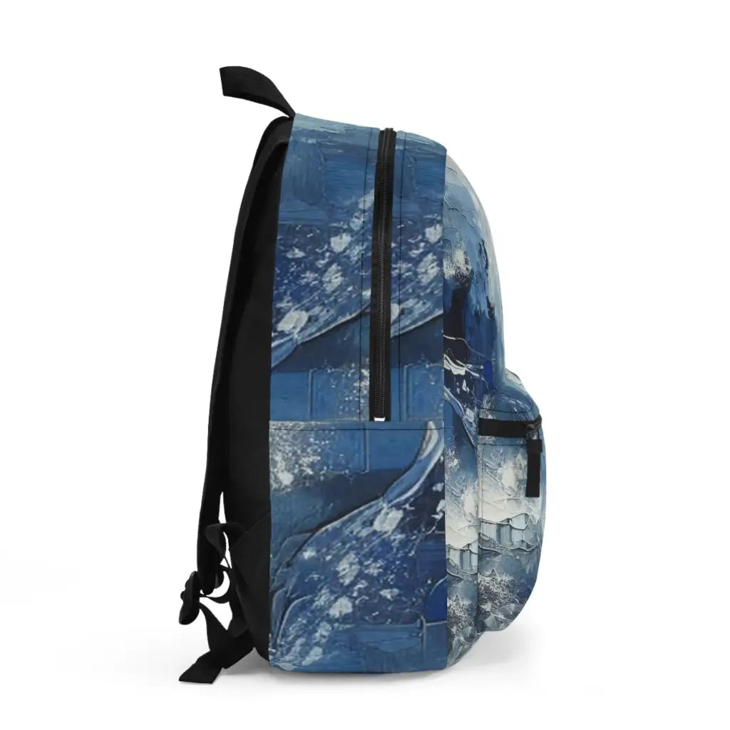 This abstract painting bursts with swirling blues and whites, masterfully blending textures. Dynamic brushstrokes create an impression of turbulent skies or ocean waves, evoking movement and emotional depth. Introducing the ultimate backpack for fashion-forward adventurers! Our backpack boasts a striking textile design that will make a statement wherever you go. With its durable construction and spacious compartments, it is perfect for carrying all your essentials. Get ready to turn heads and stay organized with our backpack. #textiledesign #backpack #fashionforward #adventure #durable #spacious #statementpiece #organized #essentials #travel #explore