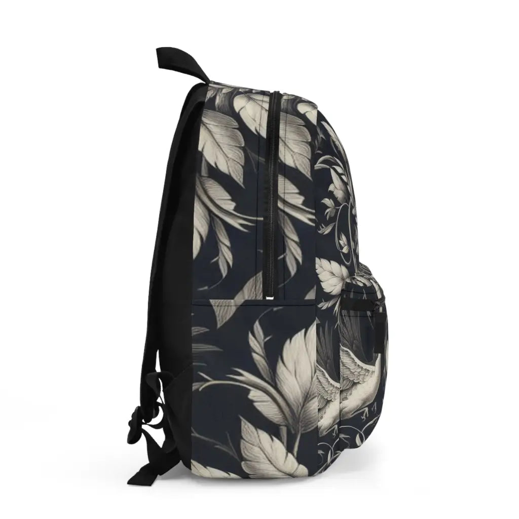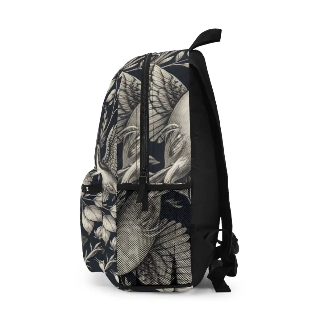 Intricate pattern of delicate, chalk-like botanical sketches and graceful hummingbirds against a dark backdrop. The monochrome design captures a timeless elegance, evoking a sense of whimsical nature intertwined with artistic simplicity. Introducing the ultimate backpack for fashion-forward adventurers! Our backpack boasts a striking textile design that will make a statement wherever you go. With its durable construction and spacious compartments, it is perfect for carrying all your essentials. Get ready to turn heads and stay organized with our backpack. #textiledesign #backpack #fashionforward #adventure #durable #spacious #statementpiece #organized #essentials #travel #explore