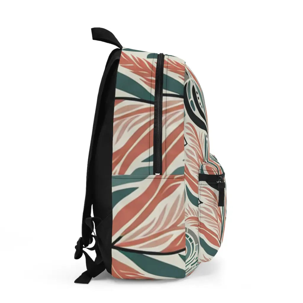 The image features a stylized botanical pattern with an array of leaves and abstract shapes, harmoniously blending a warm, muted color palette. Its flowing design balances organic motifs with geometric accents, exuding a contemporary yet timeless appeal suitable for various decorative contexts. Introducing the ultimate backpack for fashion-forward adventurers! Our backpack boasts a striking textile design that will make a statement wherever you go. With its durable construction and spacious compartments, it is perfect for carrying all your essentials. Get ready to turn heads and stay organized with our backpack. #textiledesign #backpack #fashionforward #adventure #durable #spacious #statementpiece #organized #essentials #travel #explore