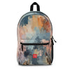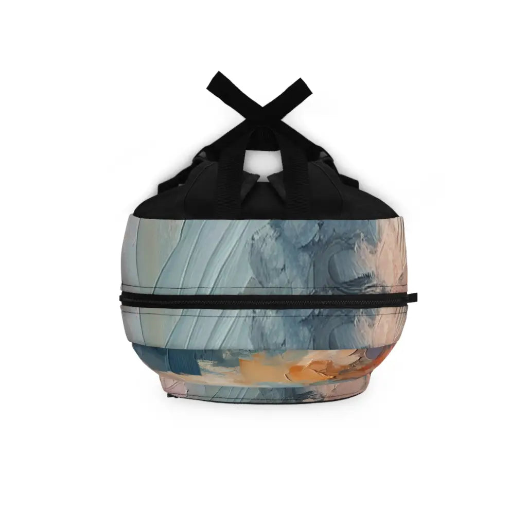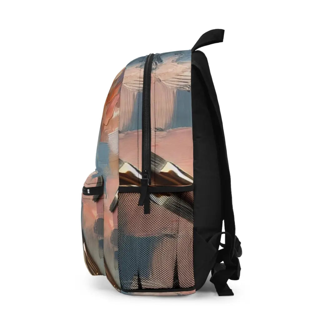 A vibrant palette of swirling colors, paintbrushes, and scattered paint blocks create an abstract masterpiece. The dynamic strokes of blues, pinks, and oranges evoke a sense of creative spontaneity and artistic exploration. Introducing the ultimate backpack for fashion-forward adventurers! Our backpack boasts a striking textile design that will make a statement wherever you go. With its durable construction and spacious compartments, it is perfect for carrying all your essentials. Get ready to turn heads and stay organized with our backpack. #textiledesign #backpack #fashionforward #adventure #durable #spacious #statementpiece #organized #essentials #travel #explore