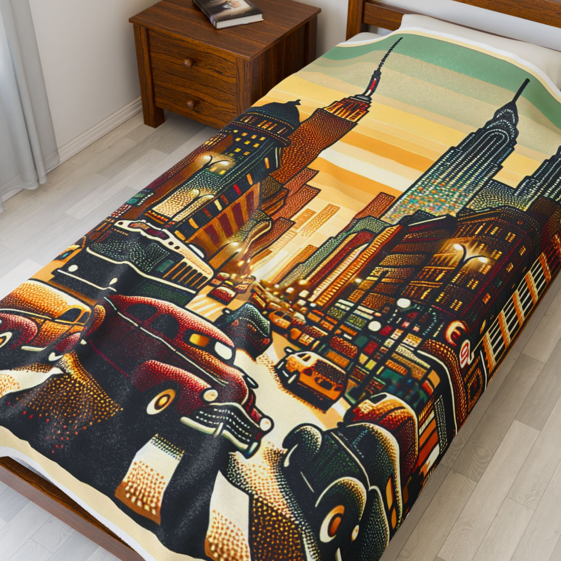 A vibrant cityscape evokes a bustling metropolis with its retro aesthetic, warm colors, and intricate dot patterns. The vintage cars and dynamic skyline enhance its artistic charm, capturing a timeless urban spirit. Create a cozy and warm atmosphere at home with this plush velveteen blanket. It is soft to touch and perfect for any home. Customize with a one-sided print to add your personal touch or create a gift for your friends and family. Available in three sizes: 30x40", 50x60", 60x80".