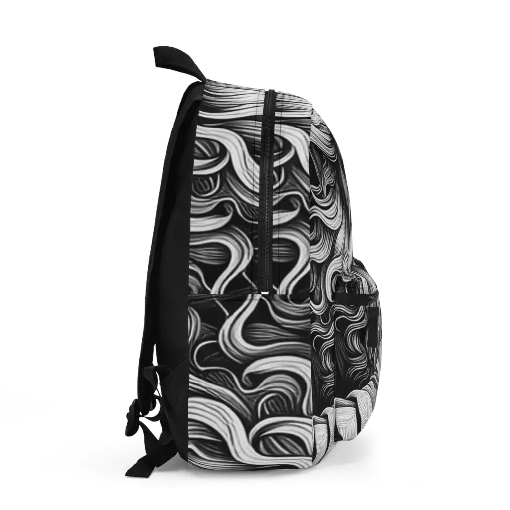 Ethereal and intricate, the black-and-white illustration portrays a mystical sage orchestrating cosmic geometry. Swirling hair parallels celestial orbits, while his hands manipulate complex patterns of spheres and cubes, creating a visual symphony of science and mysticism. Introducing the ultimate backpack for fashion-forward adventurers! Our backpack boasts a striking textile design that will make a statement wherever you go. With its durable construction and spacious compartments, it is perfect for carrying all your essentials. Get ready to turn heads and stay organized with our backpack. #textiledesign #backpack #fashionforward #adventure #durable #spacious #statementpiece #organized #essentials #travel #explore